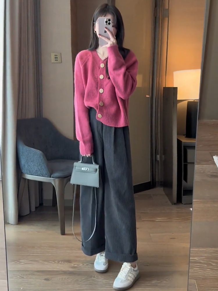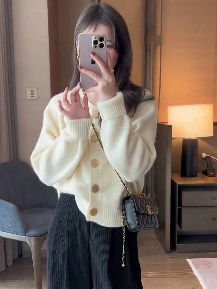 한국 스타일 심플 스타일 핑크 밀크 푸푸 니트 카디건 여성의 가을과 겨울 새로운 디자인 감각 틈새 싱글 브레스트 스웨터스토어 가기