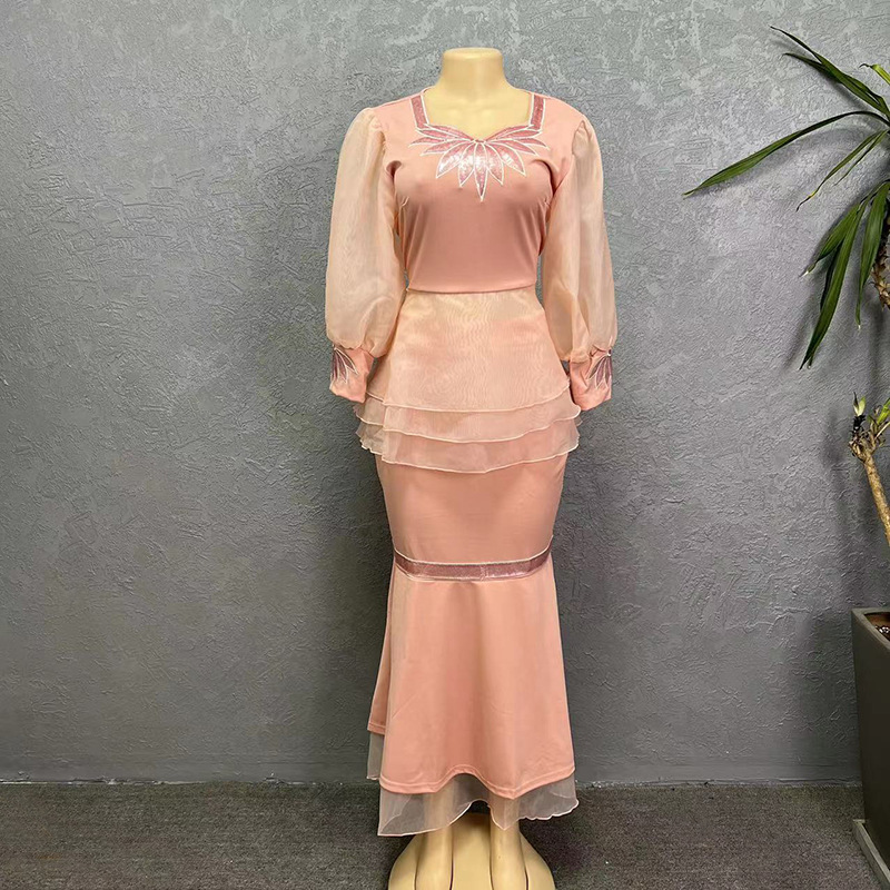 국경 간 소싱 아프리카 여성의 연꽃 잎 organza 버블 슬리브 탑 스커트 자수 스팽글 세트스토어 가기