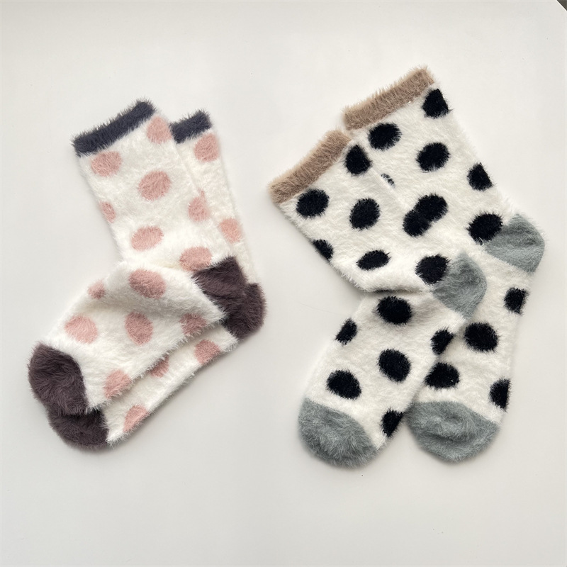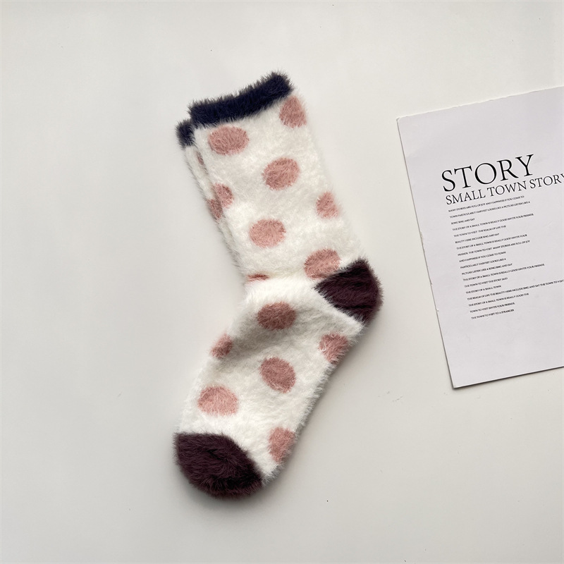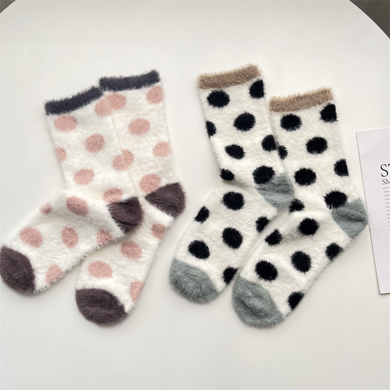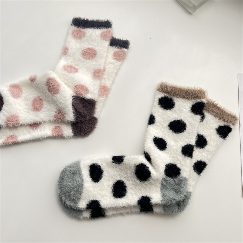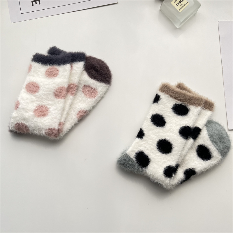 가을과 겨울 새로운 부드러운 왁스 플러시 따뜻한 양말 여자의 일본 물방울 무늬 수면 양말 색상 접합 바닥 양말 귀여운 달 양말