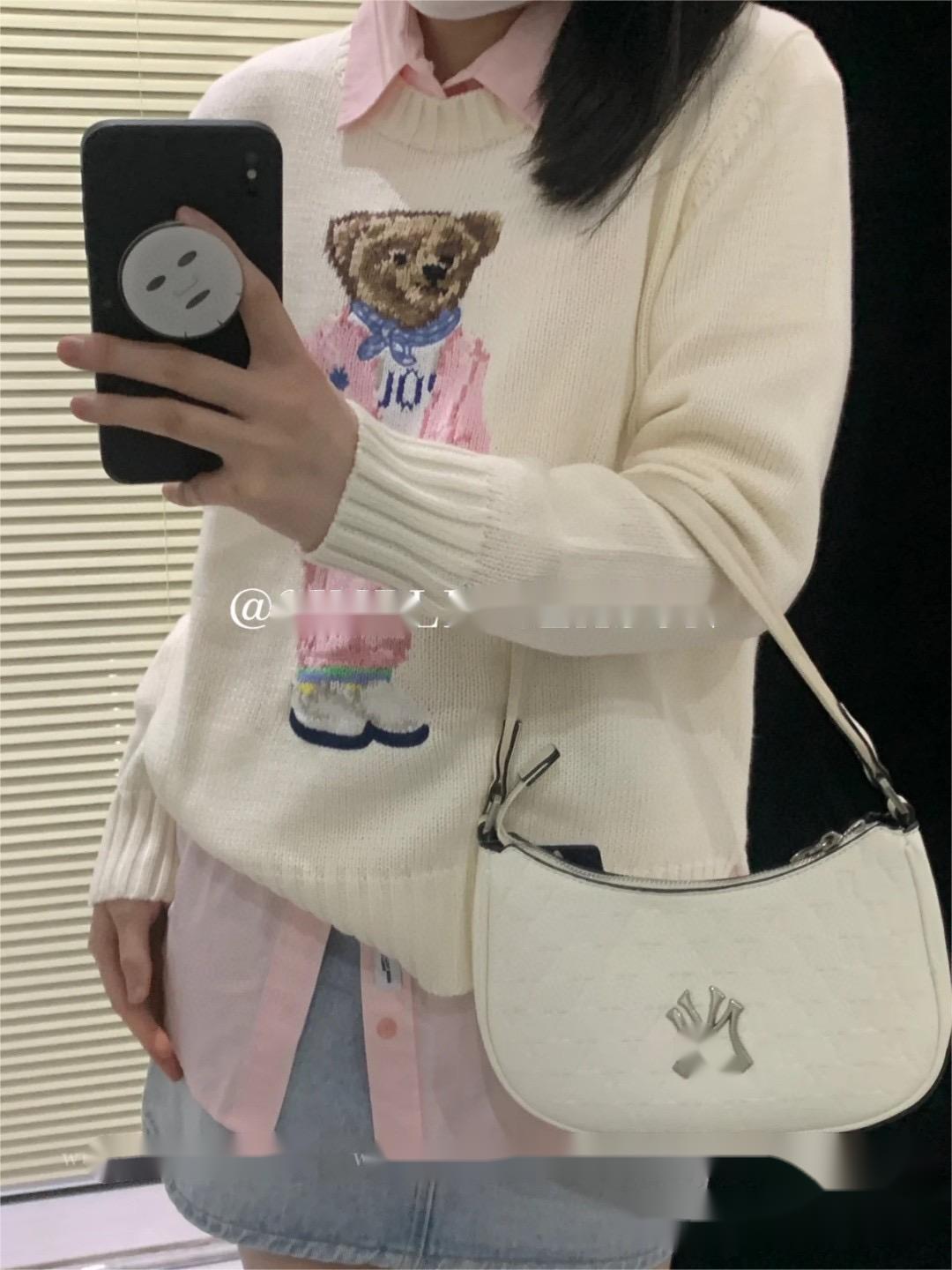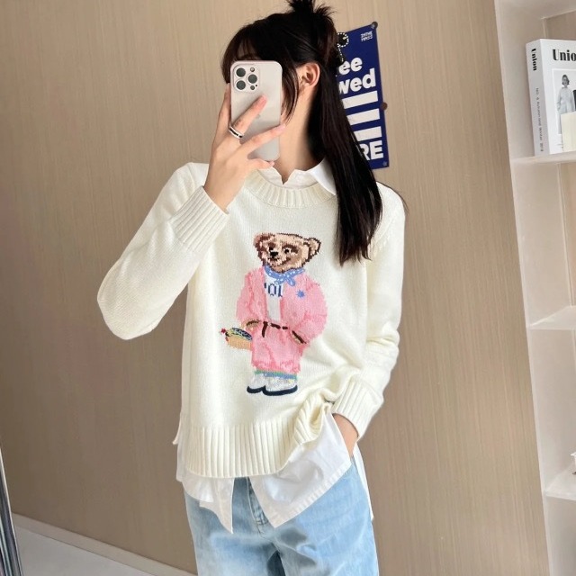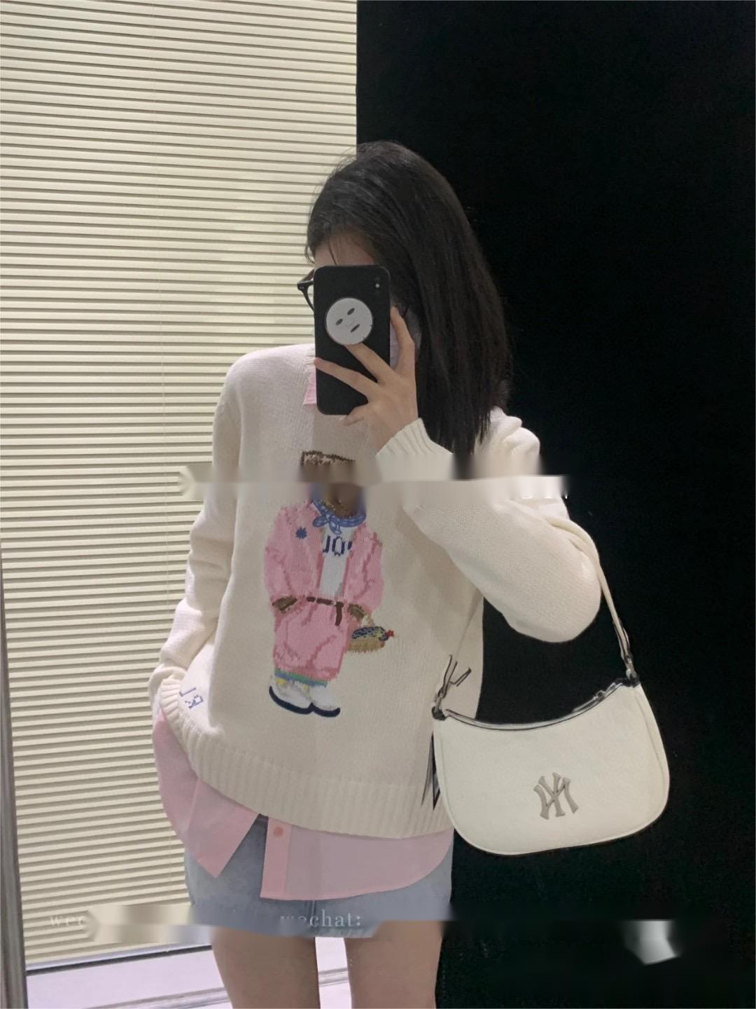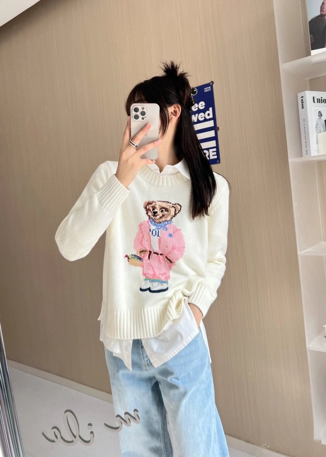 正面饰有带刺绣的嵌花编织 Polo 小熊图案,左侧下摆饰有 R字样十字绣