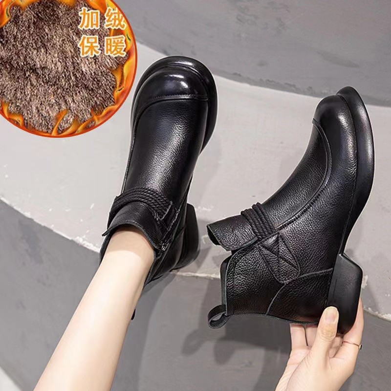 크로스 보더 레트로 에스닉 스타일 마틴 부츠 여성용 겨울 기모 여성 신발 미드 힐 두꺼운 밑창 부드러운 가죽 엄마 부츠스토어 가기