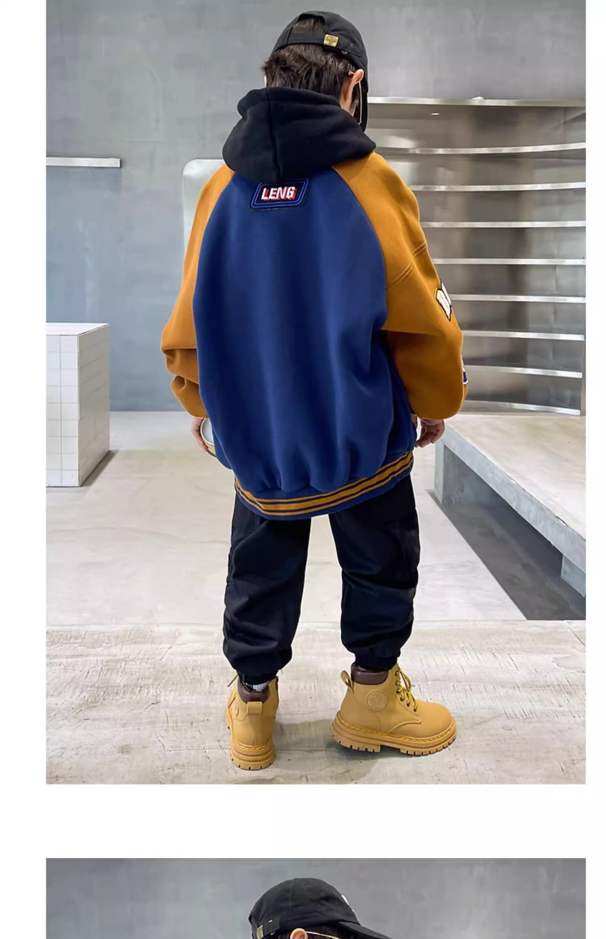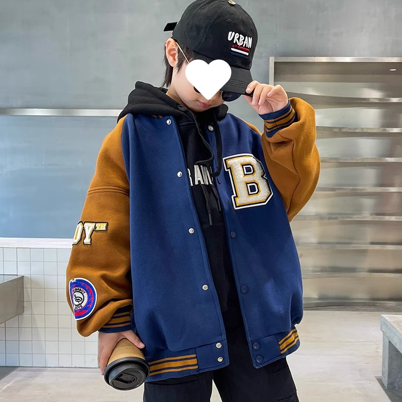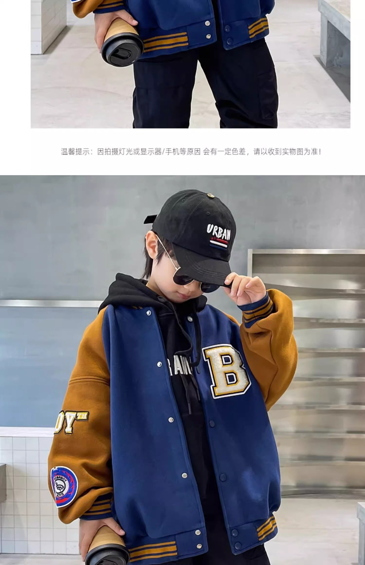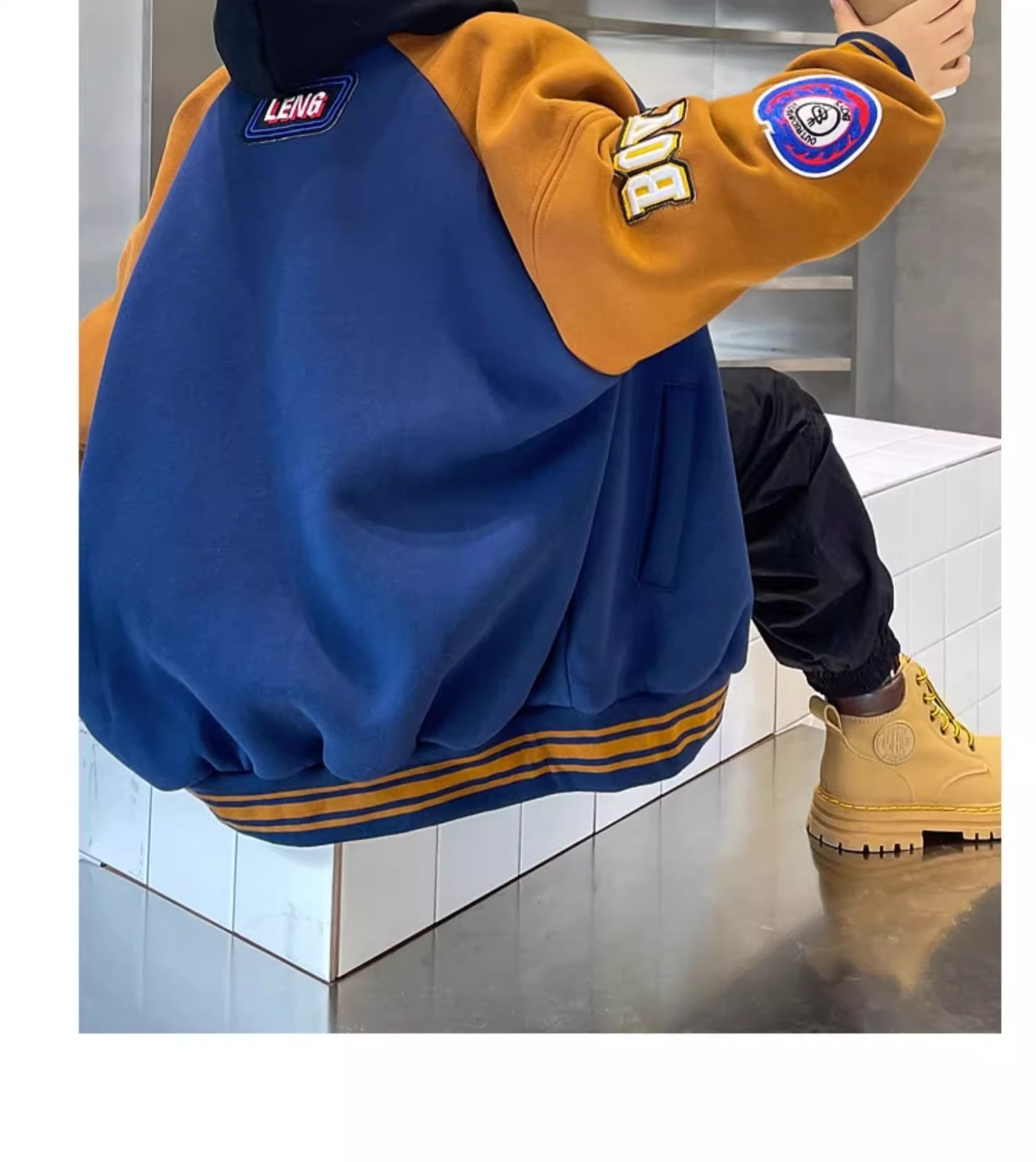남아 겨울웨어 기모 재킷 2023 새로운 중형 어린이 컬러 블록 편지 자수 두꺼운 야구 세트 한국 가디건스토어 가기