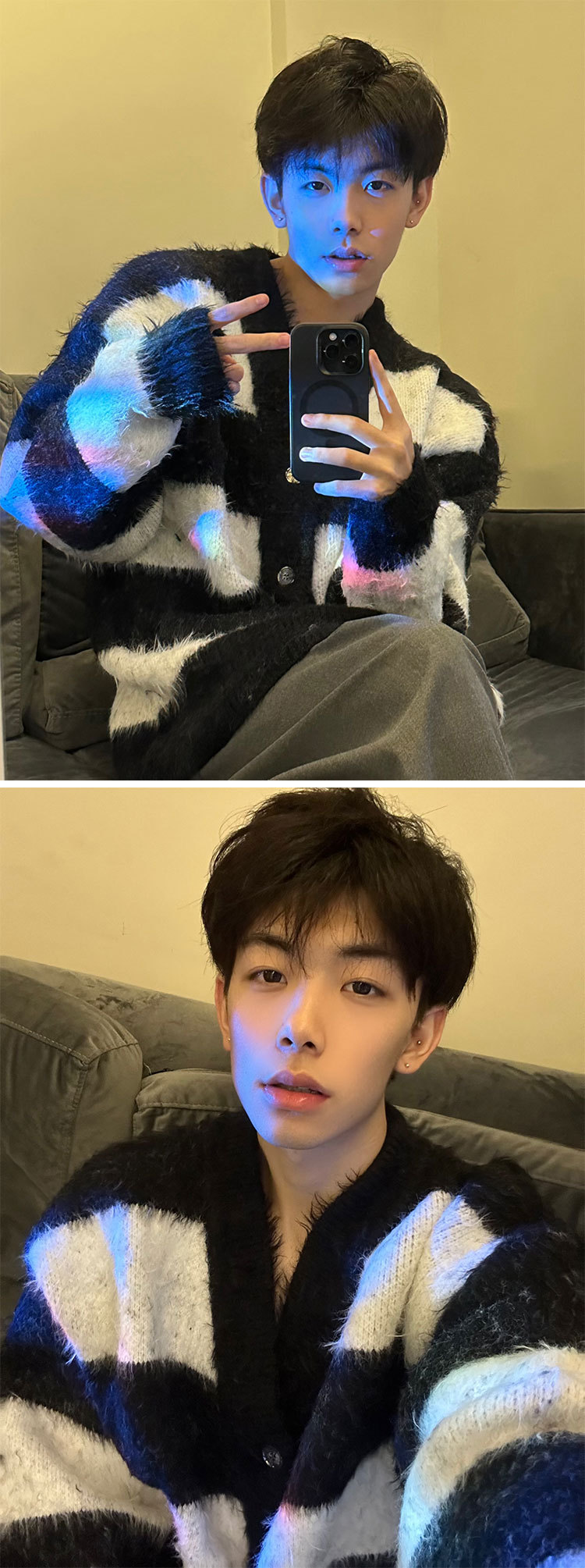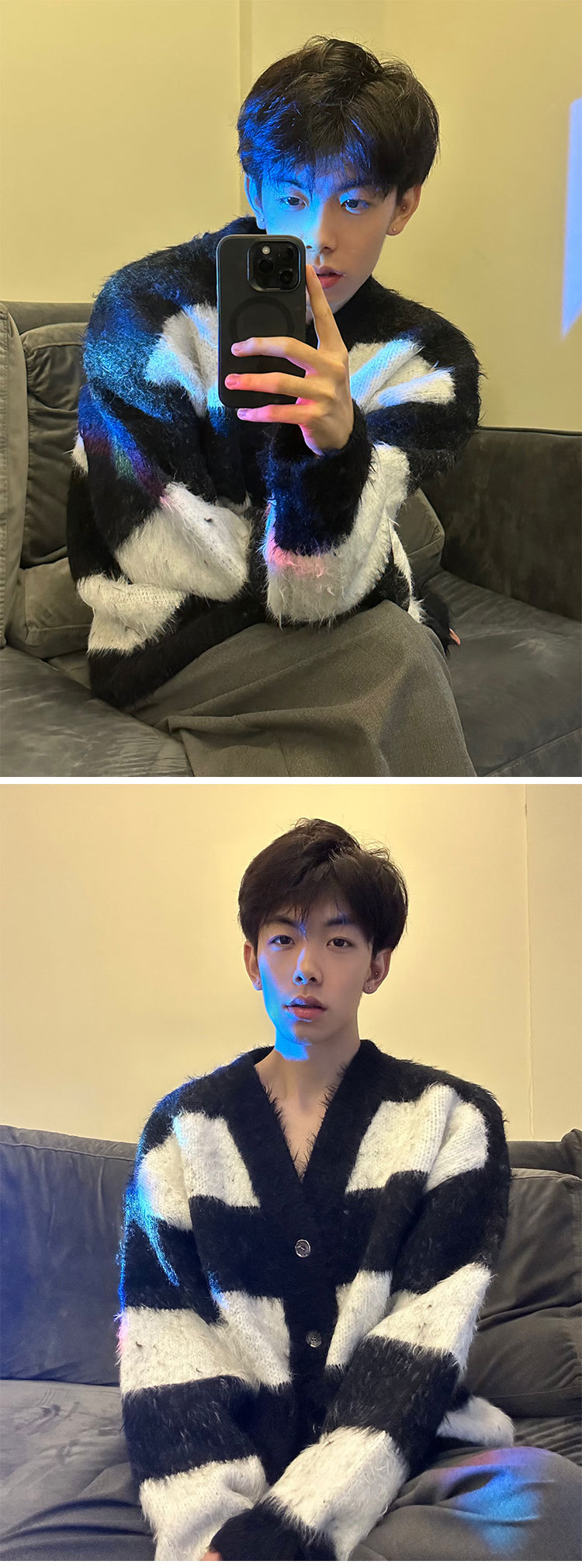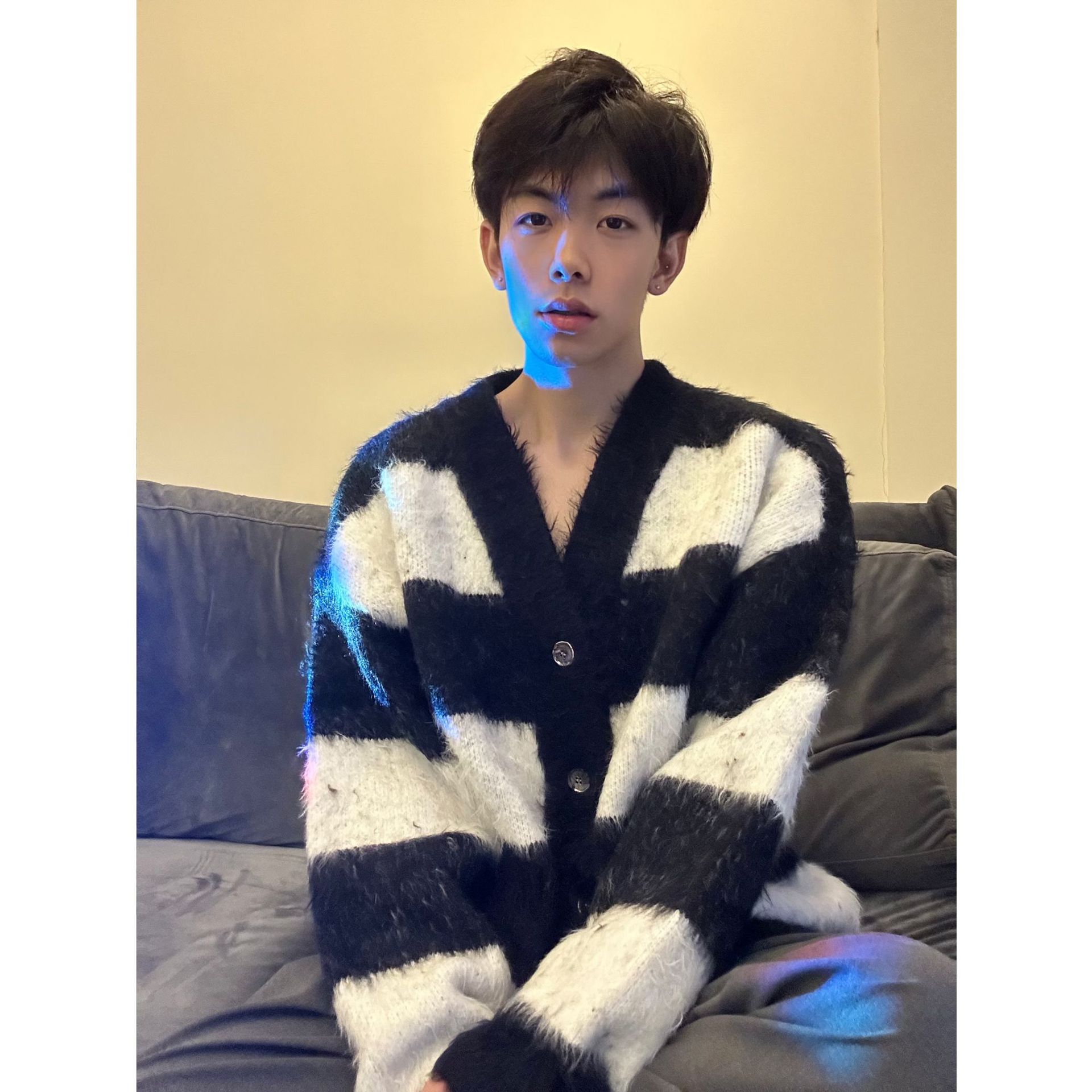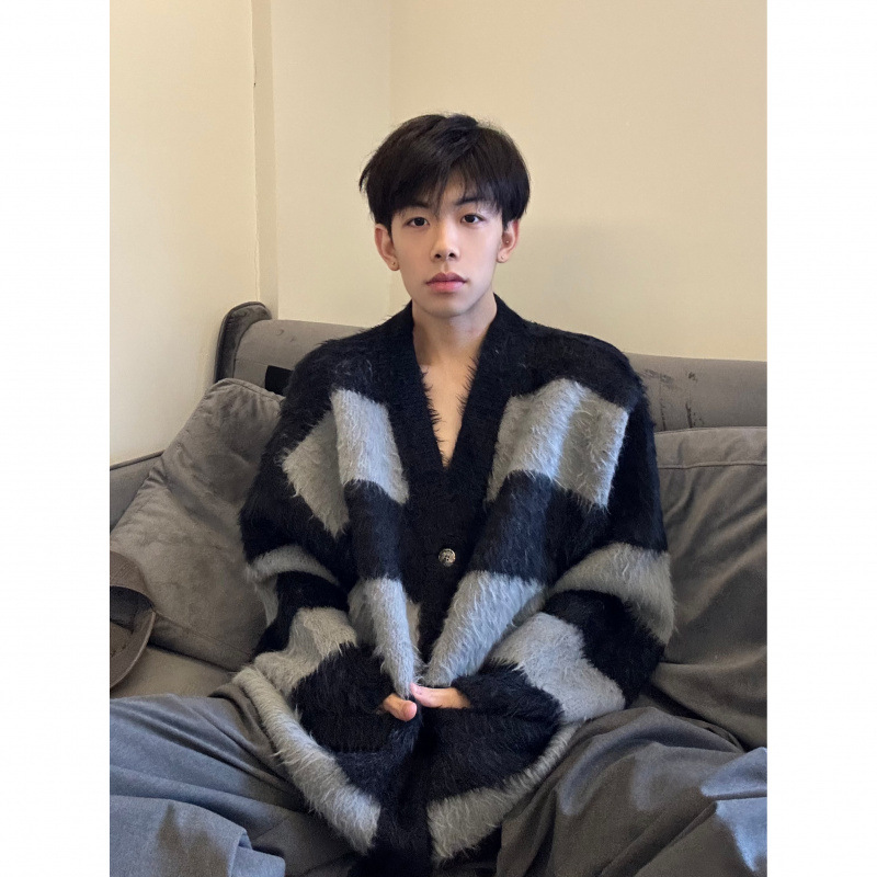 스트라이프 대비 카디건 스웨터 남자의 가을과 겨울 새로운 유행 느슨한 게으른 일본 복고풍 V-넥 스웨터 재킷스토어 가기