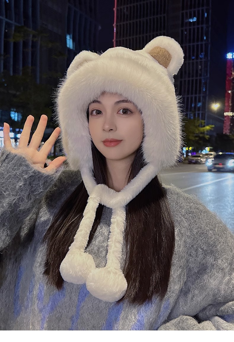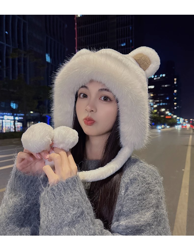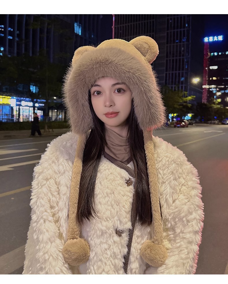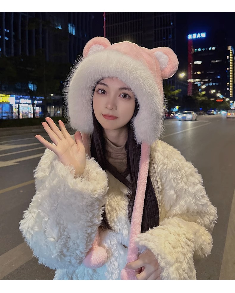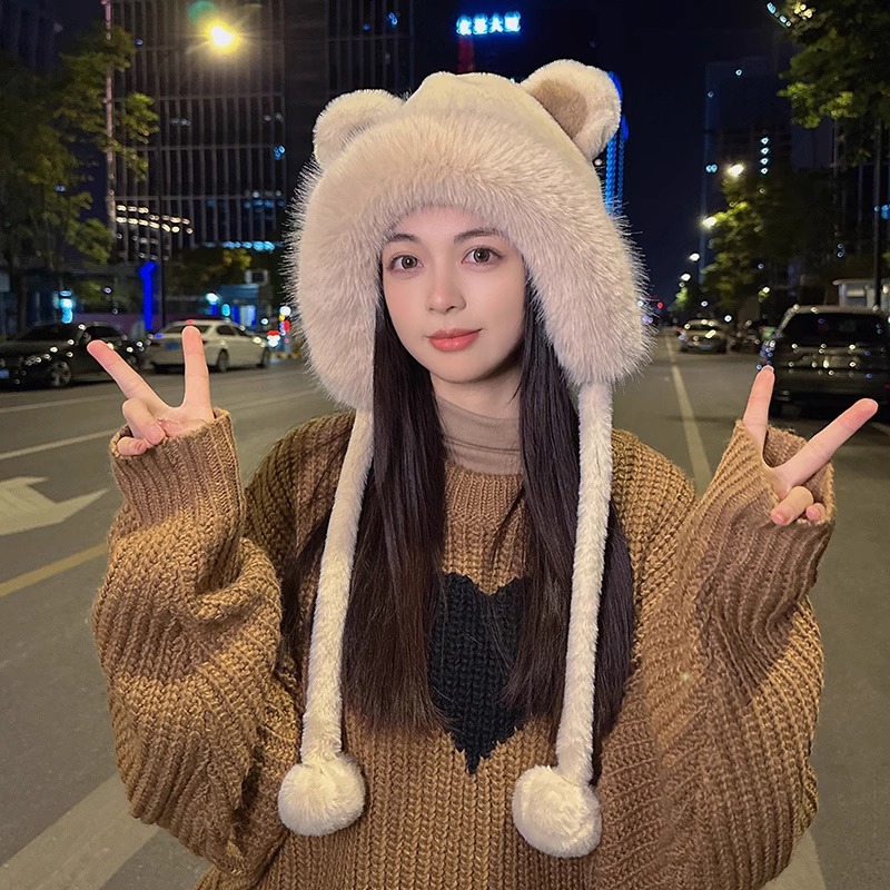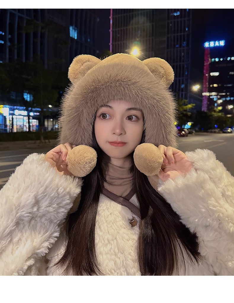 한국 스타일 귀여운 레이 펑 모자 여자의 가을과 겨울 곰 귀 푹신한 모자 기모 두꺼운 승마 감기 방지 귀 보호 모자