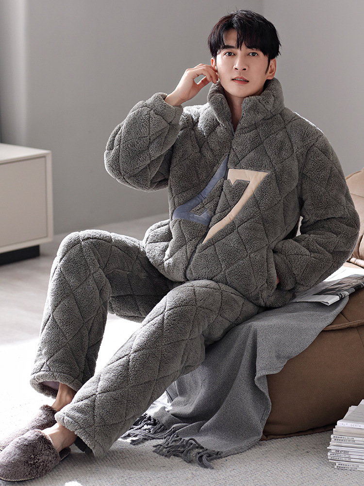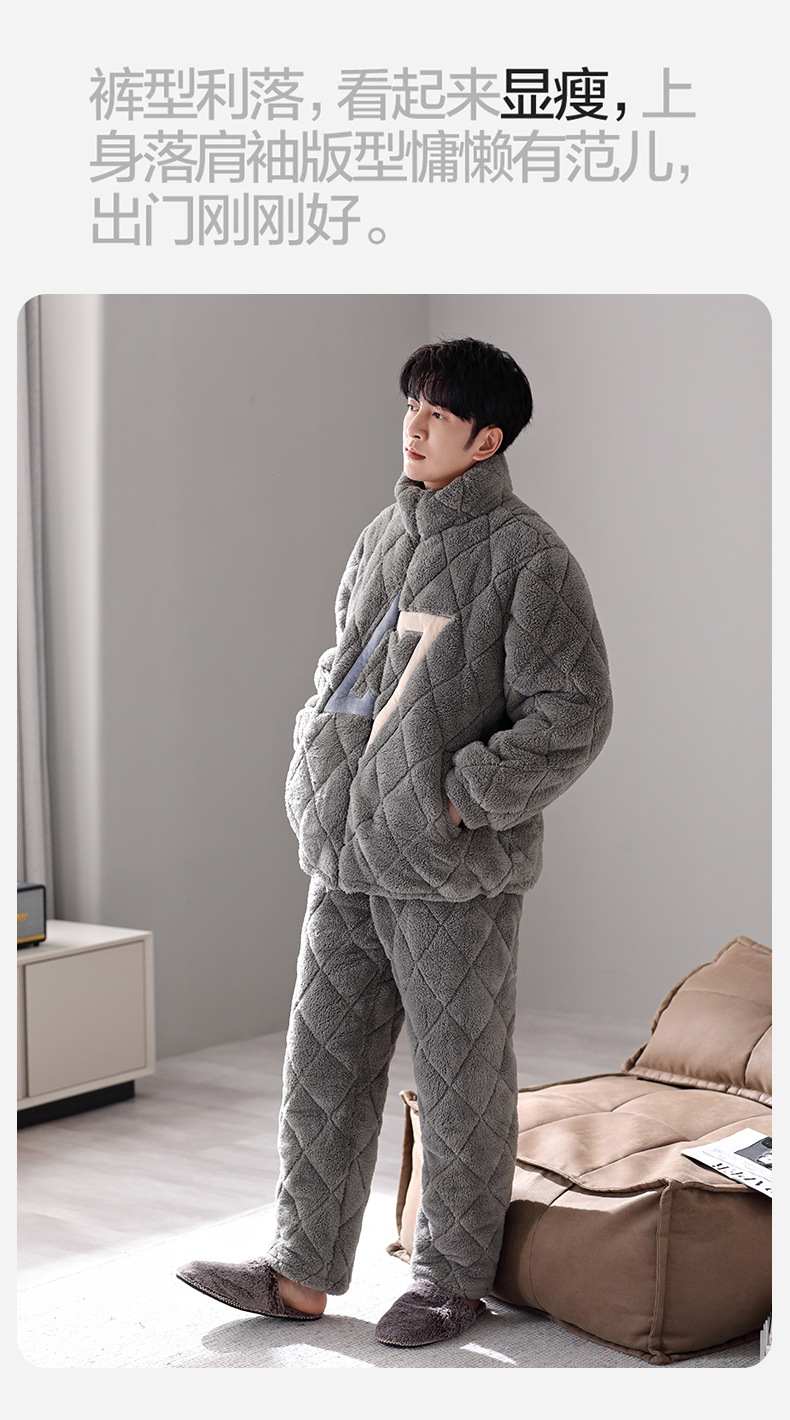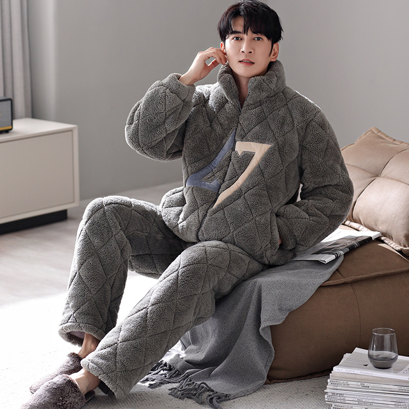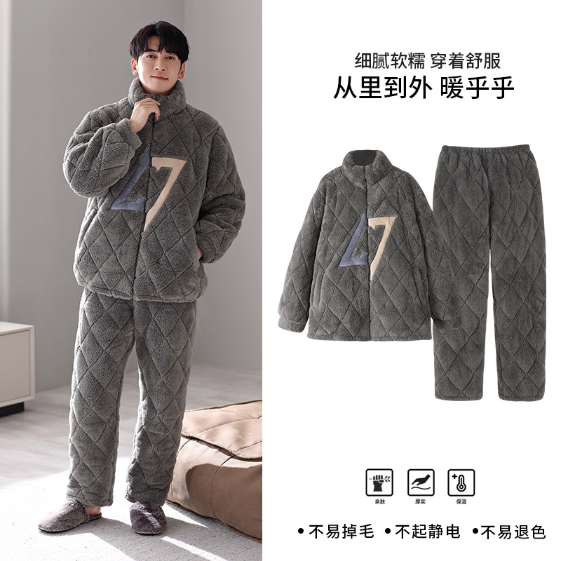 겨울 새로운 남자의 플란넬 3 층 누비 이불 잠옷 따뜻한 플러스 사이즈 두꺼운 긴팔 캐주얼 가정 의류 세트
