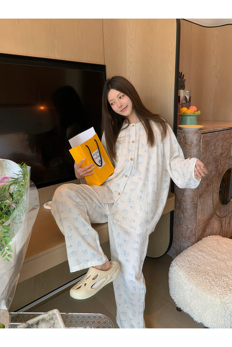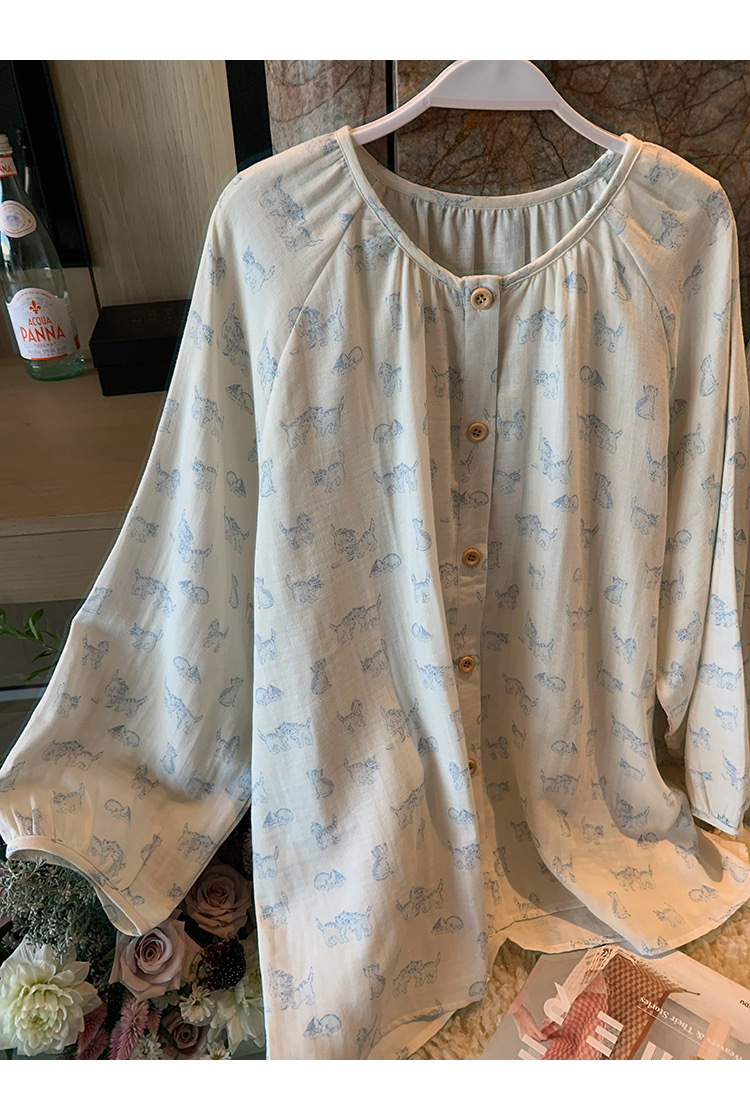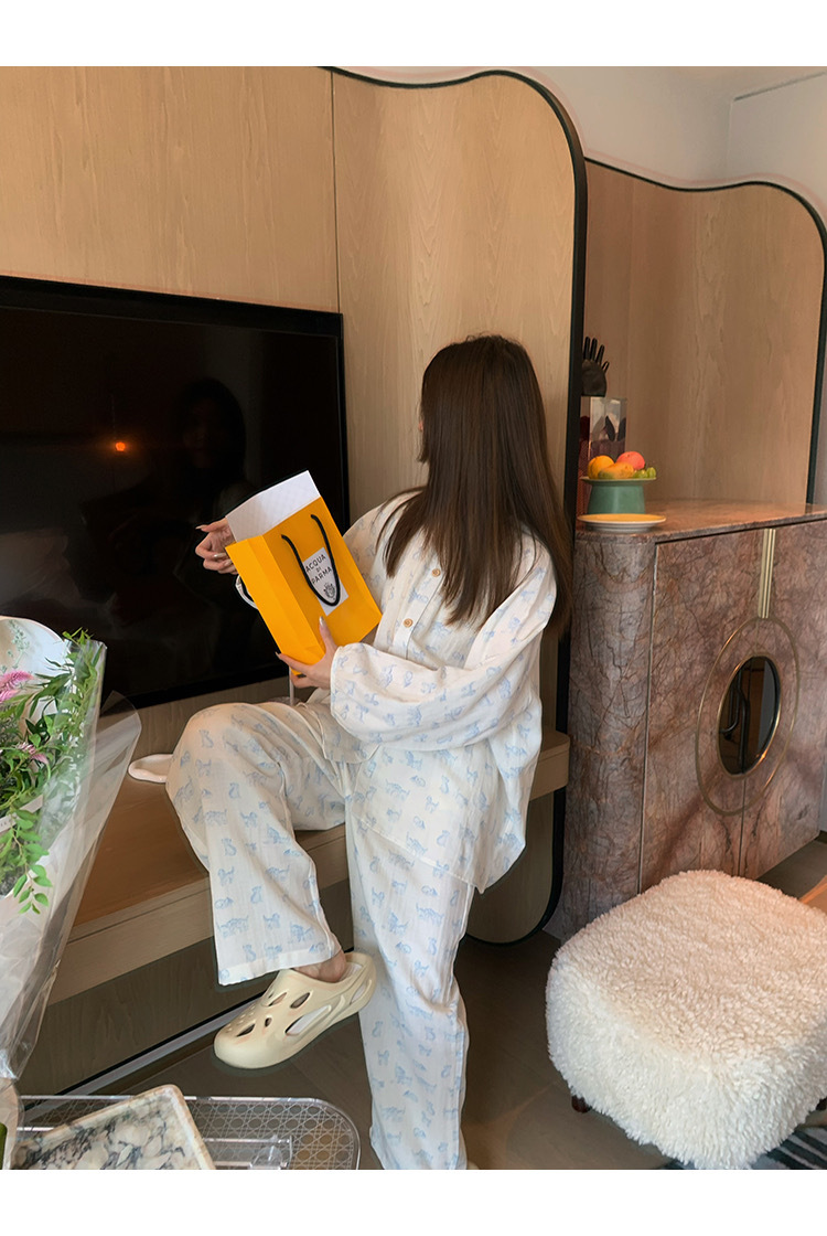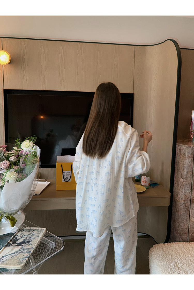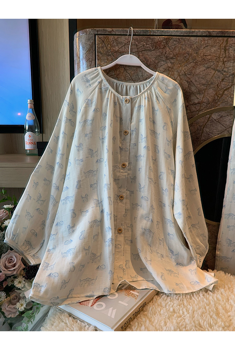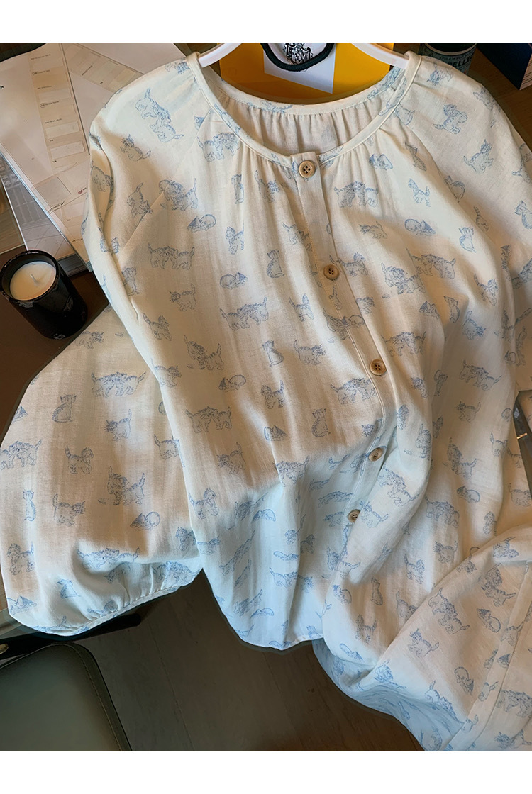 코튼 더블 거즈 스케치 고양이 느슨한 한국식 홈 의류 잠옷 세트