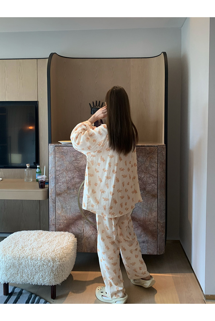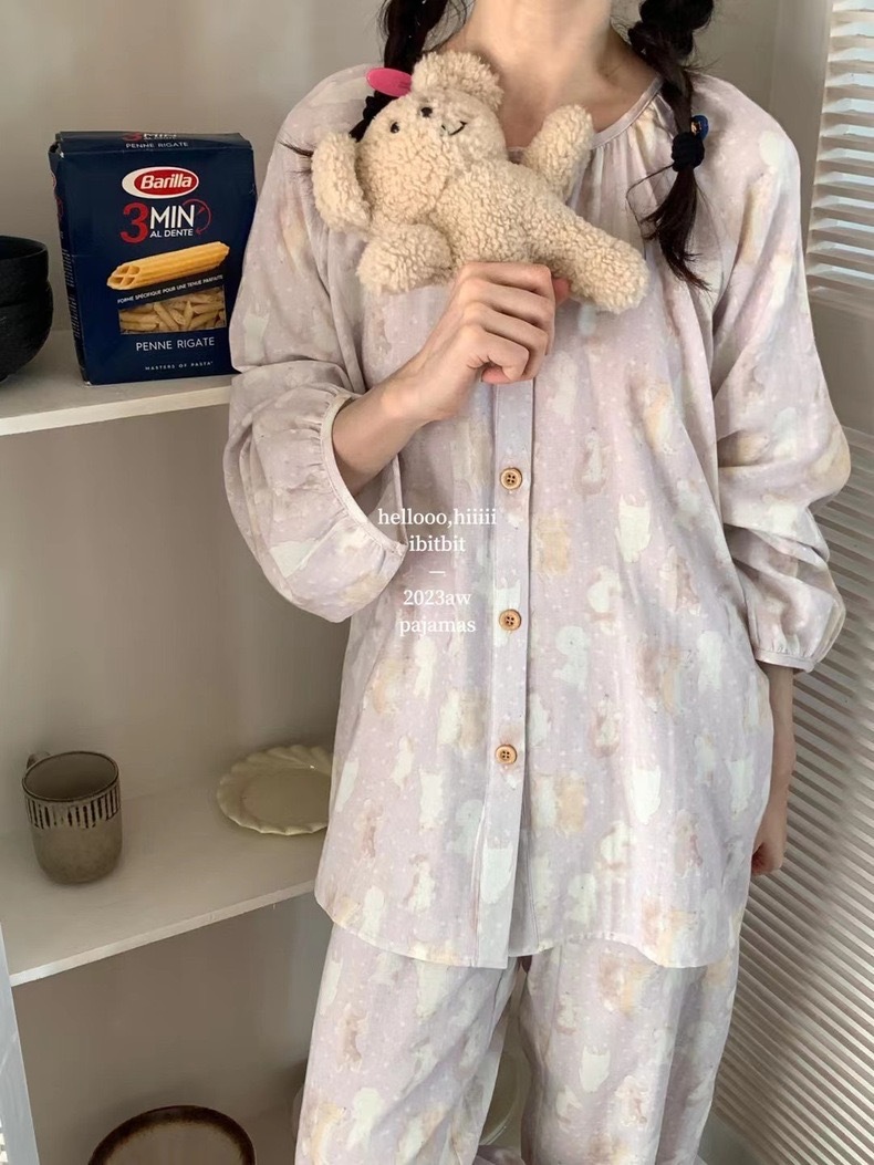 코튼 더블 거즈 스케치 고양이 느슨한 한국식 홈 의류 잠옷 세트스토어 가기