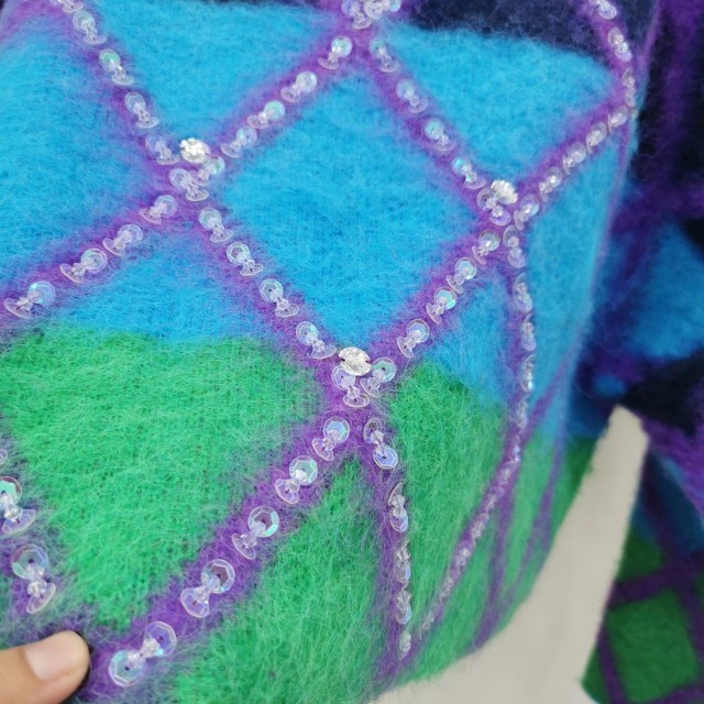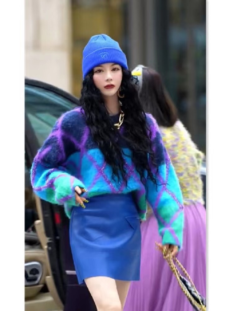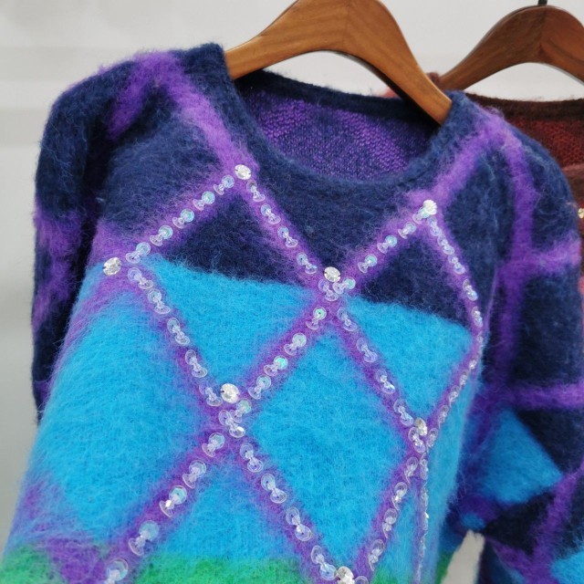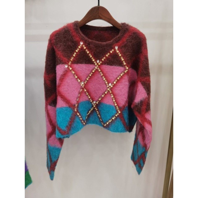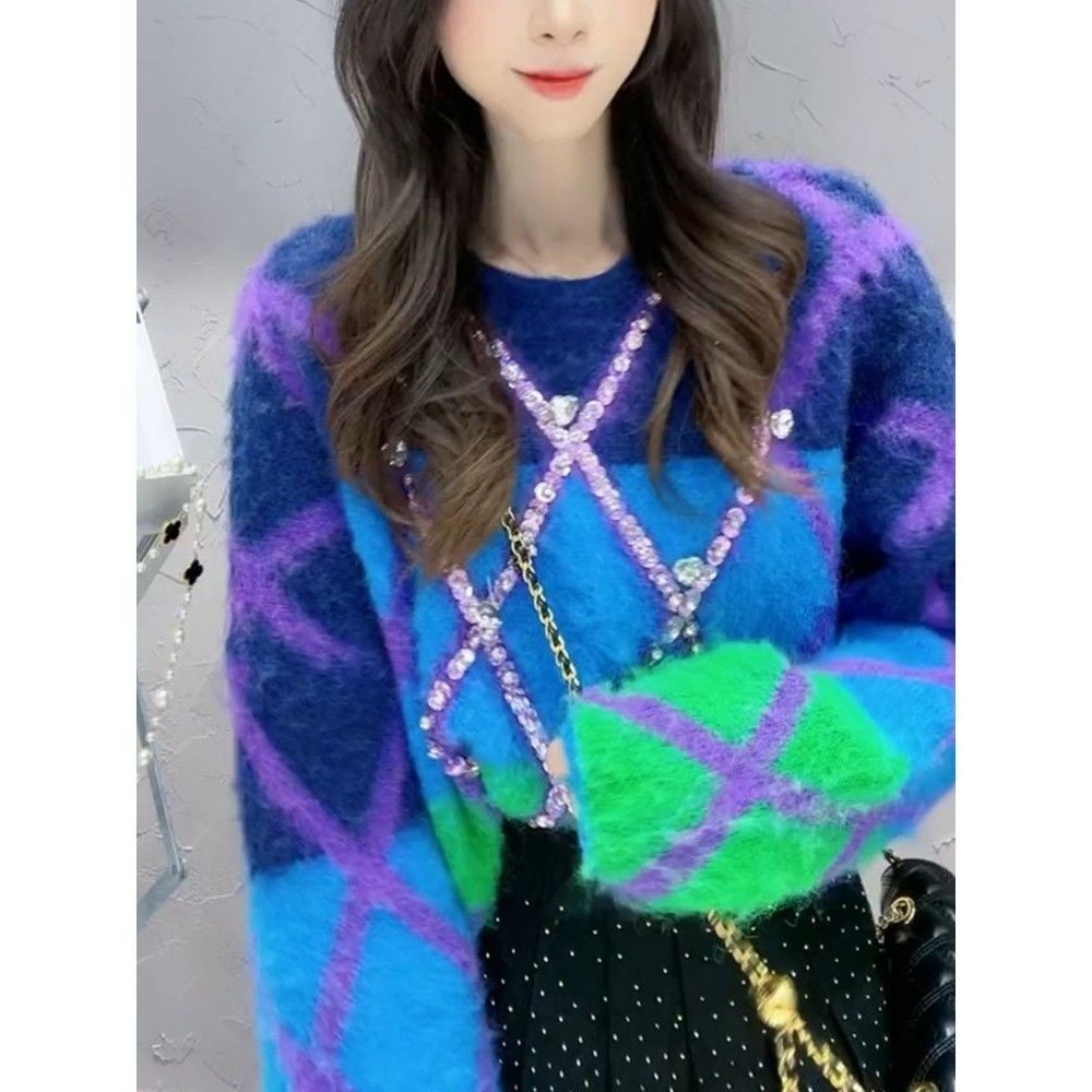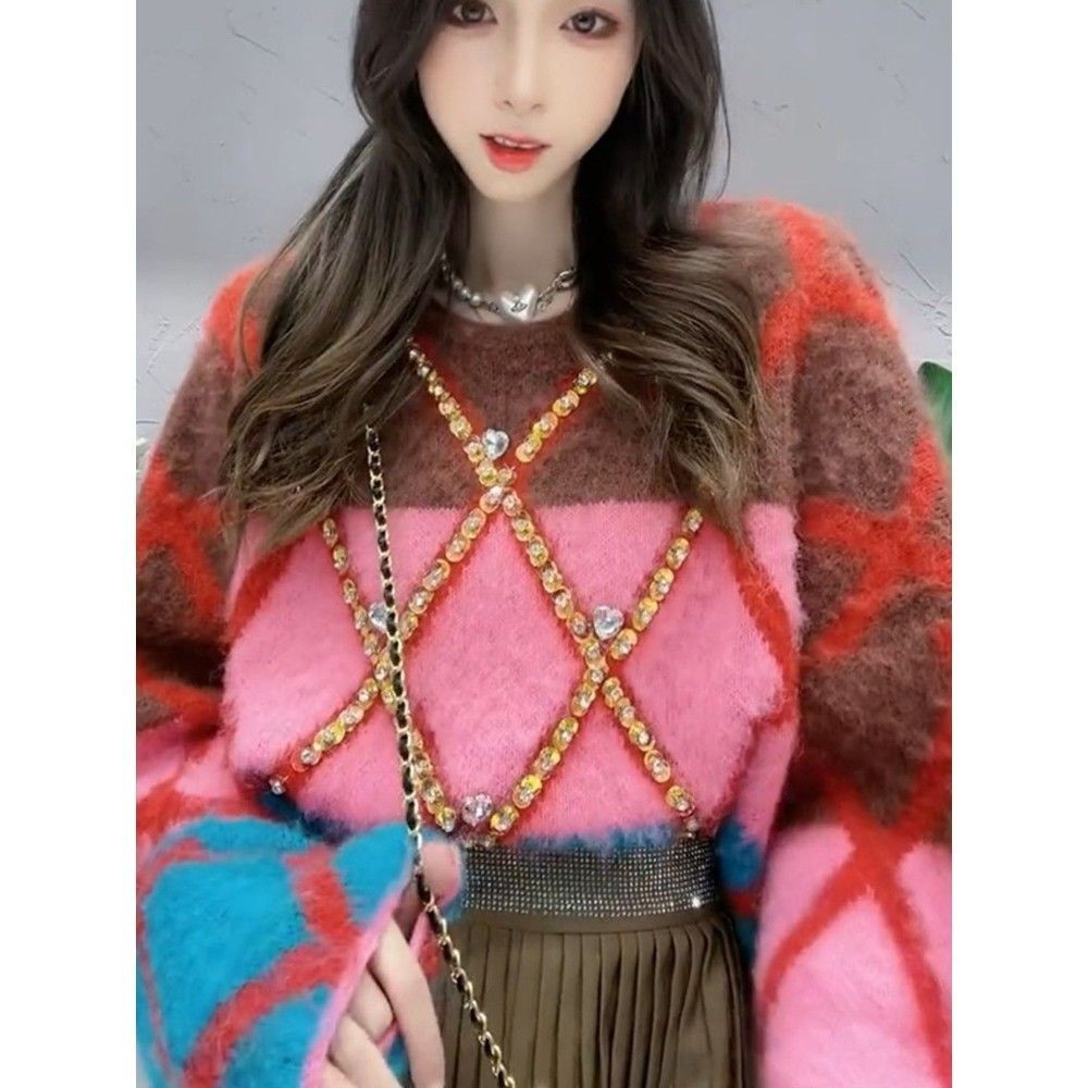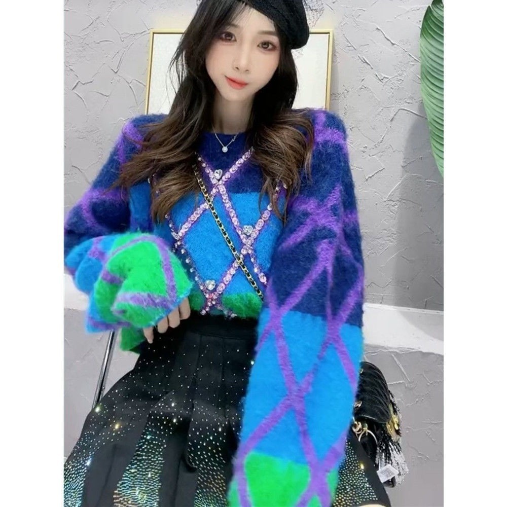 컬러 매칭 다이아몬드 격자 무늬 스웨터 여성의 가을과 겨울 새로운 디자인 센스 다이아몬드 박힌 페르시 틈새 세련된 짧은 게으른 스타일 탑스토어 가기