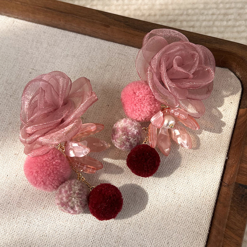 빈샤 파우더 베고니아 메쉬 꽃 헤어 볼 귀걸이 가을과 겨울 귀걸이 틈새 디자인 부드러운 기질 귀걸이