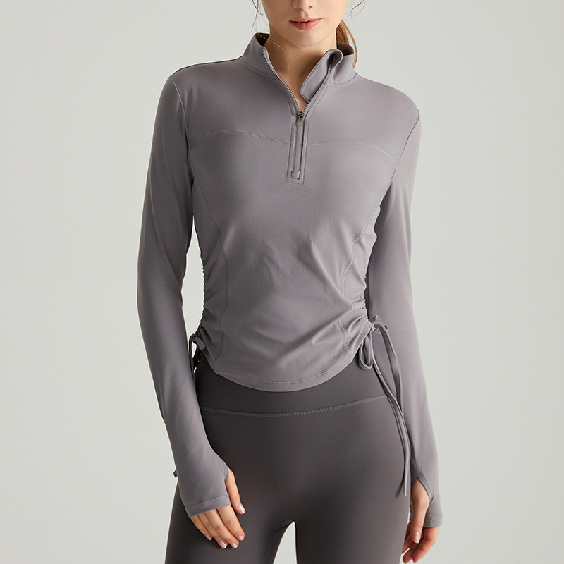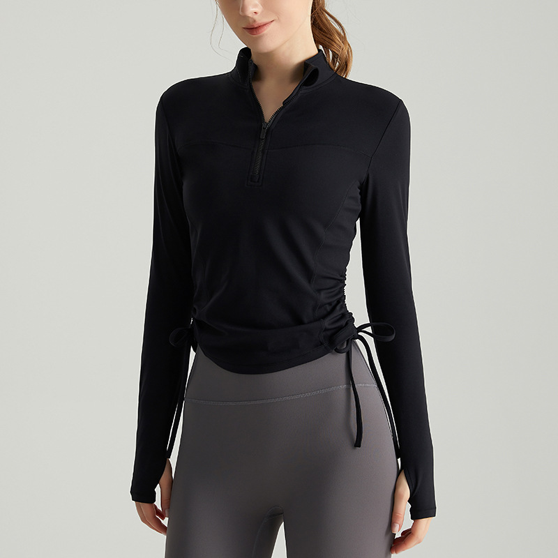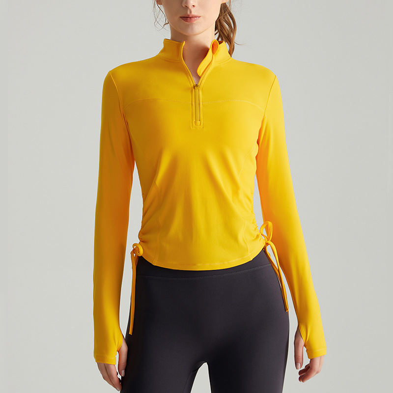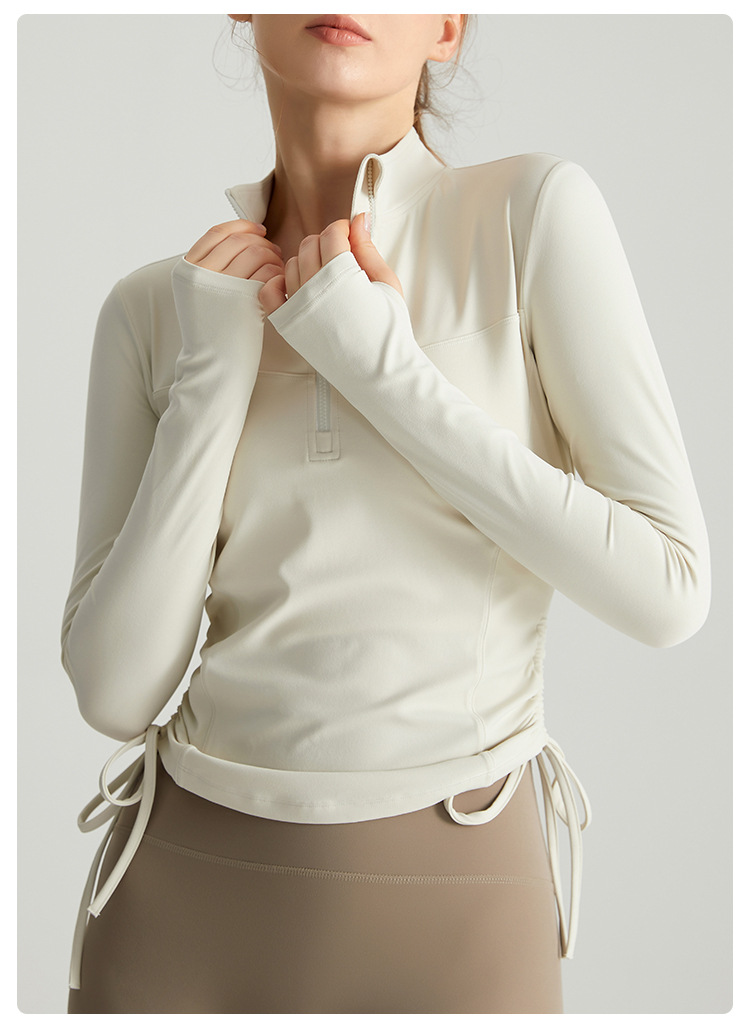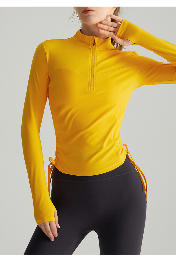 여성용 Chuanton 긴팔 피트니스 탑, 하프 지퍼, 스탠드 칼라, 드로스트링, 주름, 슬림핏, 아우터웨어, 스포츠 요가복