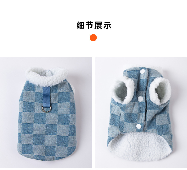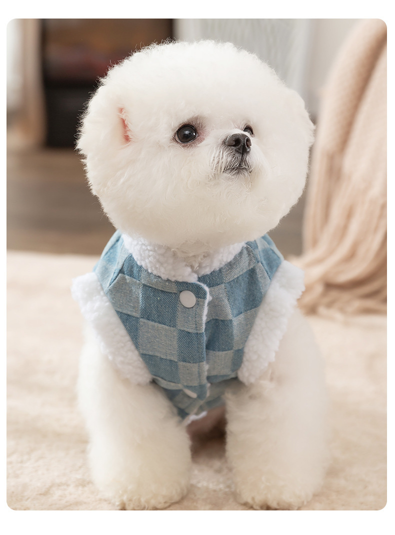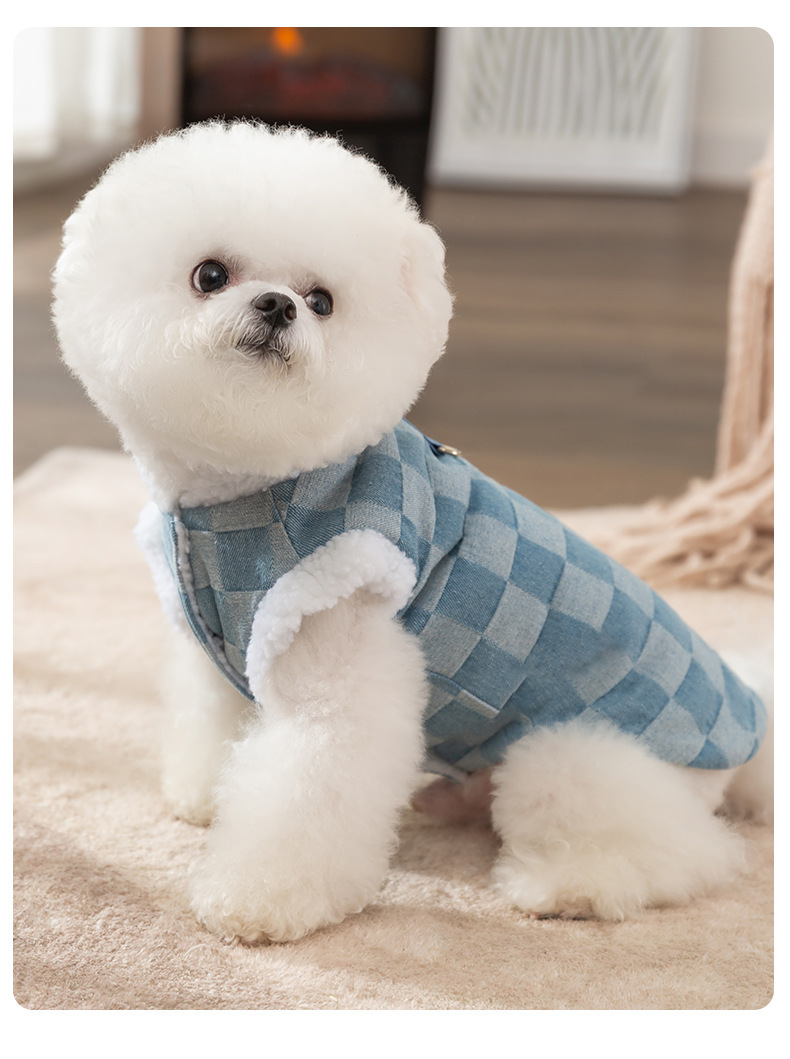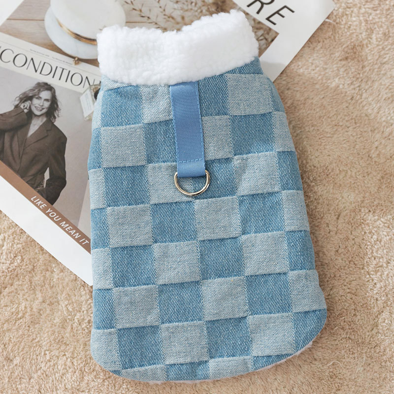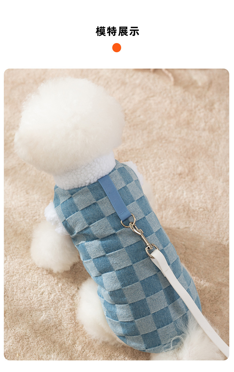 가을과 겨울 개 바둑판 데님 조끼 면 패딩 애완 동물 두꺼운 따뜻한 견인 캐주얼 스타일 고양이 옷스토어 가기
