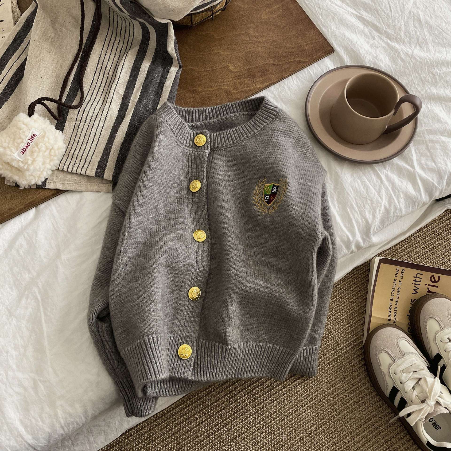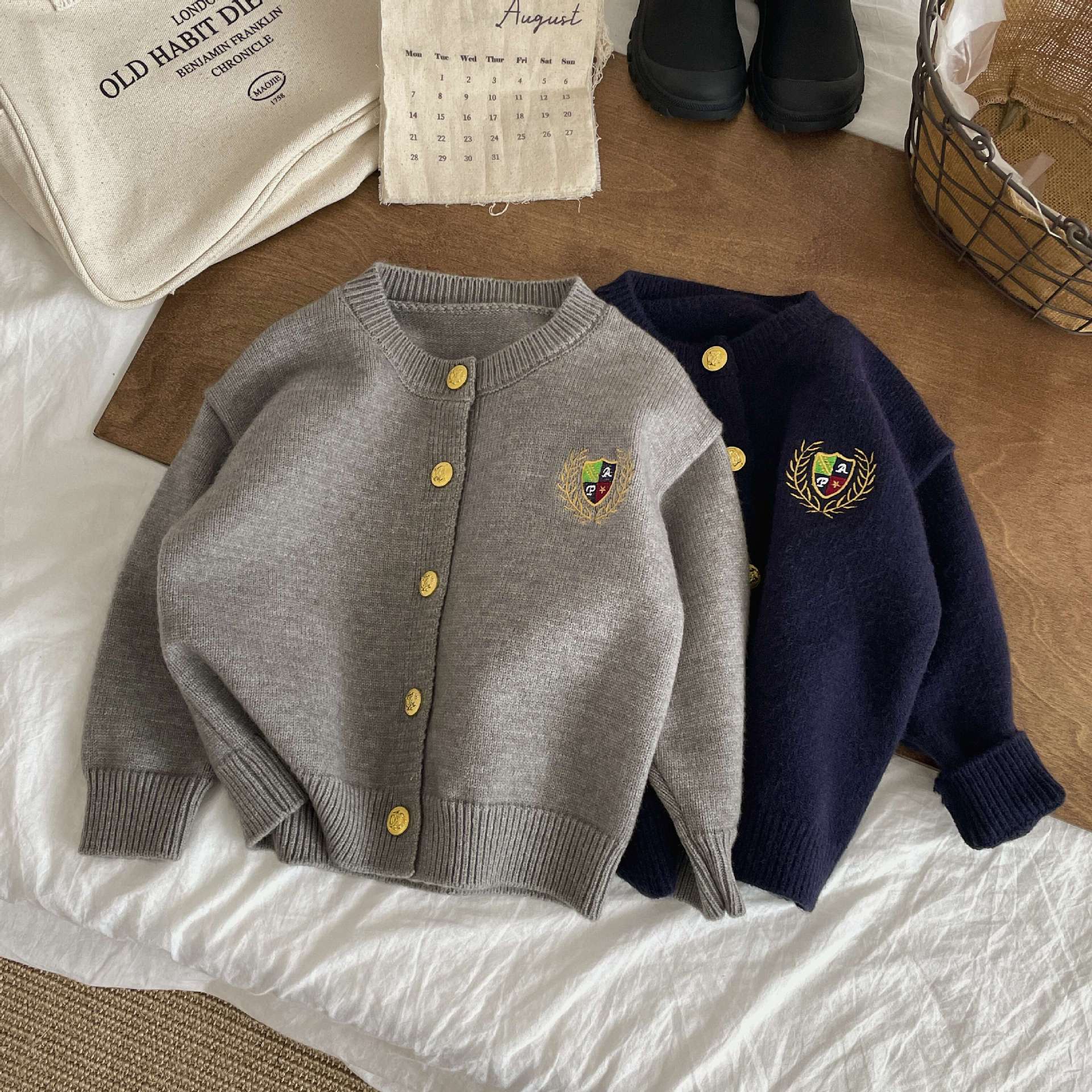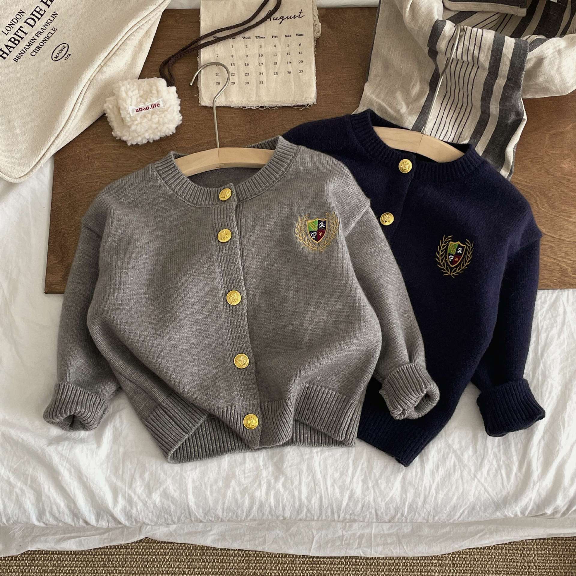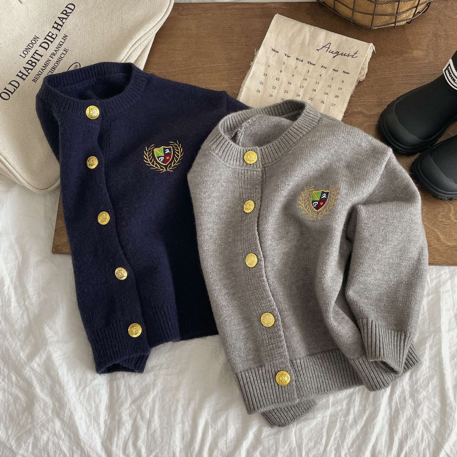 아동용 스웨터 카디건 2025 가을, 겨울 새로운 스타일 대학 스타일 카디건 탑 소년과 소녀를위한 자수 솔리드 컬러 다용도 자켓