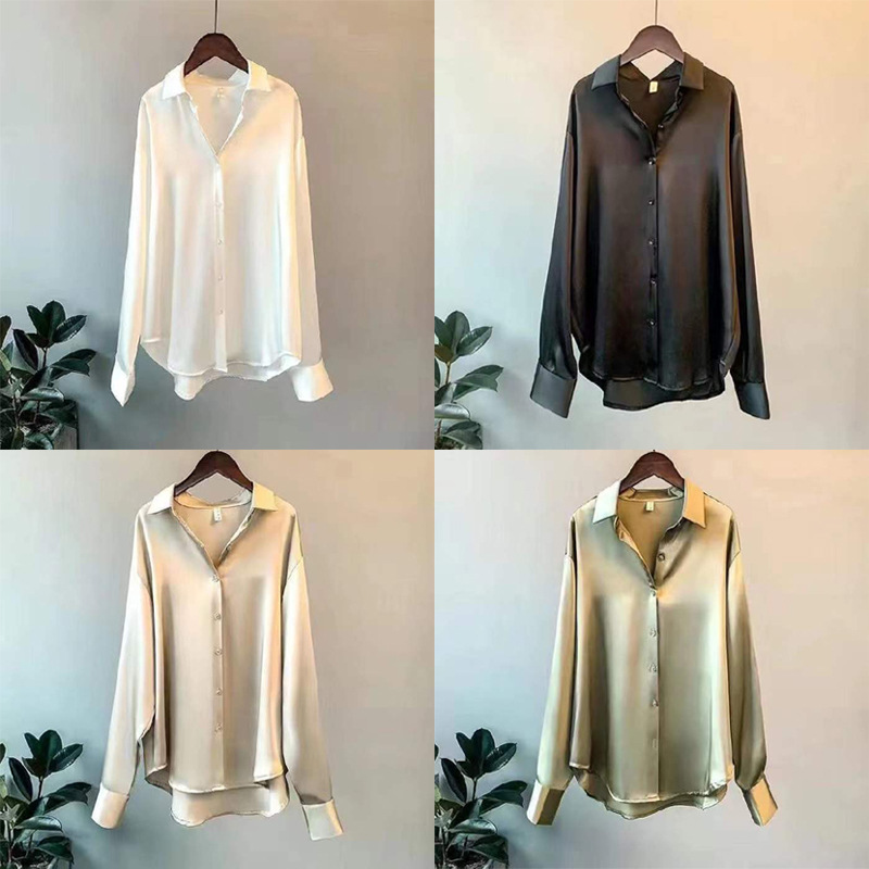 새로운 새틴 셔츠 여성의 봄 홍콩 스타일 디자인 틈새 탑 긴 소매 새틴 드레이핑 웨스턴 스타일 셔츠스토어 가기