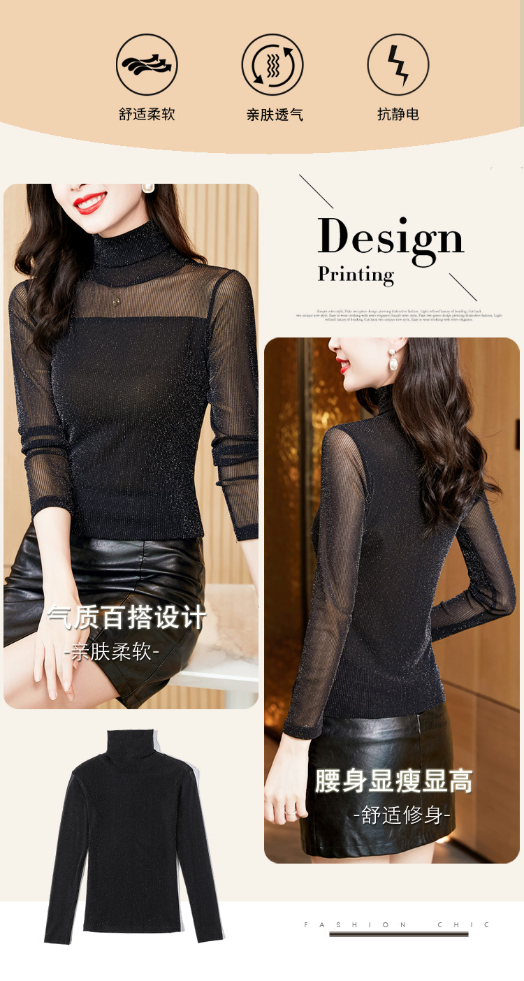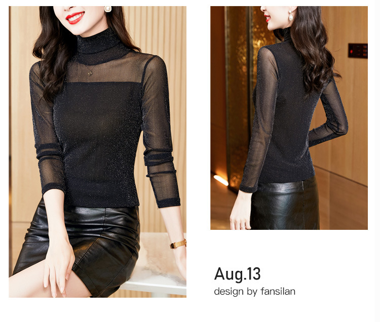 2023 가을 겨울 새로운 하이 칼라 심플 올매치 슬림핏 슬리밍 티셔츠 여성용 블랙 브라이트 실크 긴팔 메쉬 베이스 셔츠스토어 가기