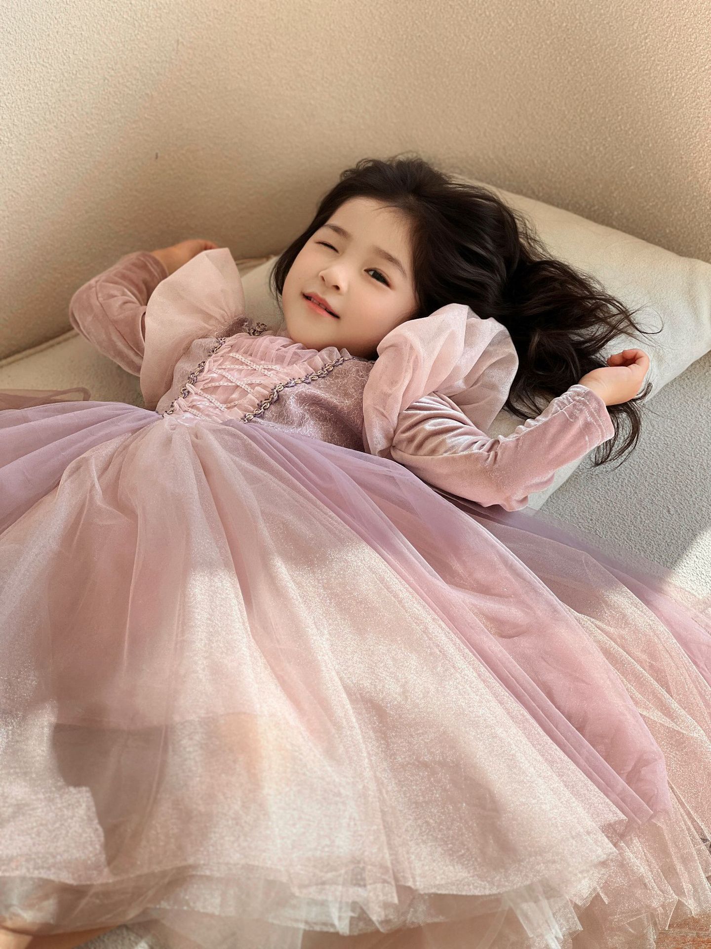 하이 엔드 긴 머리 르 페이 공주 가을과 겨울 벨벳 스커트 어린 소녀 드레스 퍼프 슬리브 생일 드레스 스커트스토어 가기