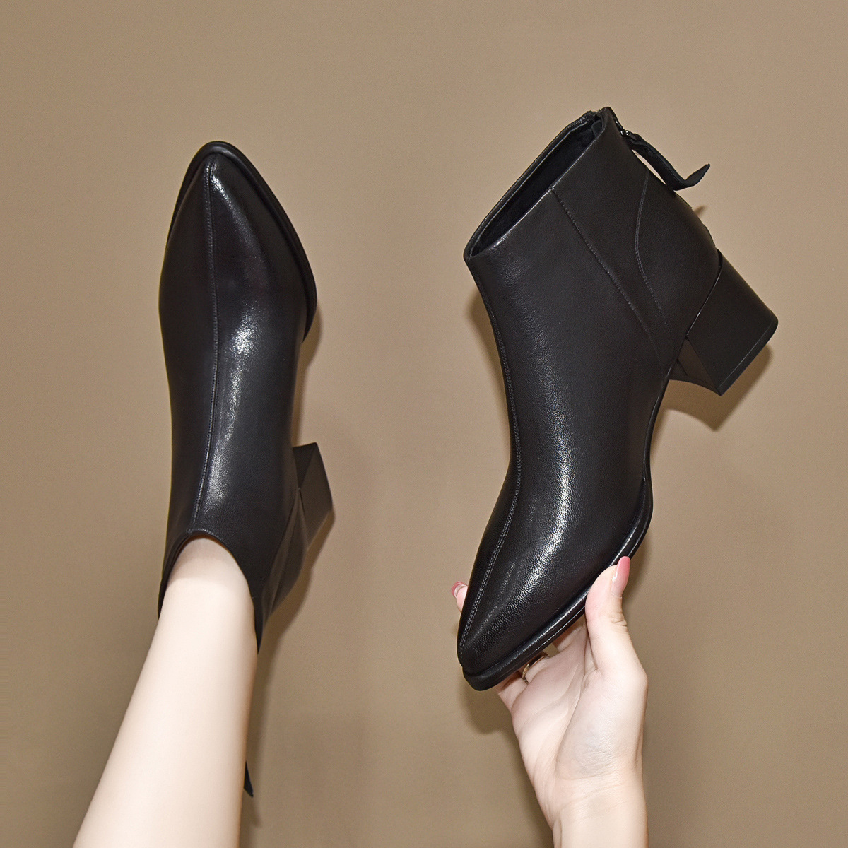 뾰족한 작은 짧은 부츠 여성 가을과 겨울 2023 탑 레이어 양가죽 후면 지퍼 두꺼운 뒤꿈치 발목 부츠 유럽과 미국 스타일 우아한 패션 부츠스토어 가기