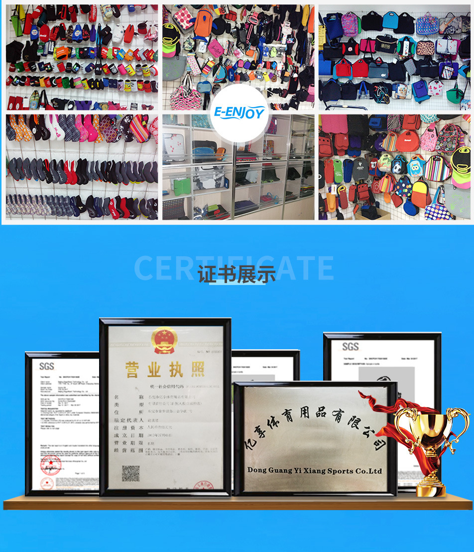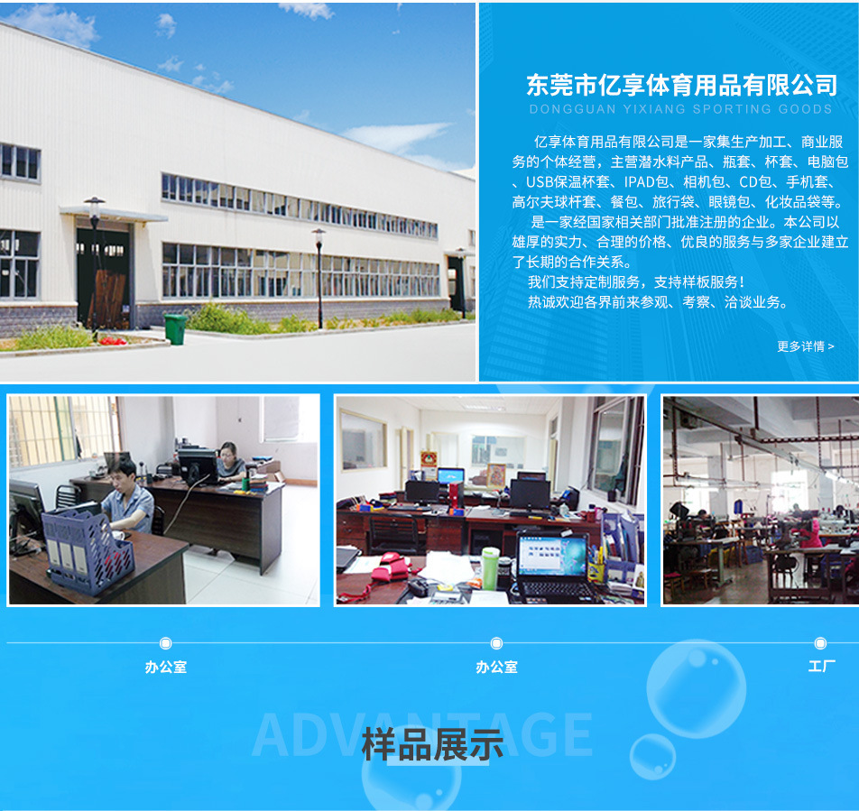 亿享体育用品有限公司是一家集生产加工、商业服务的个体经营,主营潜水料产品、瓶套、杯套、电脑包、IPAD包、相机包、手机套、高尔夫球杆套、餐包、眼镜包、化妆包等。 是一家经国家相关部门批准注册的企业。本公司以雄厚的实力、合理的价格、优良的服务与多家企业建立了长期的合作关系。