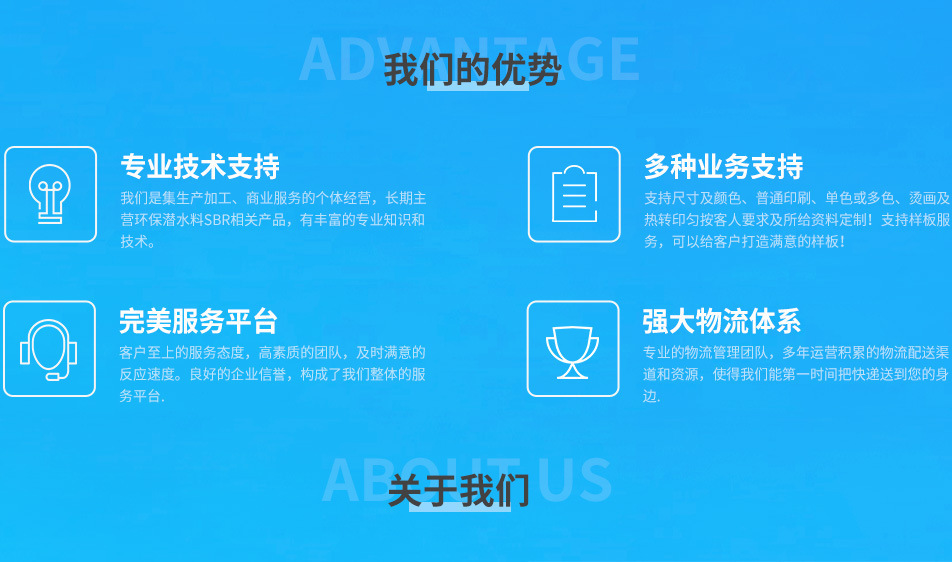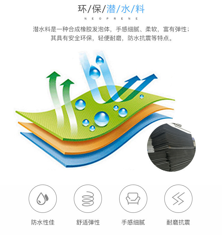 潜水料是一种合成橡胶发泡体,手感细腻,柔软,富有弹性,具有防震,保温,弹性,不透水,不透气等特点。广泛用于潜水料的制造,所以大家就为它起了个通俗易懂的名字:Neoprene(潜水料)。