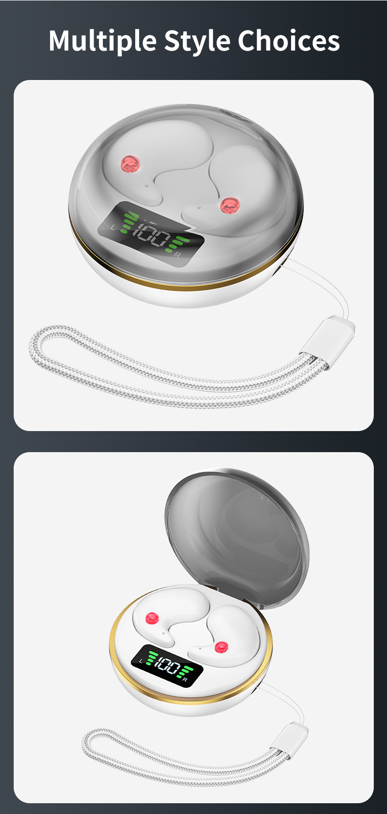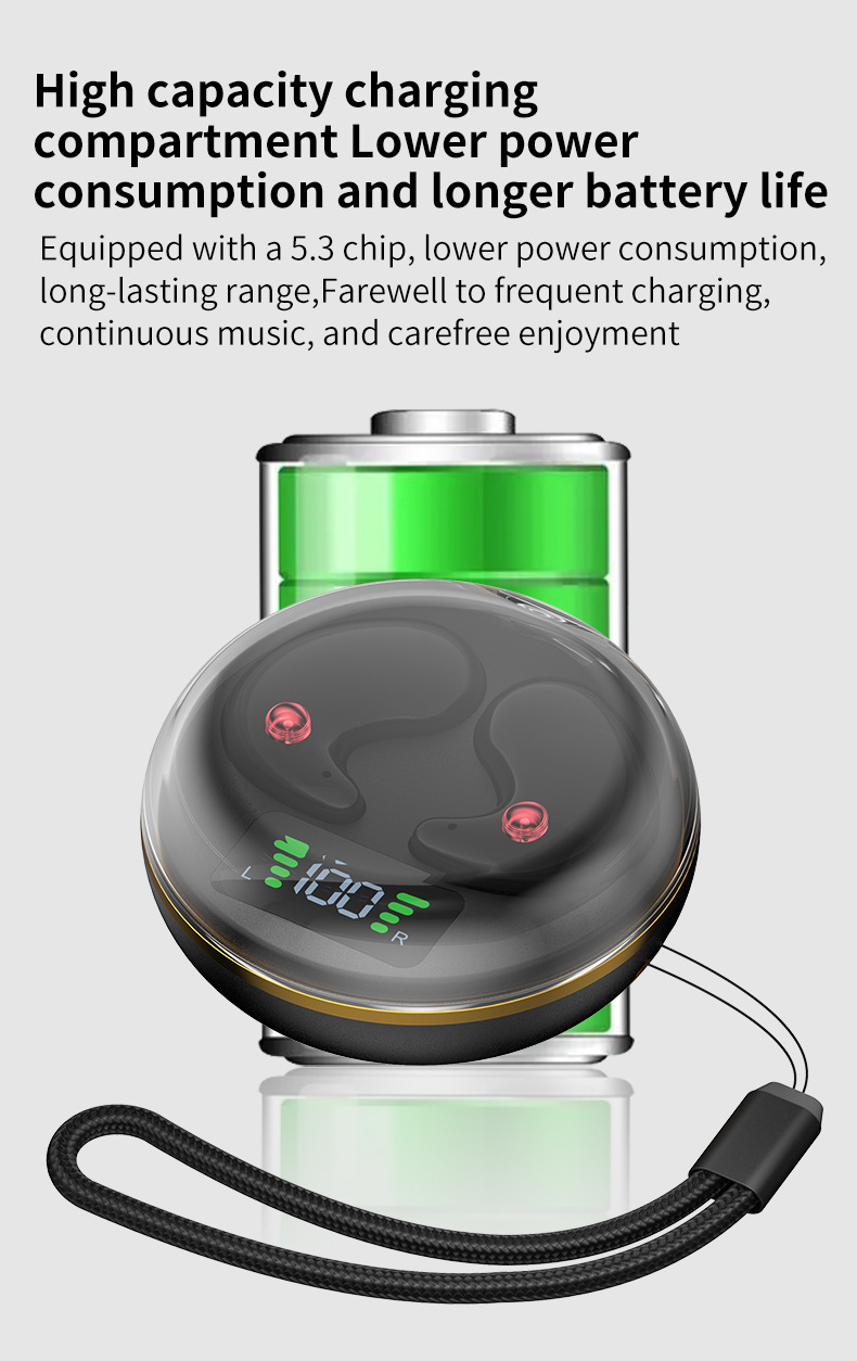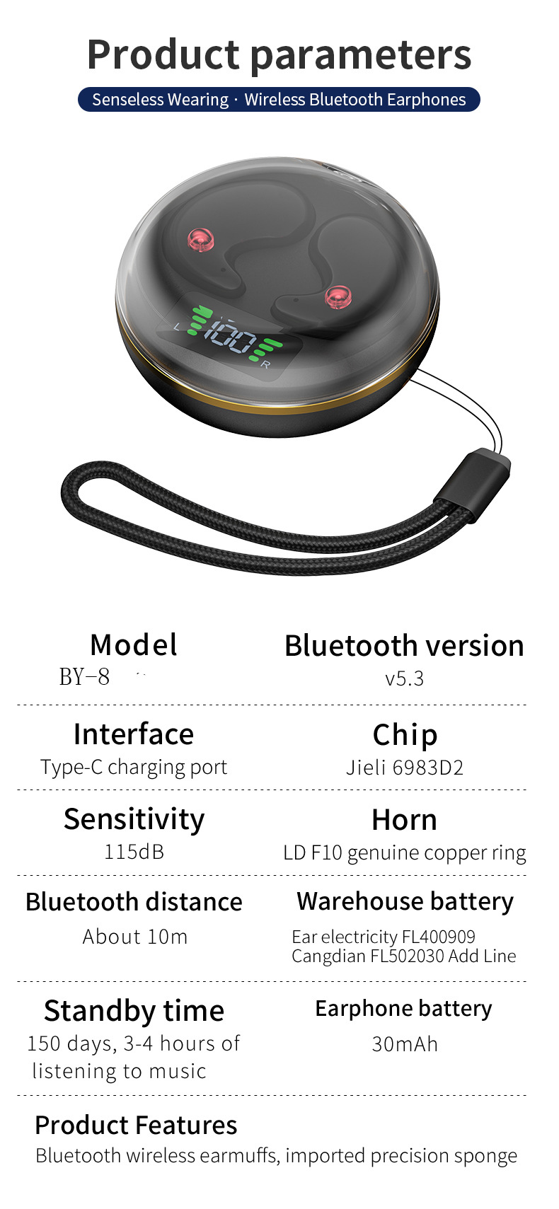 配件:一本说明书, 一条充电线, 一个充电仓 ,一条挂绳,两个耳机