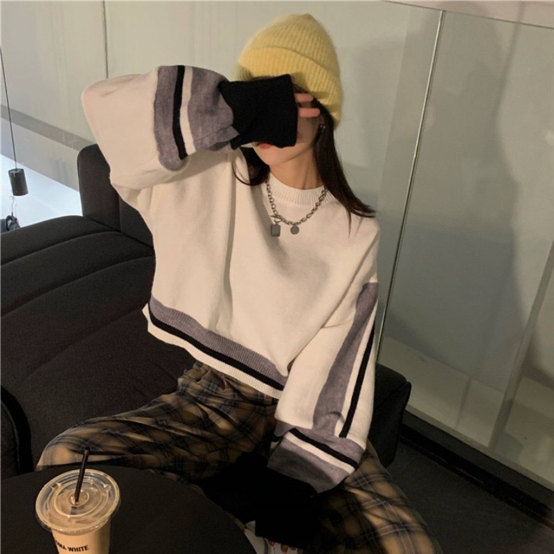 크로스 보더 짧은 스웨터 여성의 가을과 겨울 새로운 일본 디자인 감각 틈새 랜턴 슬리브 하이 웨이스트 라운드 넥 스웨터 탑스토어 가기