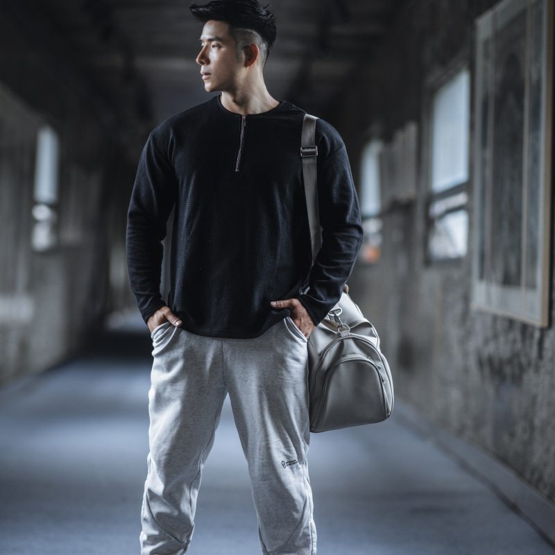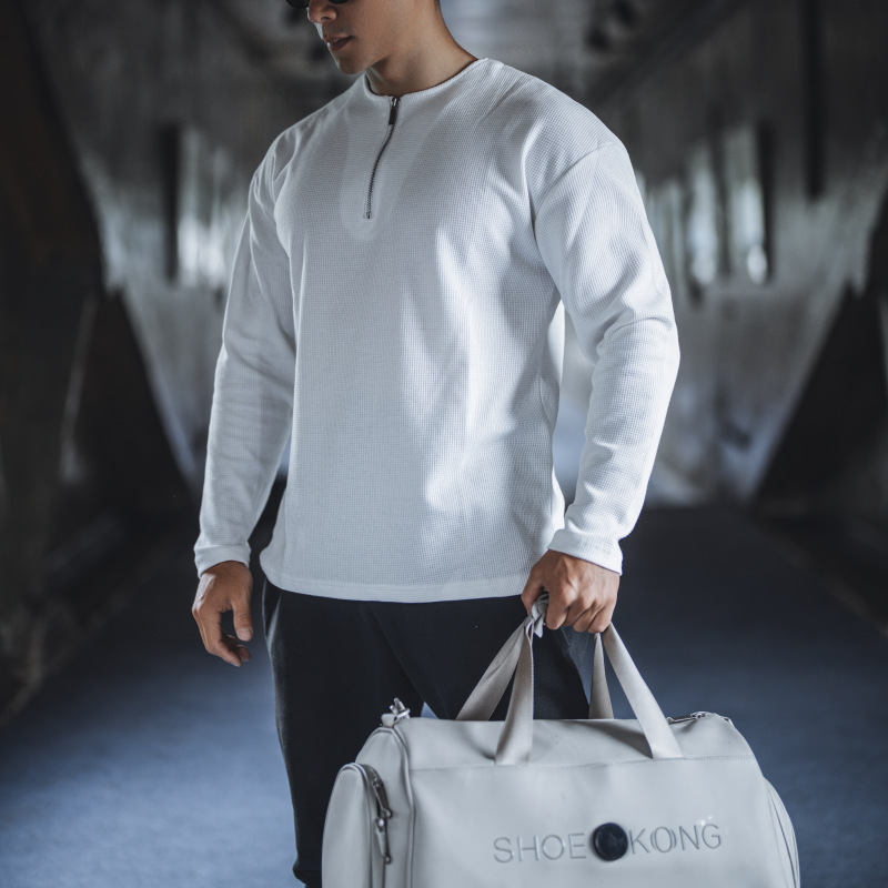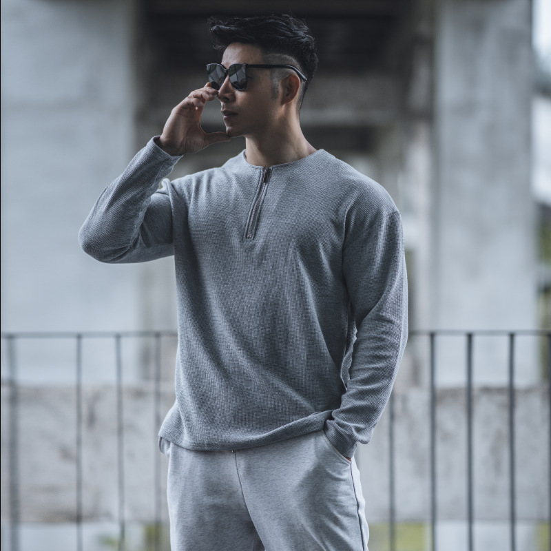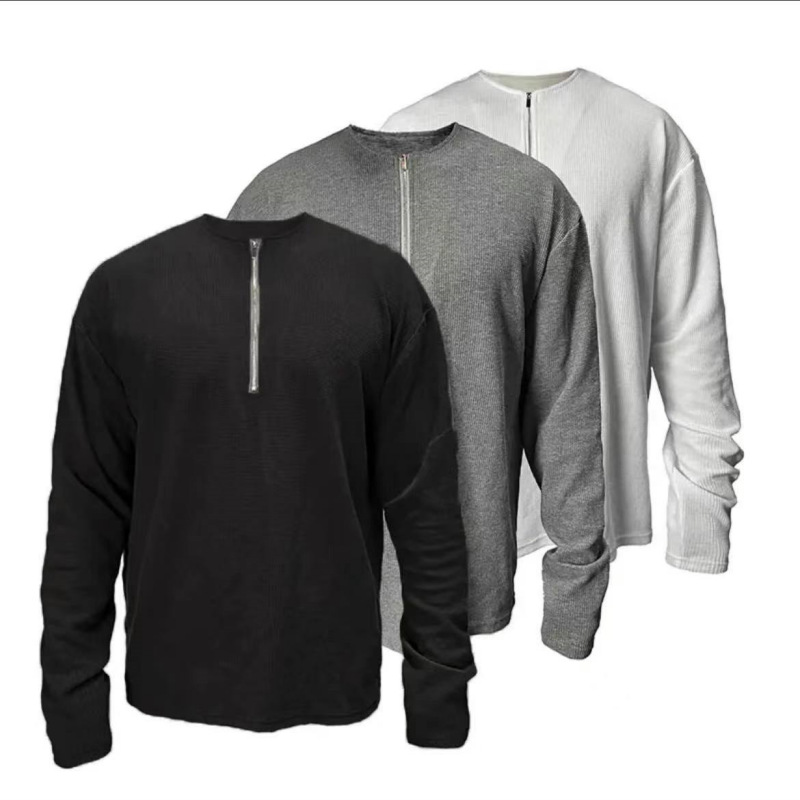남자 스포츠 캐주얼 하프 지퍼 와피 탑 캐주얼 아메리칸 스타일 트레이닝 티셔츠 봄과 가을 트렌디 단색 긴 소매스토어 가기