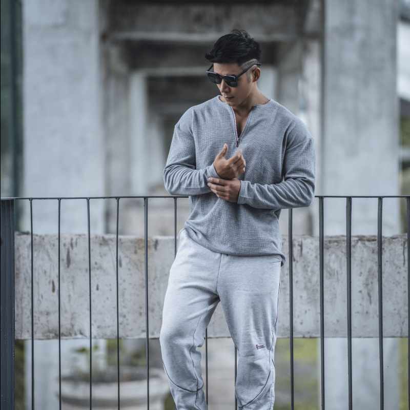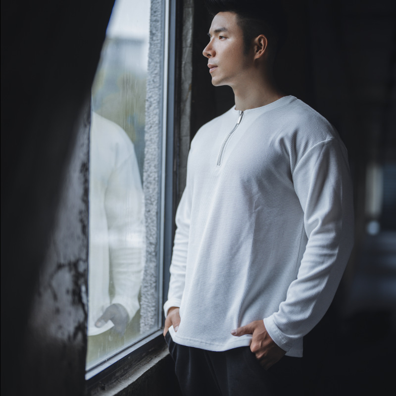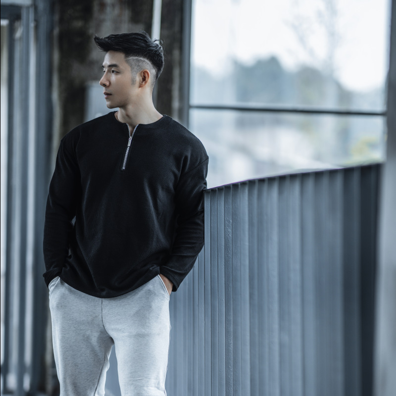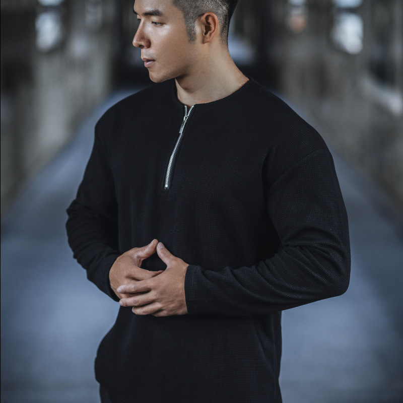 남자 스포츠 캐주얼 하프 지퍼 와피 탑 캐주얼 아메리칸 스타일 트레이닝 티셔츠 봄과 가을 트렌디 단색 긴 소매