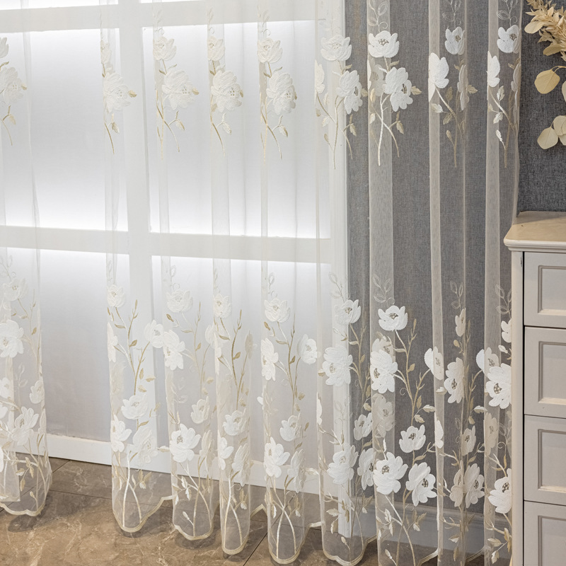 국경 간 아마존 빛 전송 자수 커튼 화이트 미국 목가적 인 꽃 거실 거즈 커튼 거실 침실 반 음영