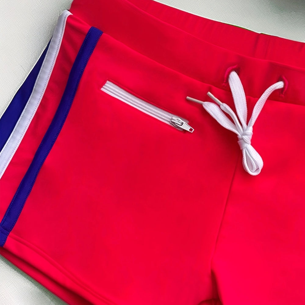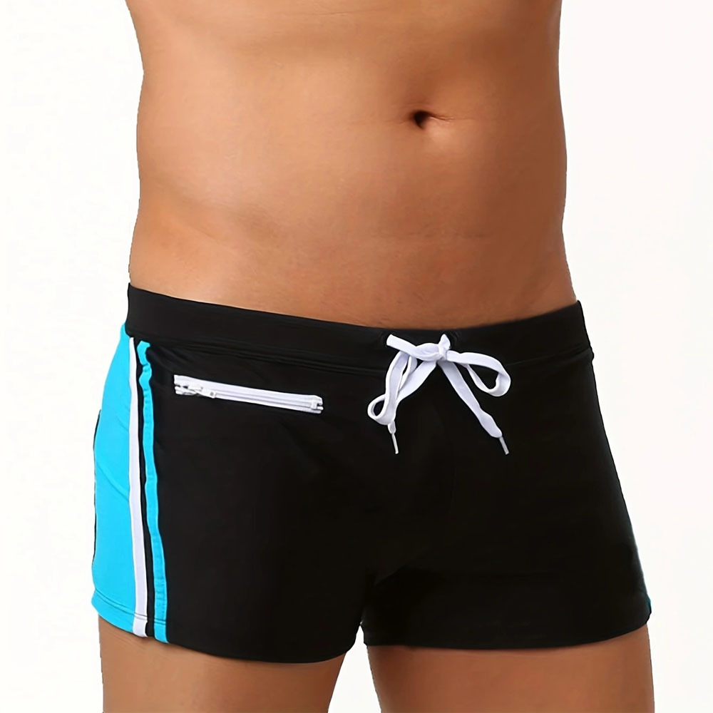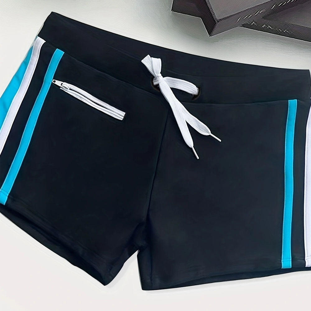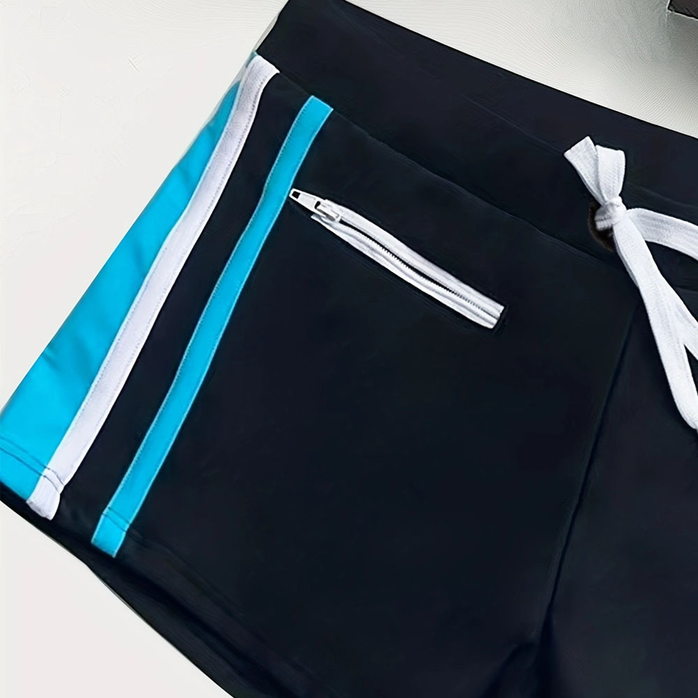 2024 크로스 국경 대외 무역 새로운 남자의 컬러 매칭 지퍼 테더 슬림 복서 반바지 수영 해변 공장 재고
