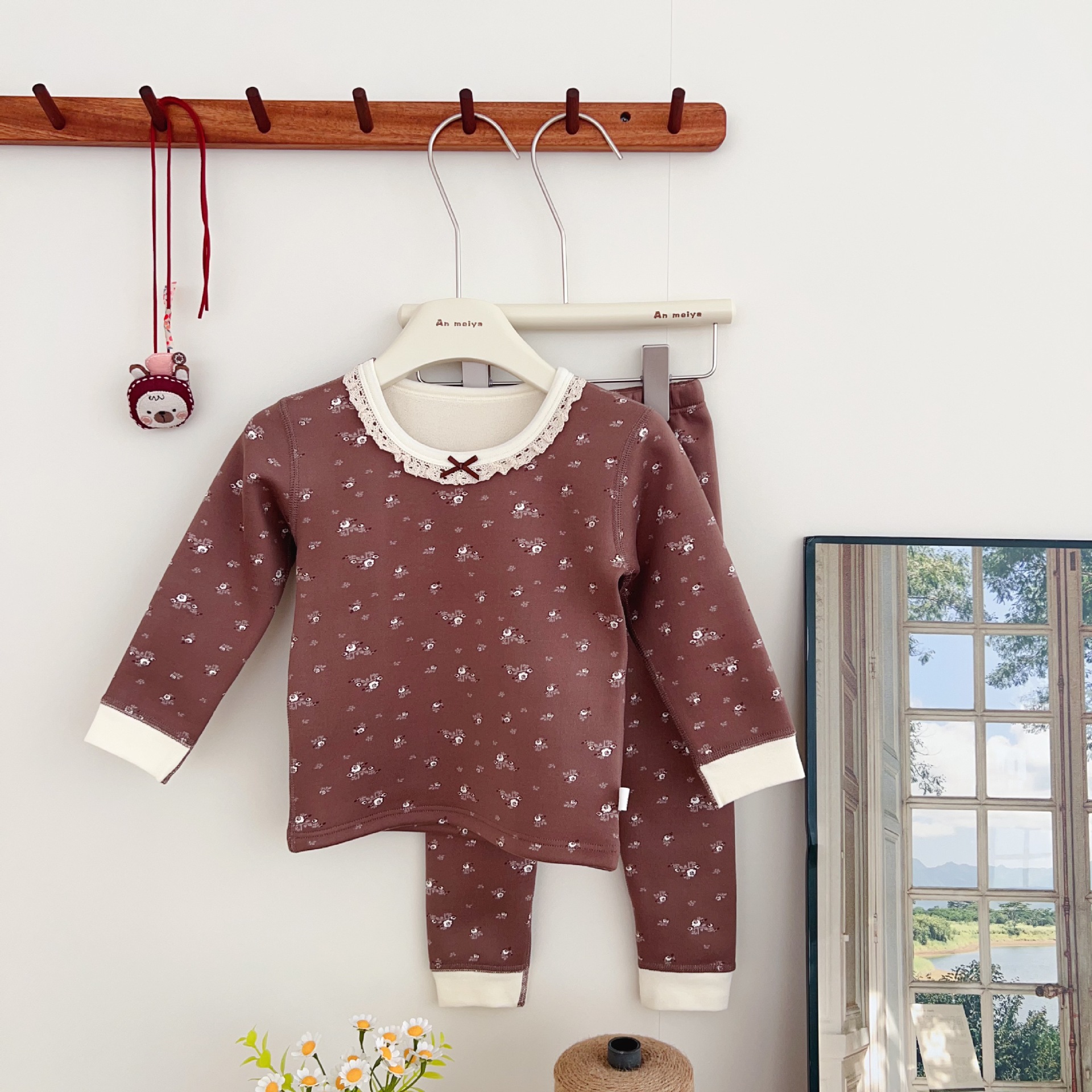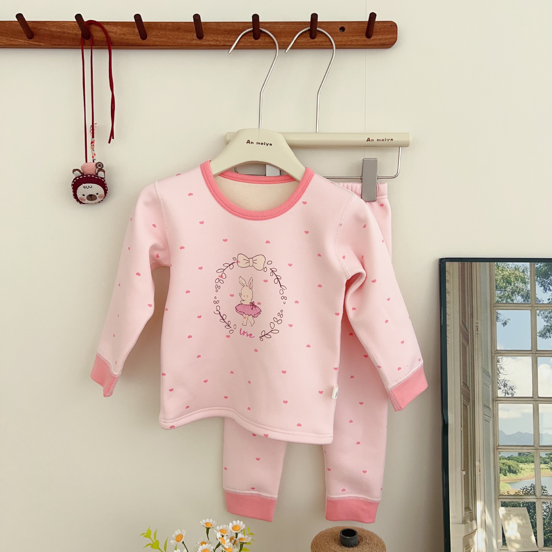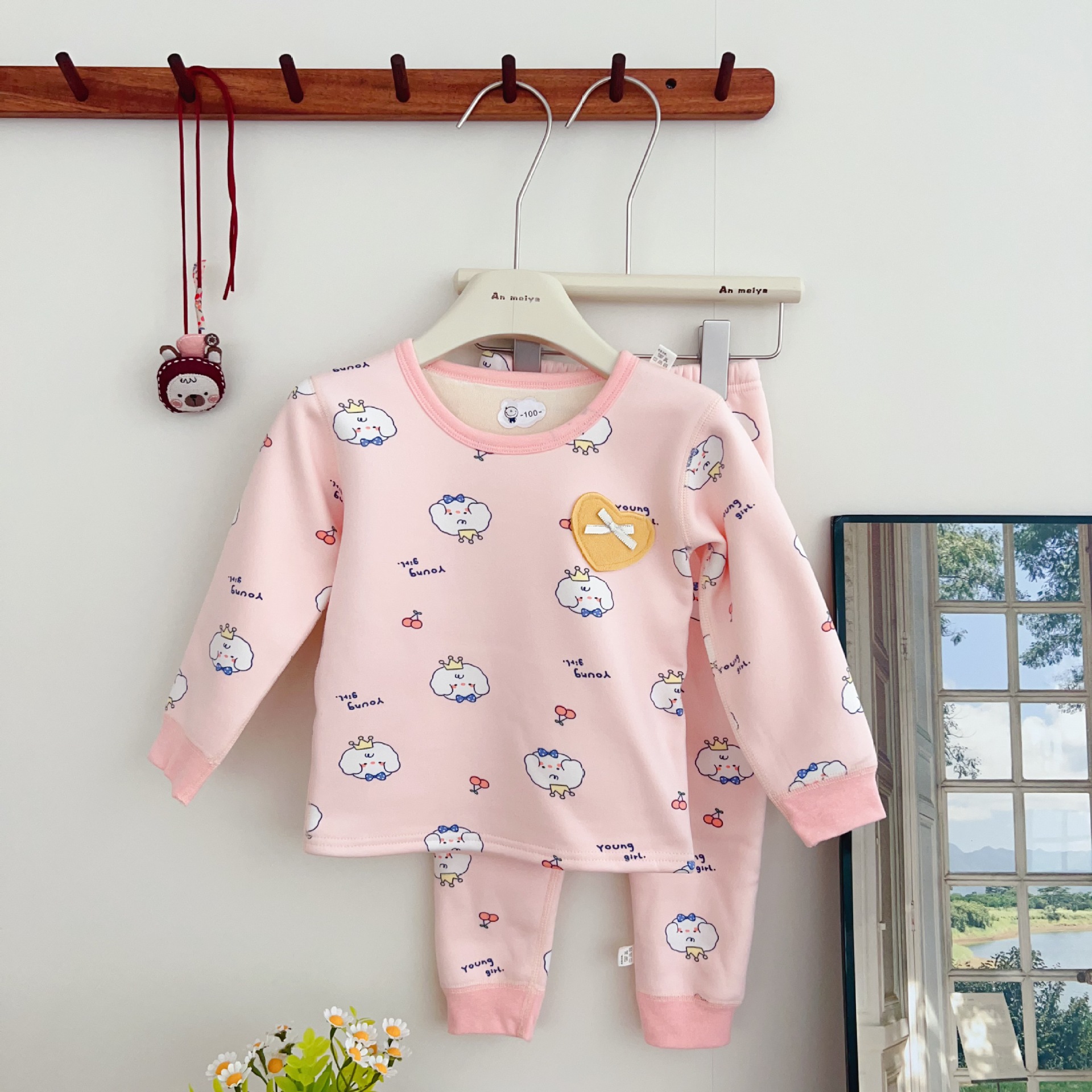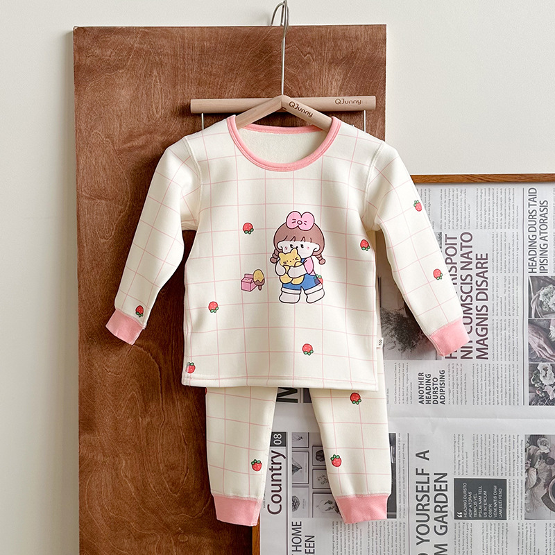 안메이야 어린이 벚꽃 벨벳 따뜻한 세트 우유 실크 목 한국 스타일 만화 승무원 목 홈 옷 어린이 잠옷스토어 가기