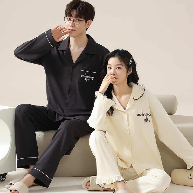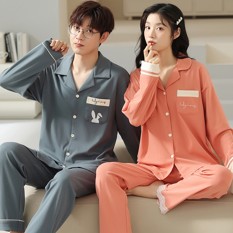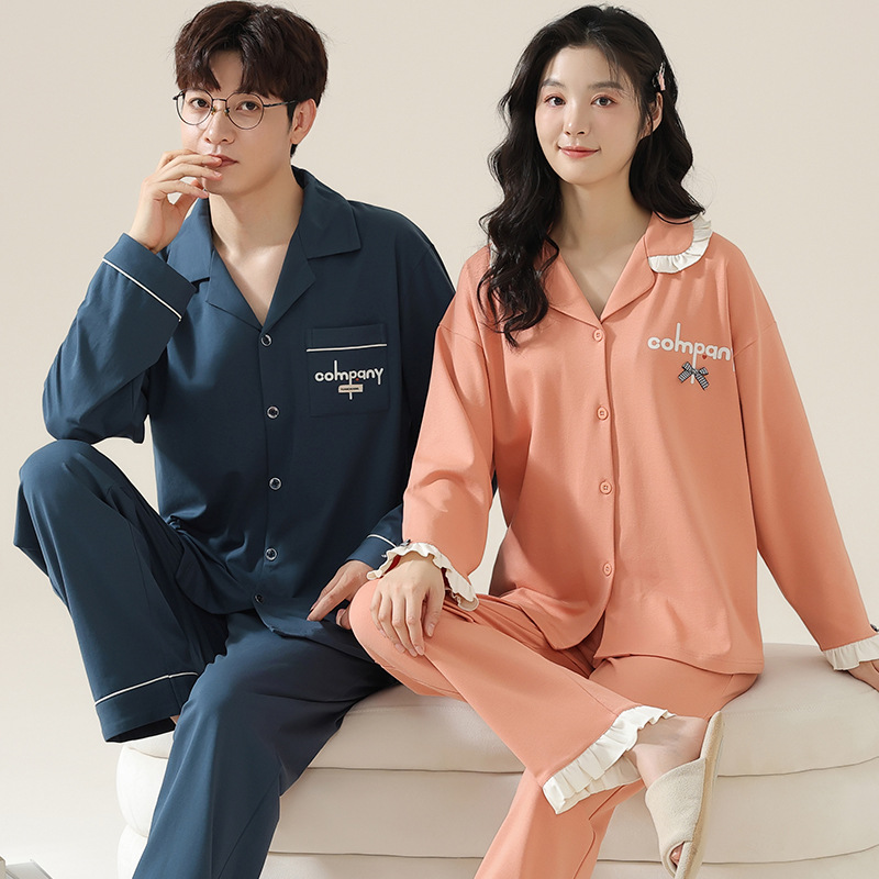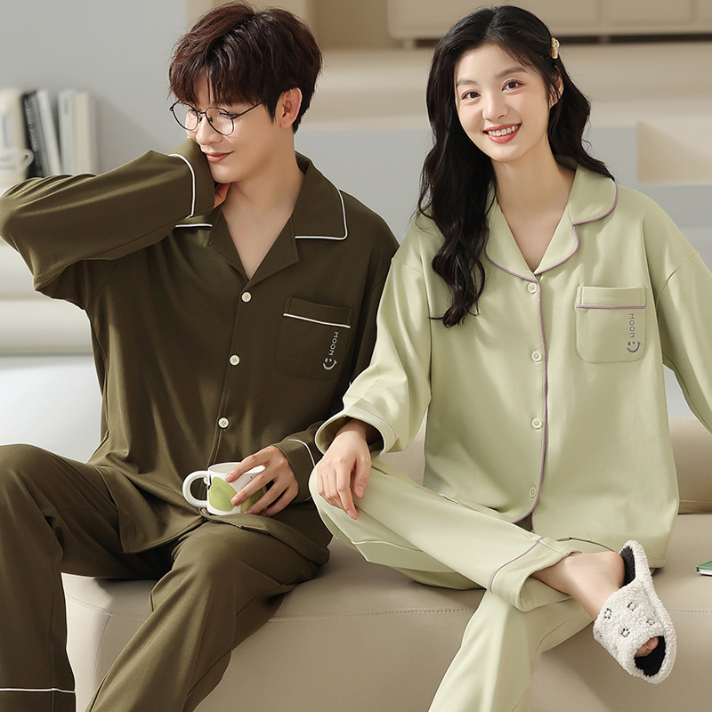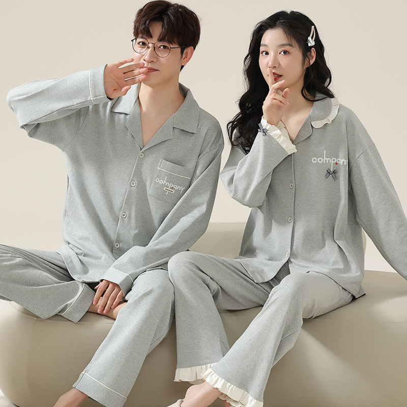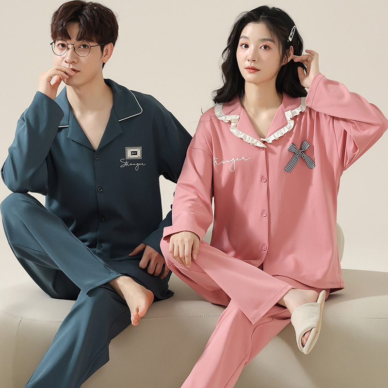 【100% 순면】봄 신상 커플 잠옷 여성용 가을 겨울용 가디건 긴팔 긴바지 남성용 홈웨어 세트