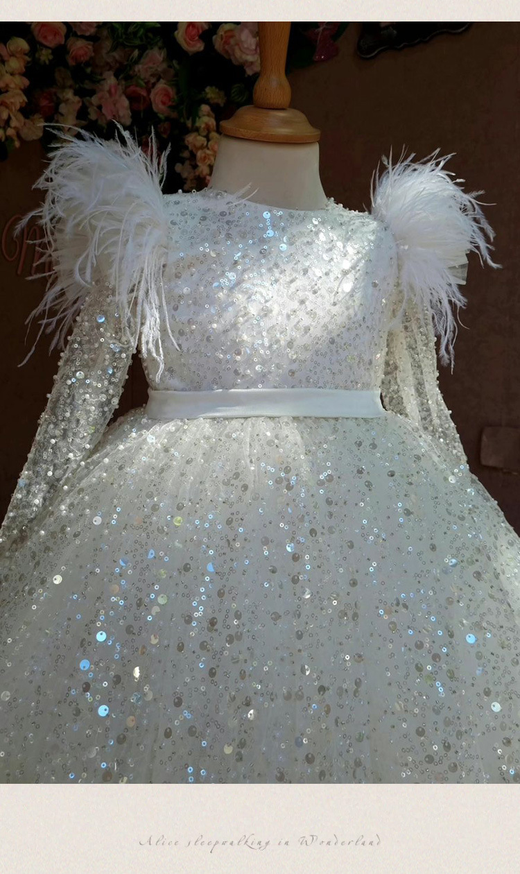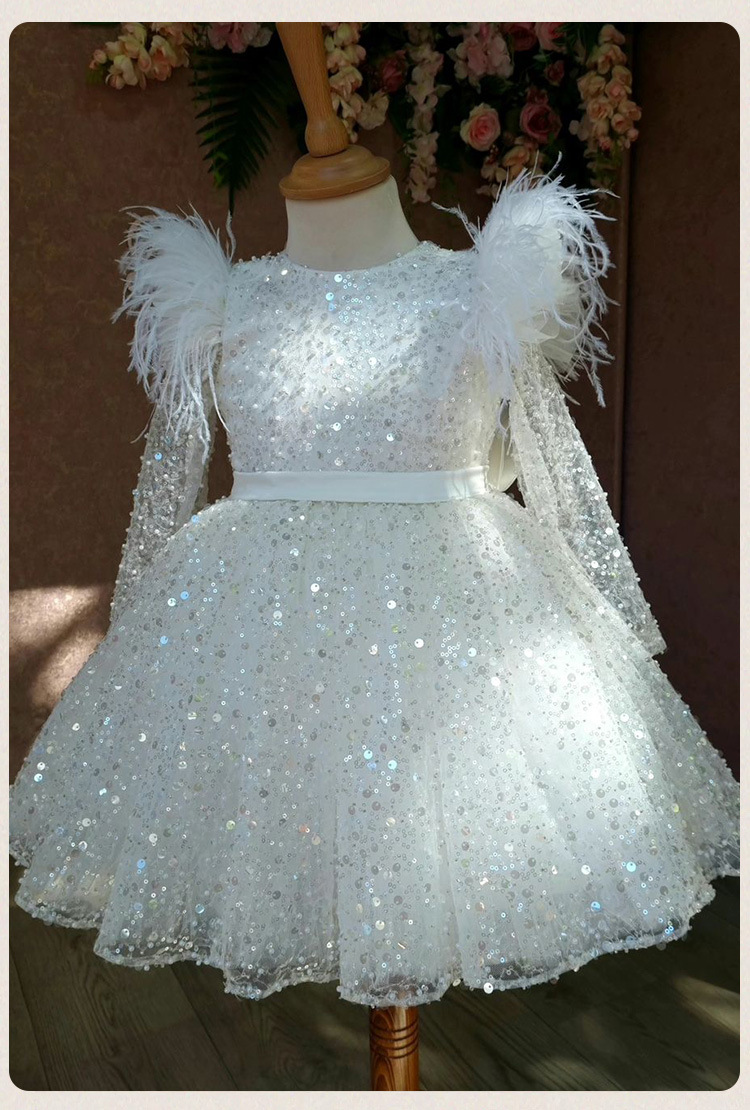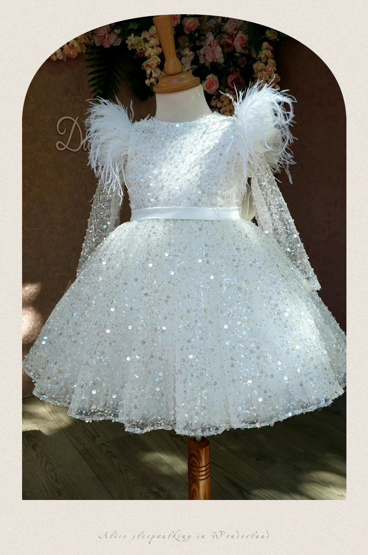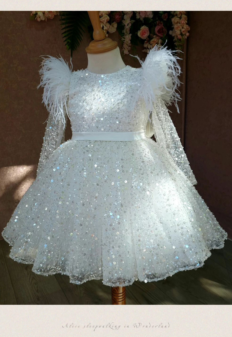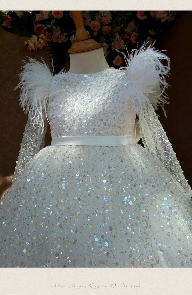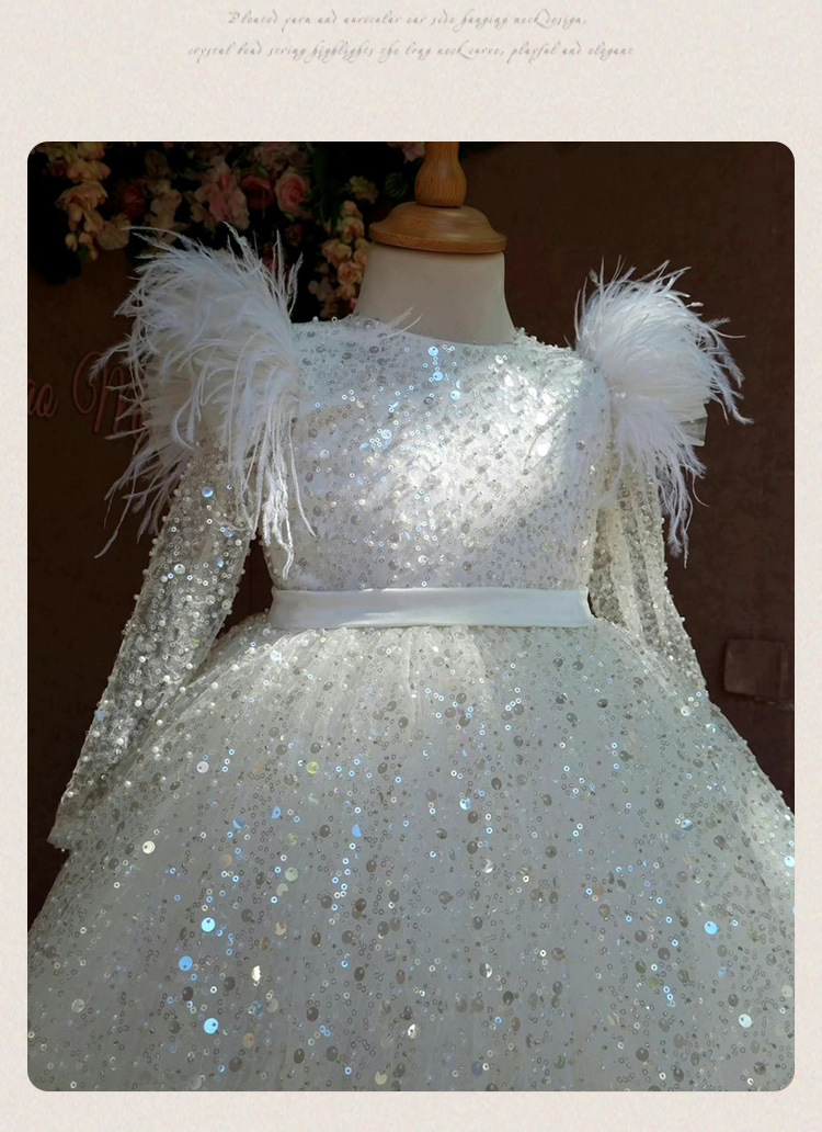 소녀 흰색 푹신한 그릇 원피스 긴 소매 깃털 저녁 원피스 세련된 스팽글 소녀 꽃 소녀 어린이 생일 의상
