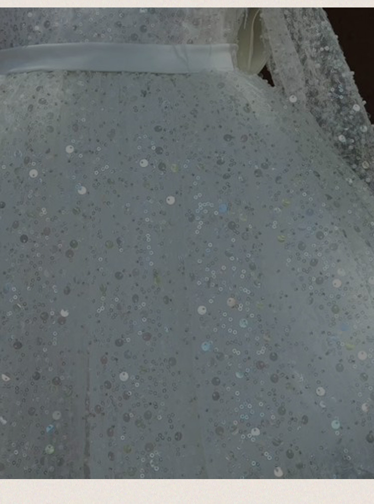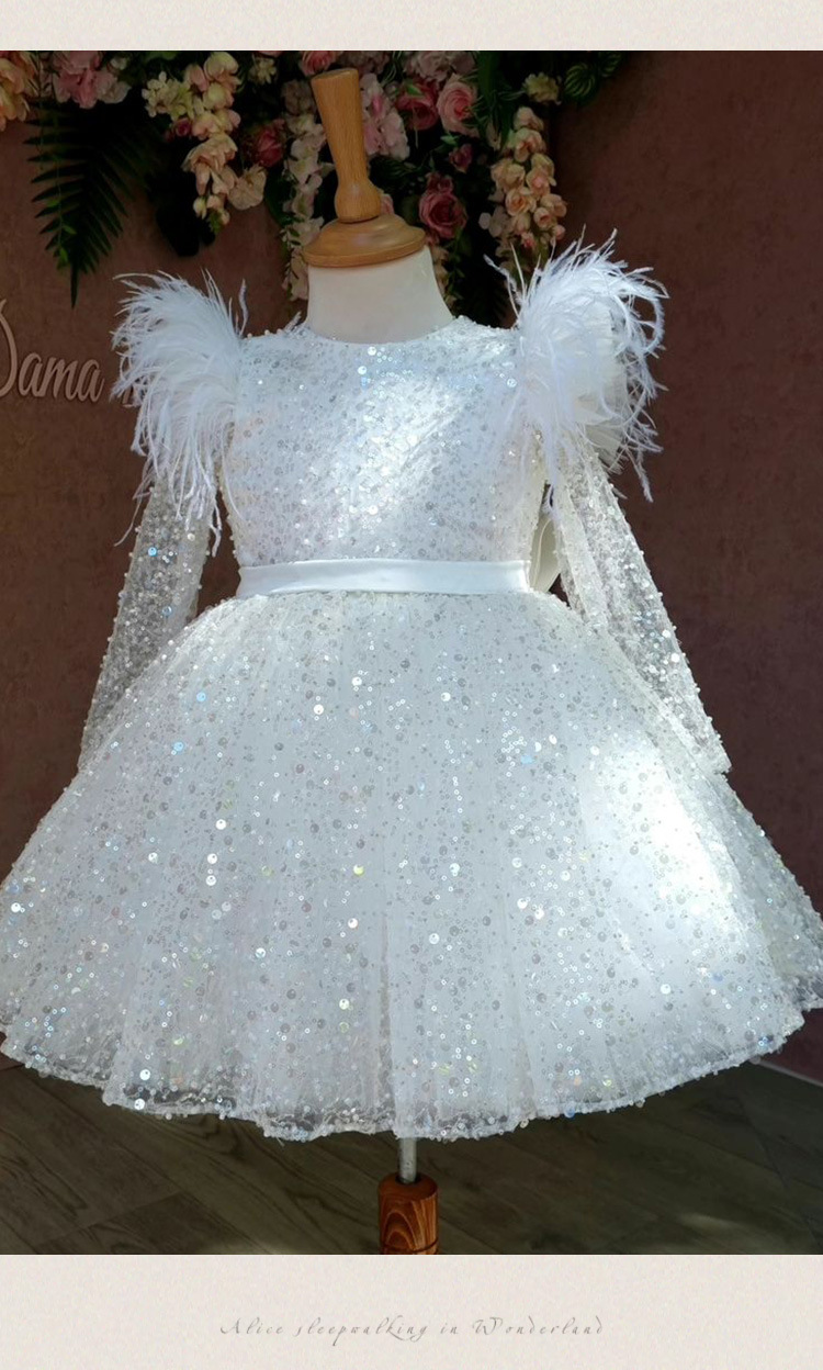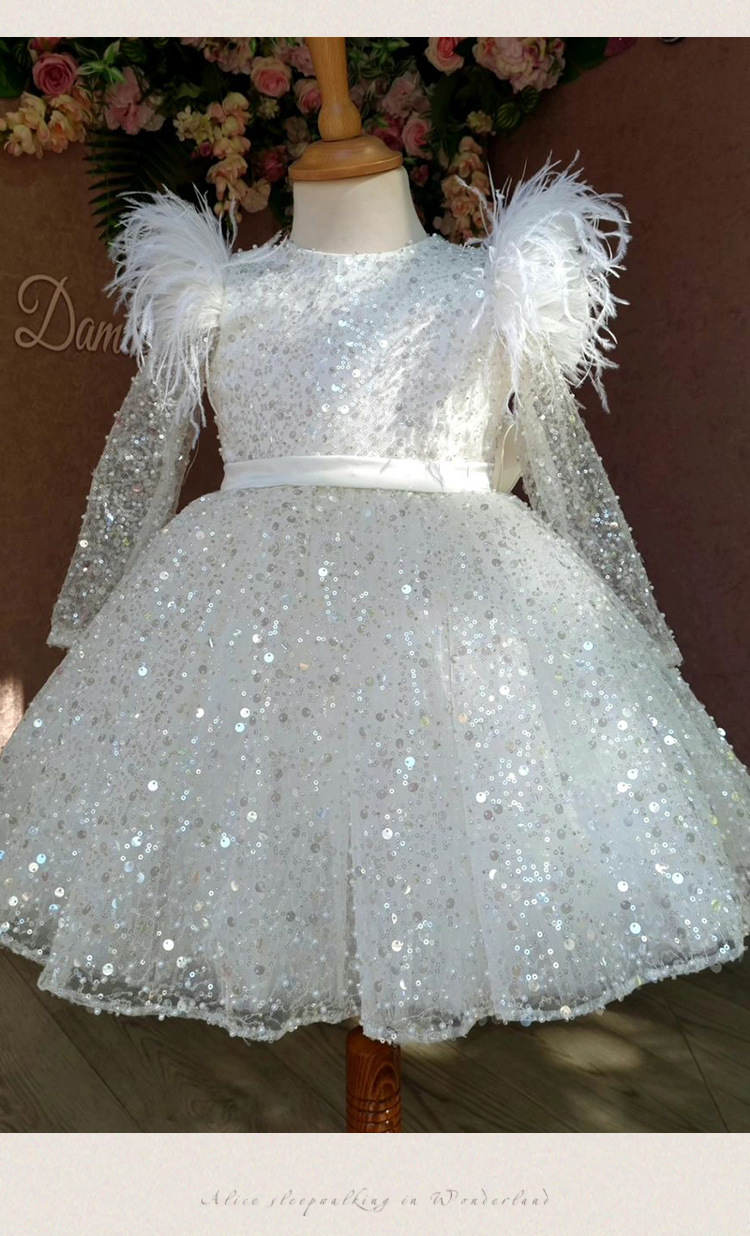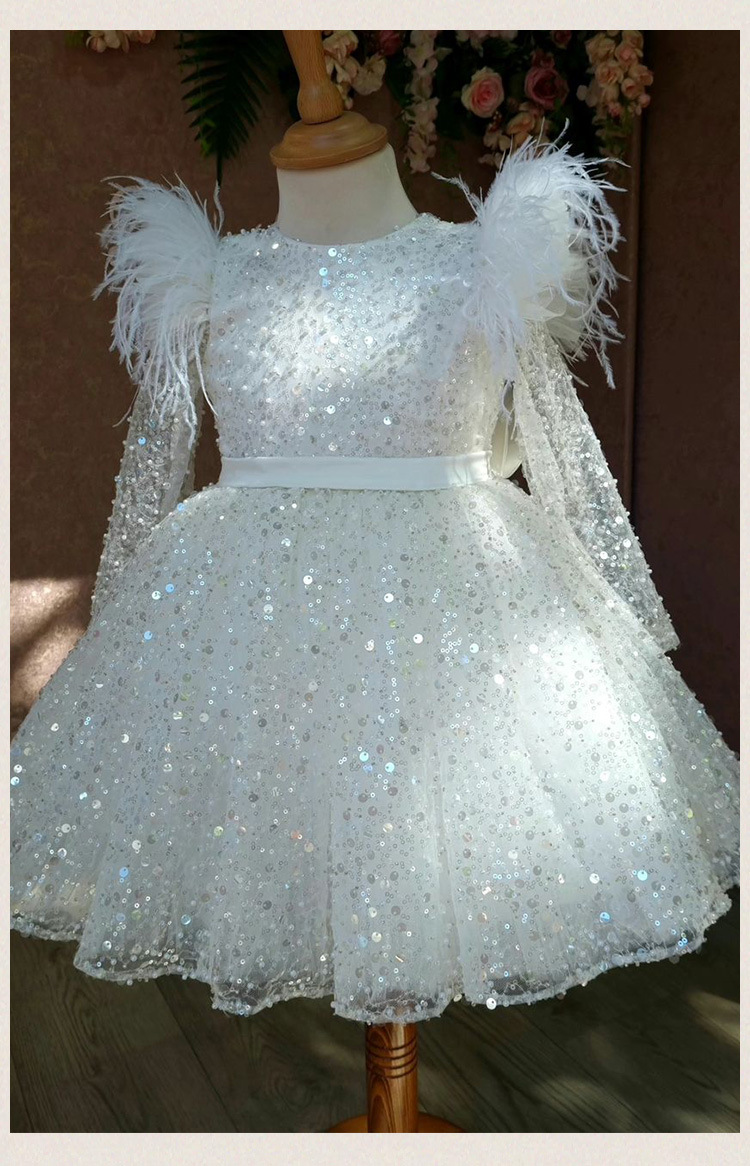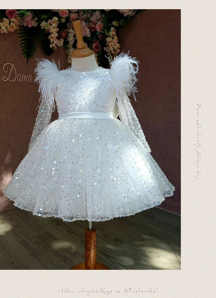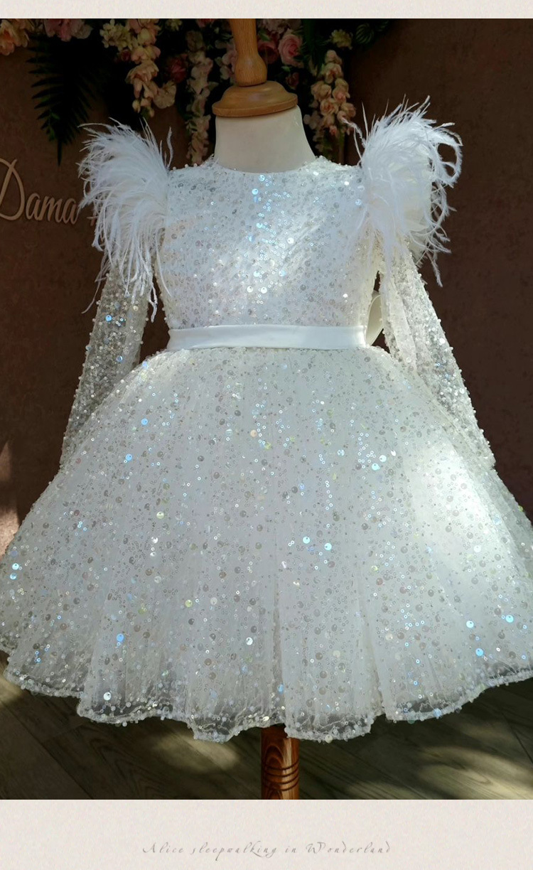 소녀 흰색 푹신한 그릇 원피스 긴 소매 깃털 저녁 원피스 세련된 스팽글 소녀 꽃 소녀 어린이 생일 의상