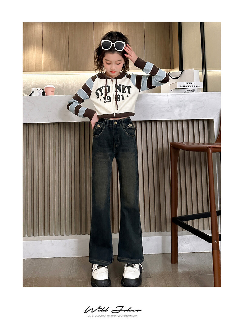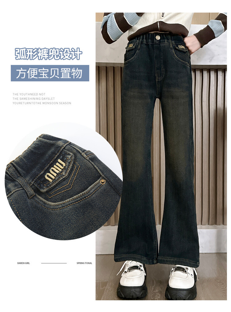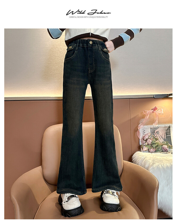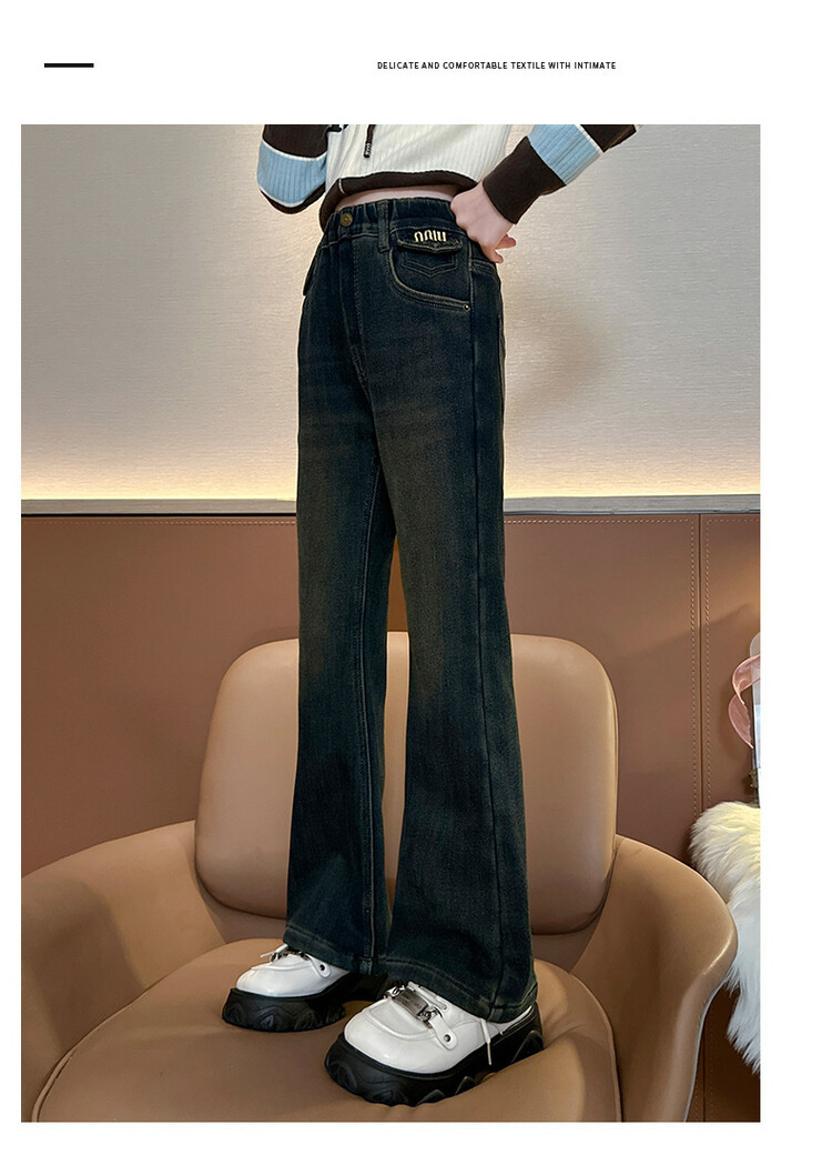 여아 기모 바지 느슨한 청바지 2023 가을과 겨울 새로운 부드러운 두꺼운 소녀 캐주얼 와이드 레그 팬츠