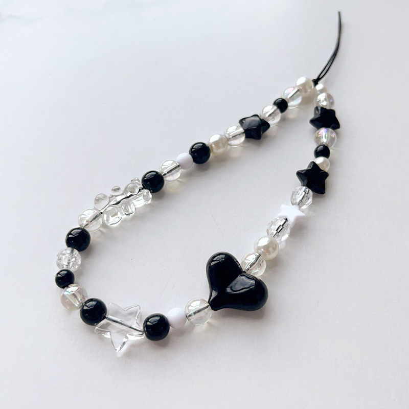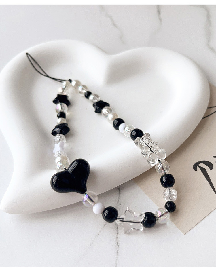 흑백 스타 사랑 휴대 전화 끈 진주 구슬 크리스탈 곰 휴대 전화 끈 짧은 휴대 전화 교수형 핸드 로프