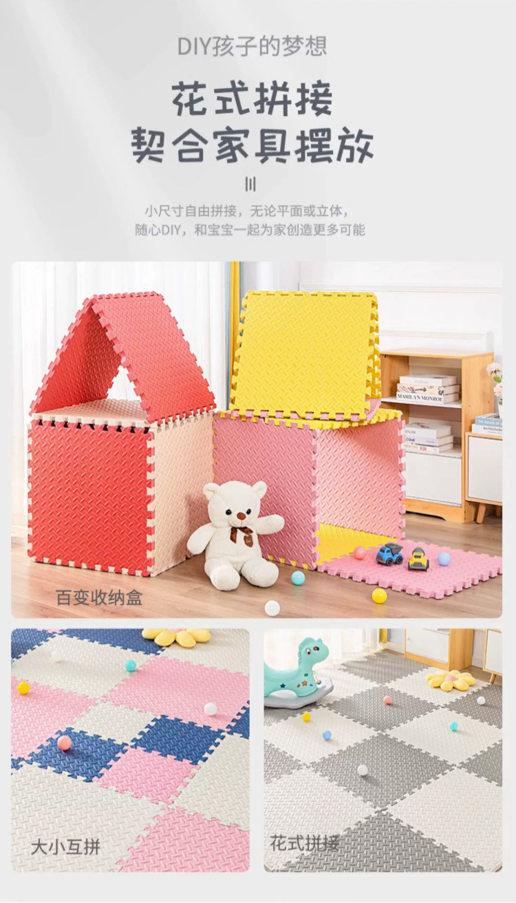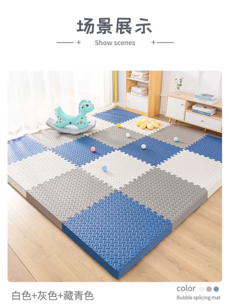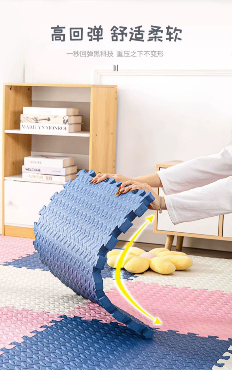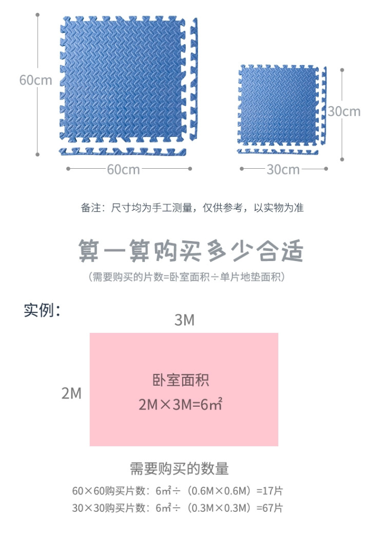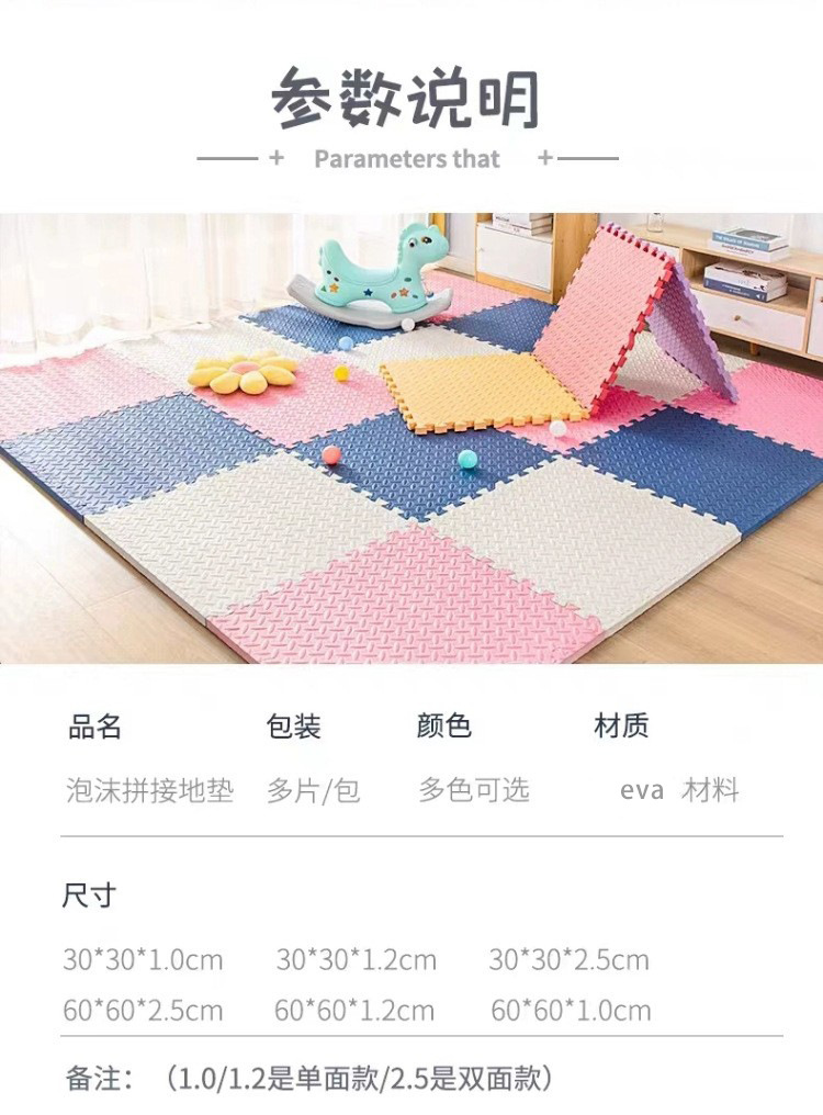 关于尺寸:地垫高温发泡一次成型,厚度会有1-2mm的工业误差,没法避免,用直尺或者卷尺测量建议把地垫摞起来测10个取平均厚度较为准确;长宽尺寸由于手工测量可能存在1-3cm的误差;对尺寸要求精准的亲慎拍。