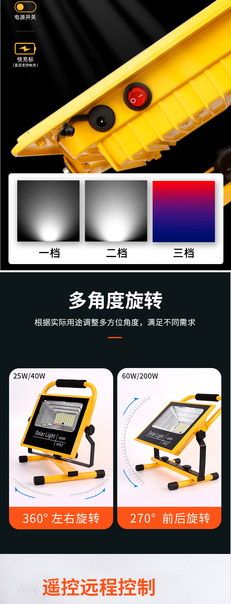 • 태양광 휴대용 램프 200W (태양 전지 패널 + 직접 충전 + 빨강 및 파랑 플래시)