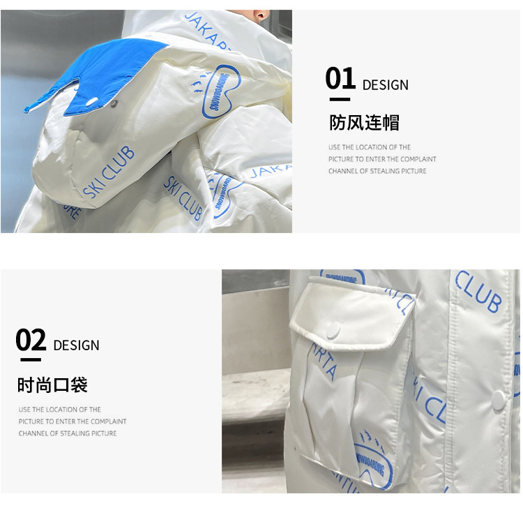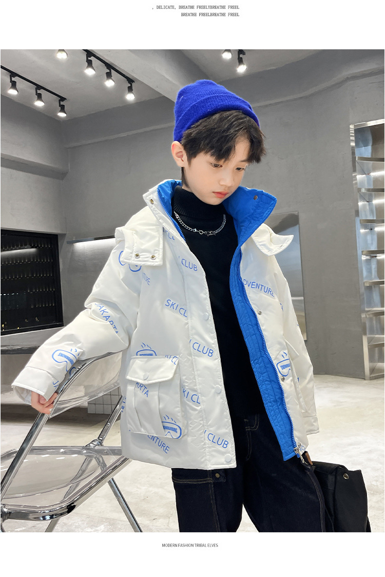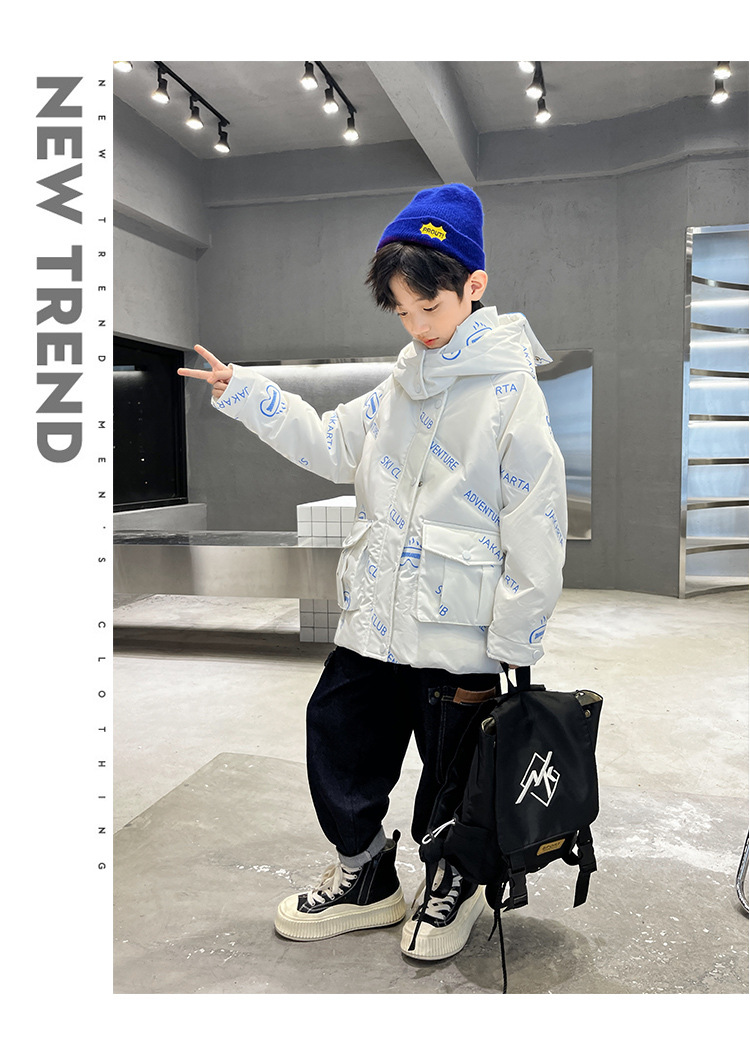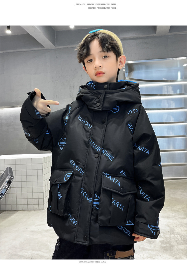 어린이 착용 다운 재킷 2023 한국 겨울 새 편지 소년 두꺼운 따뜻한 후드 소년 다운 재킷 도매