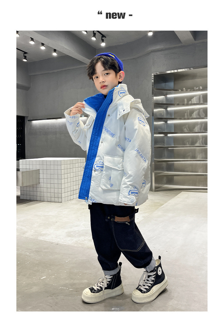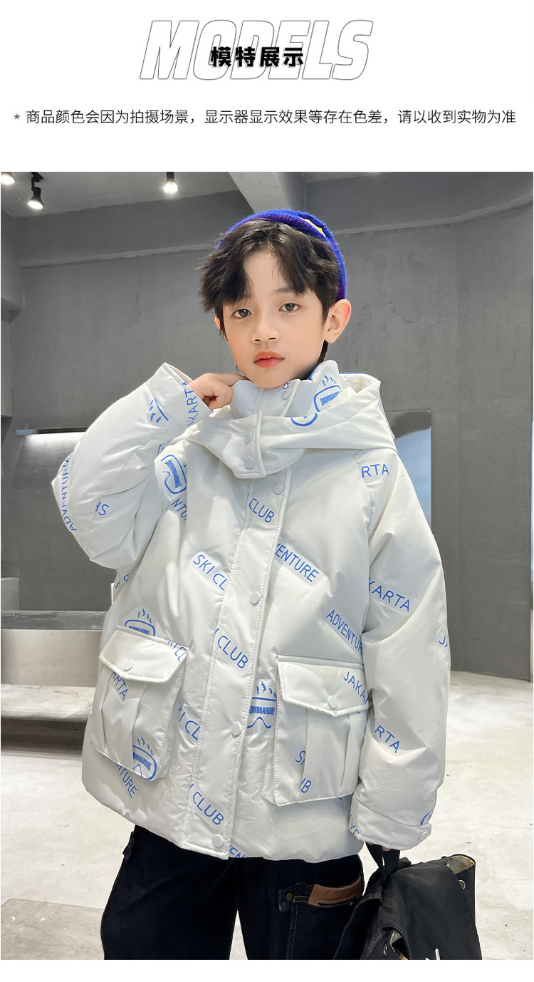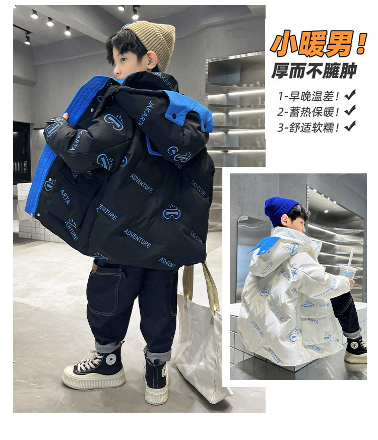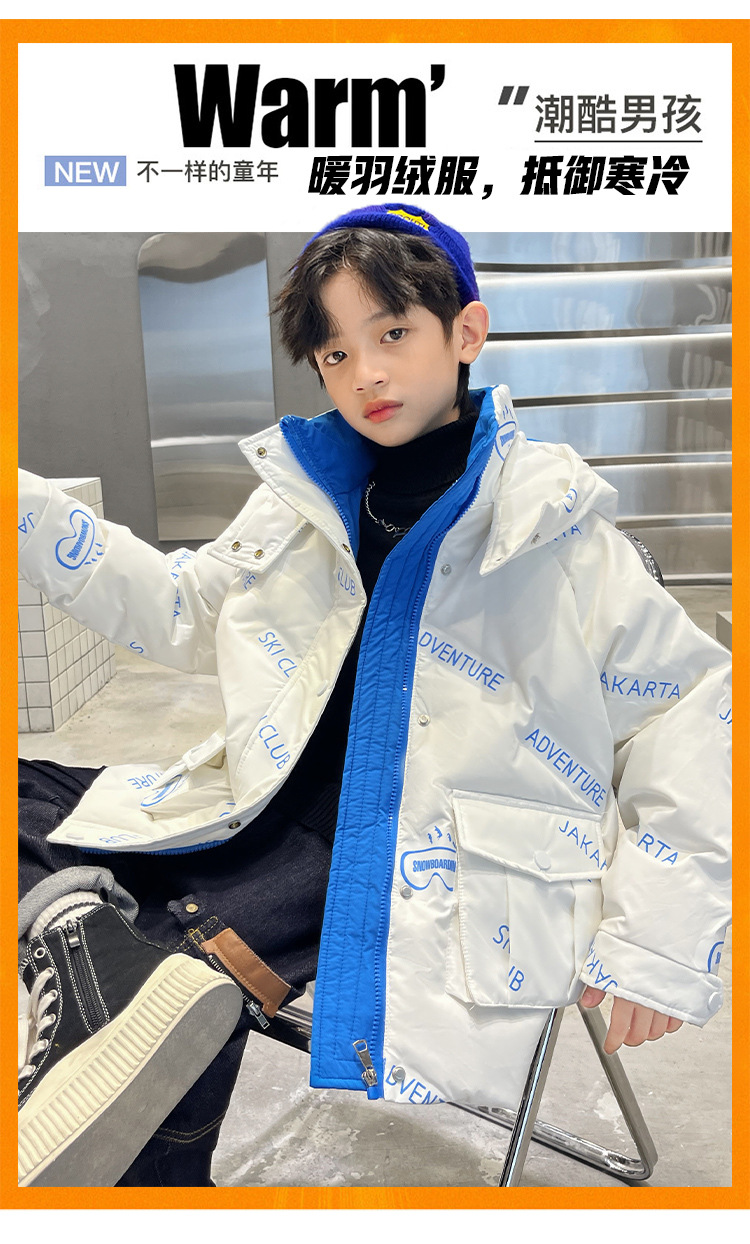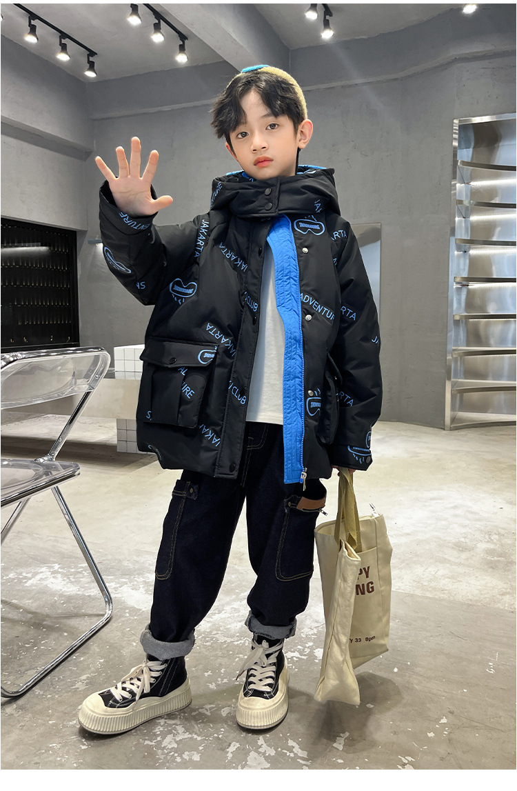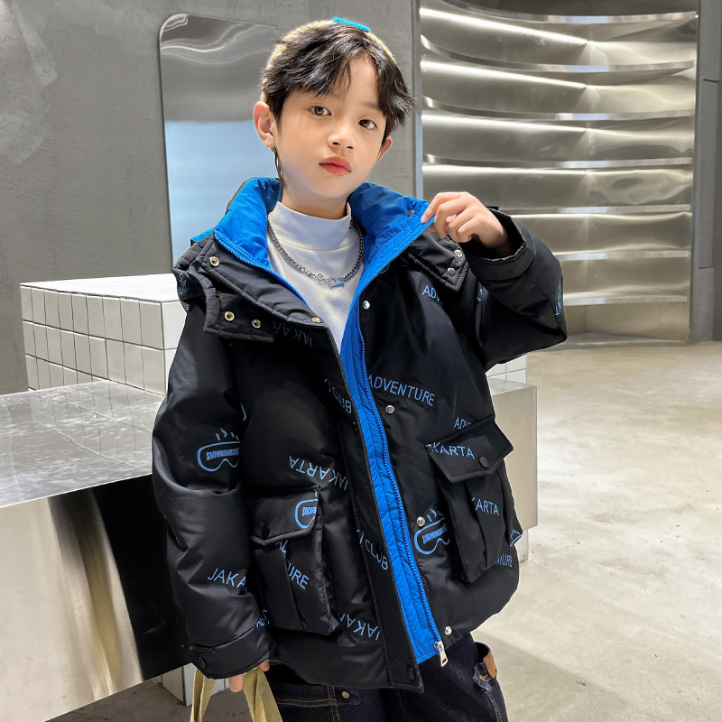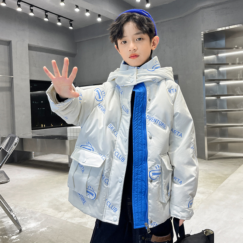 어린이 착용 다운 재킷 2023 한국 겨울 새 편지 소년 두꺼운 따뜻한 후드 소년 다운 재킷 도매스토어 가기