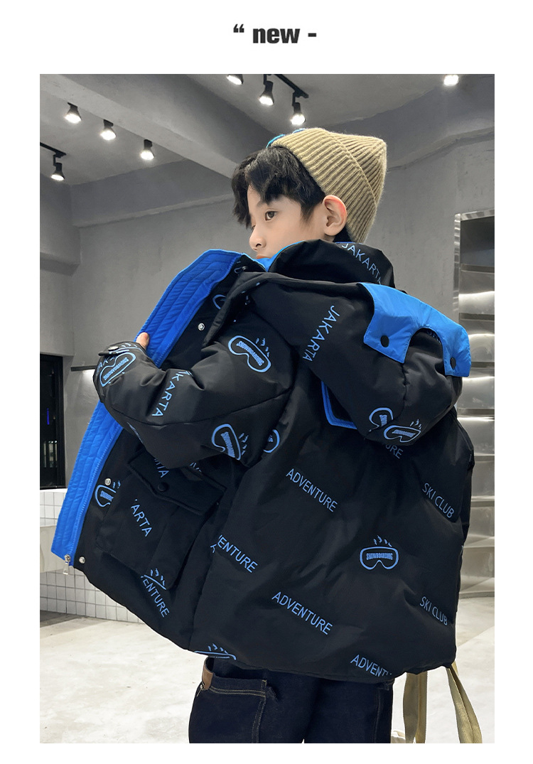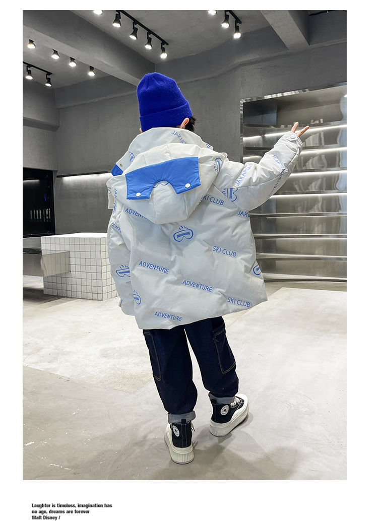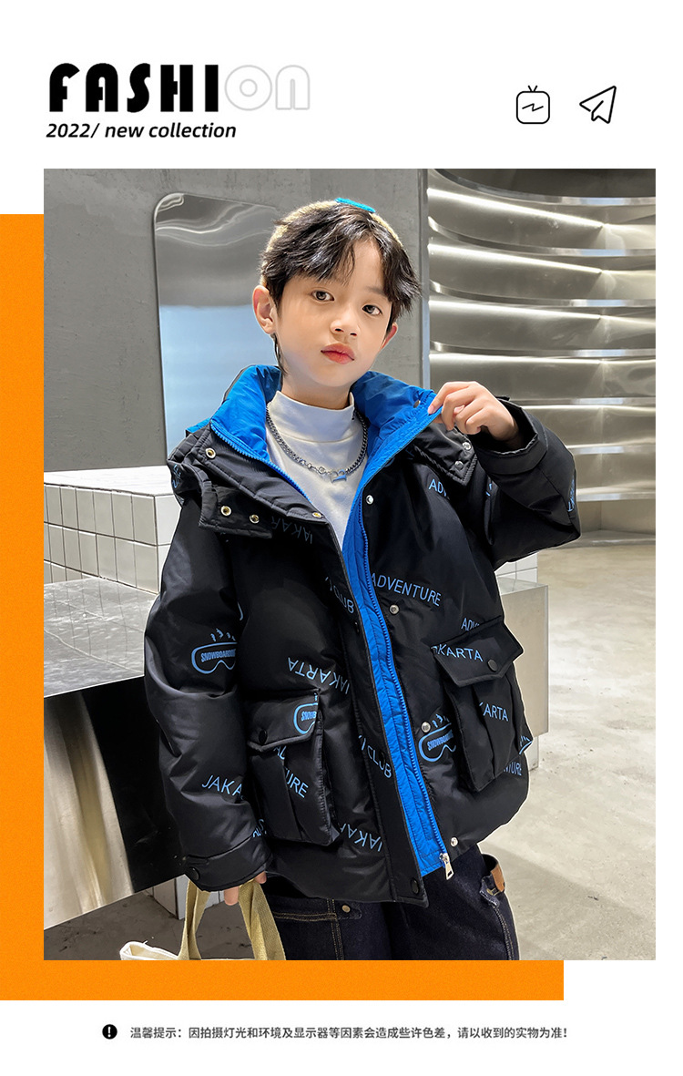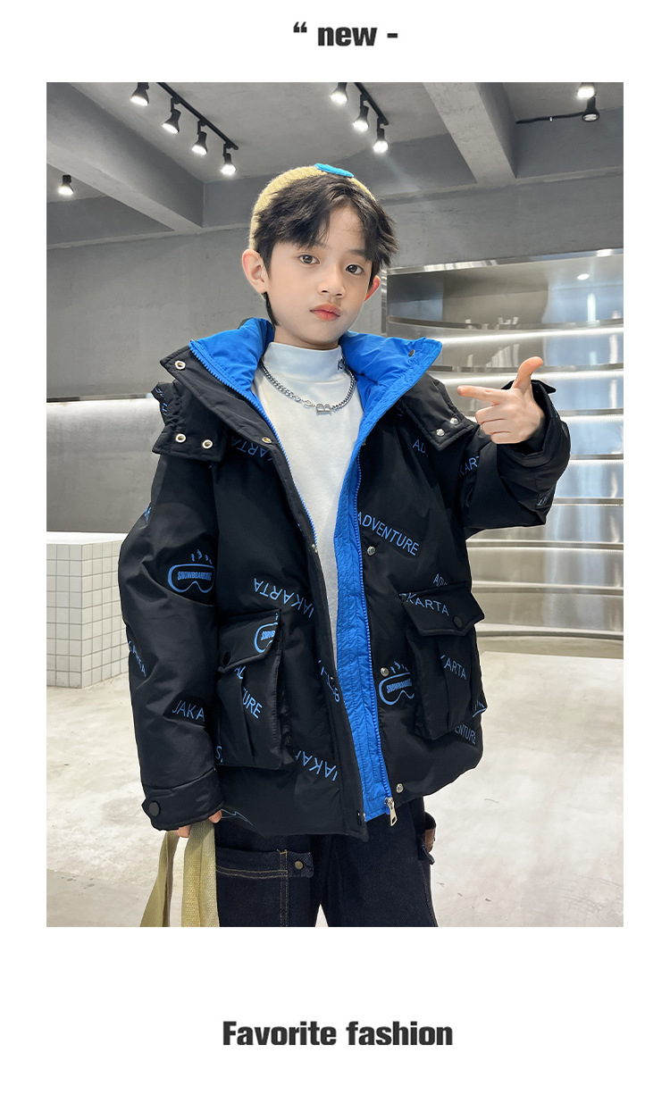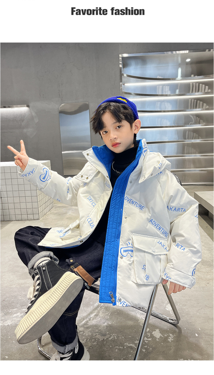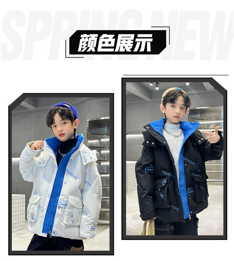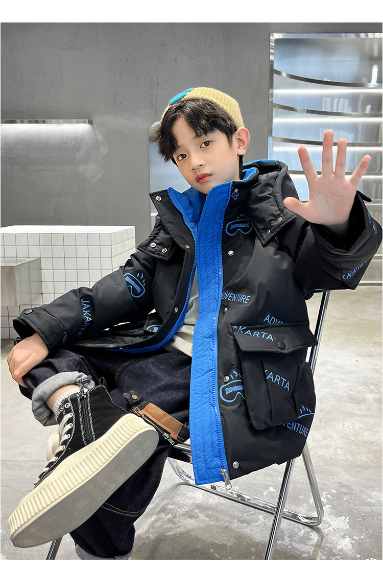 어린이 착용 다운 재킷 2023 한국 겨울 새 편지 소년 두꺼운 따뜻한 후드 소년 다운 재킷 도매스토어 가기