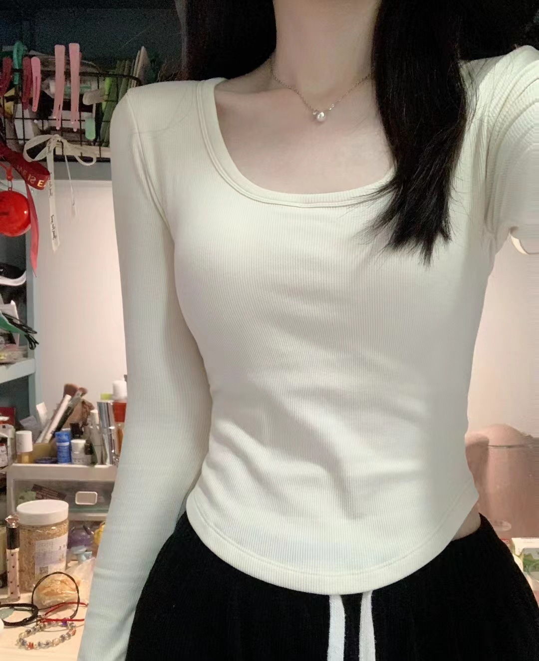 가을과 겨울 새로운 프랑스 스타일 레트로 스퀘어 칼라 긴 소매 가슴 패드 원피스 슬림핏 슬리밍 베이스 탑 여성용 베이스 셔츠스토어 가기
