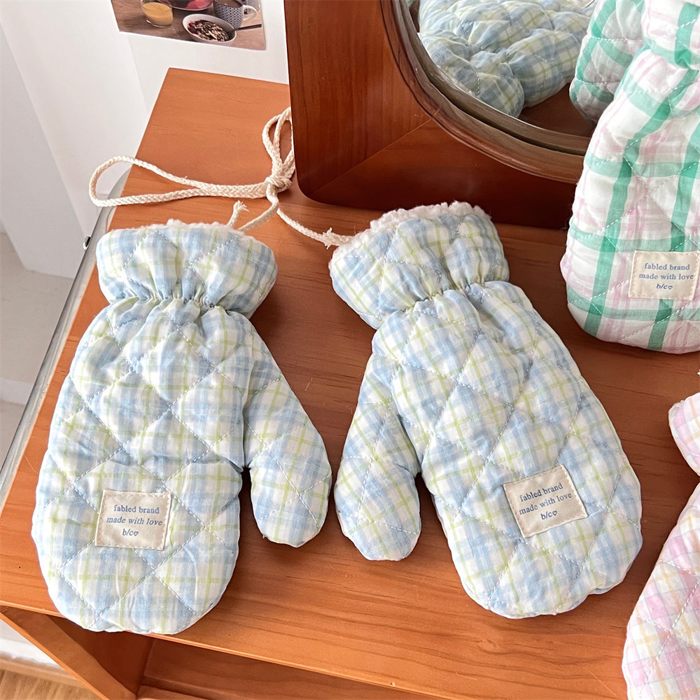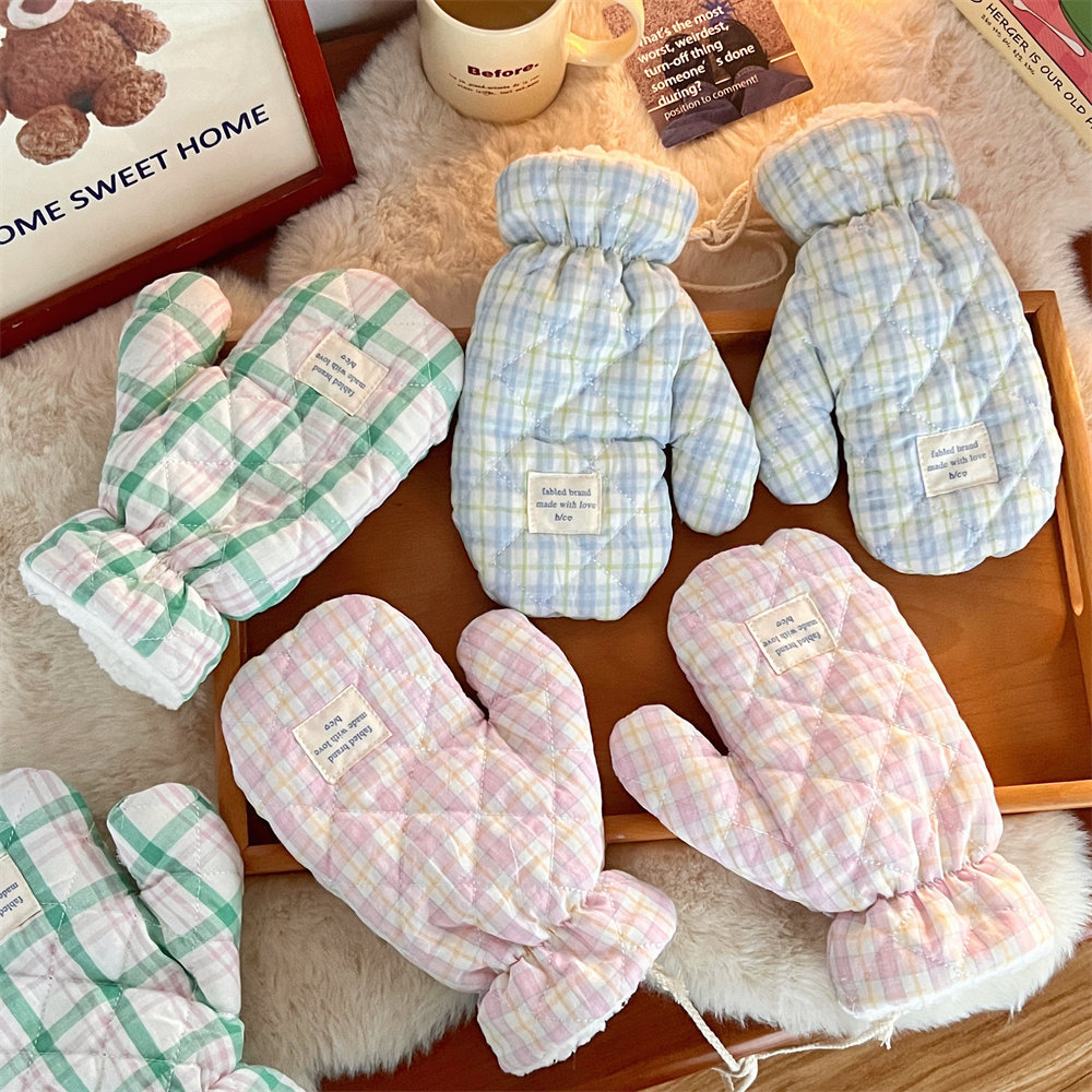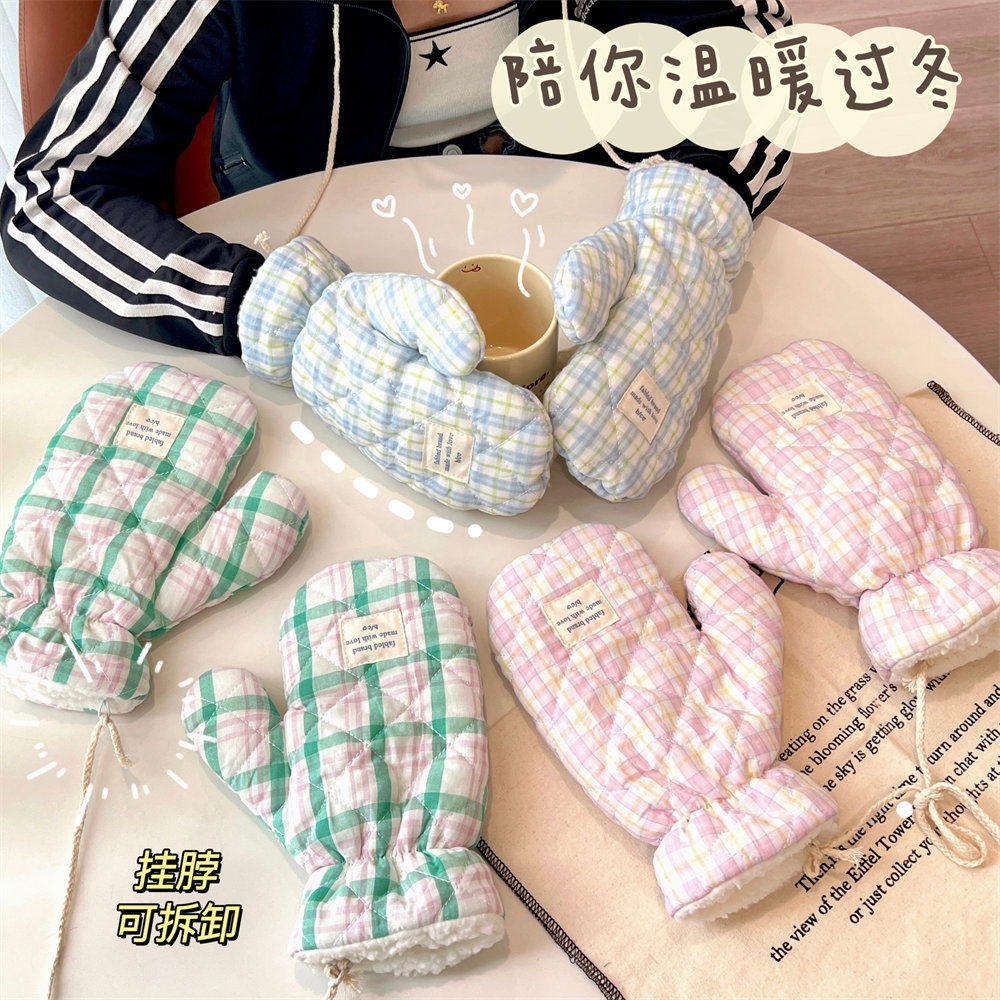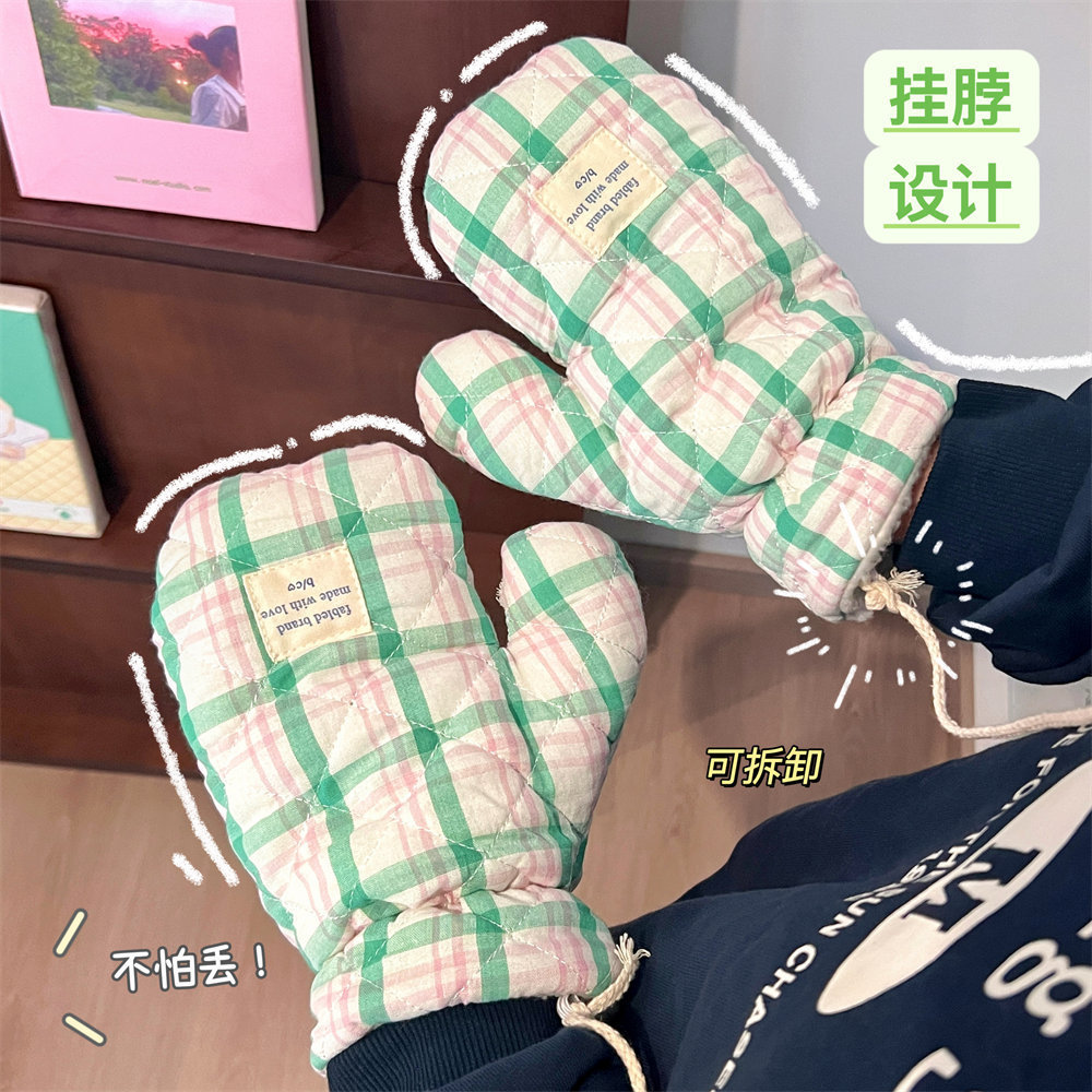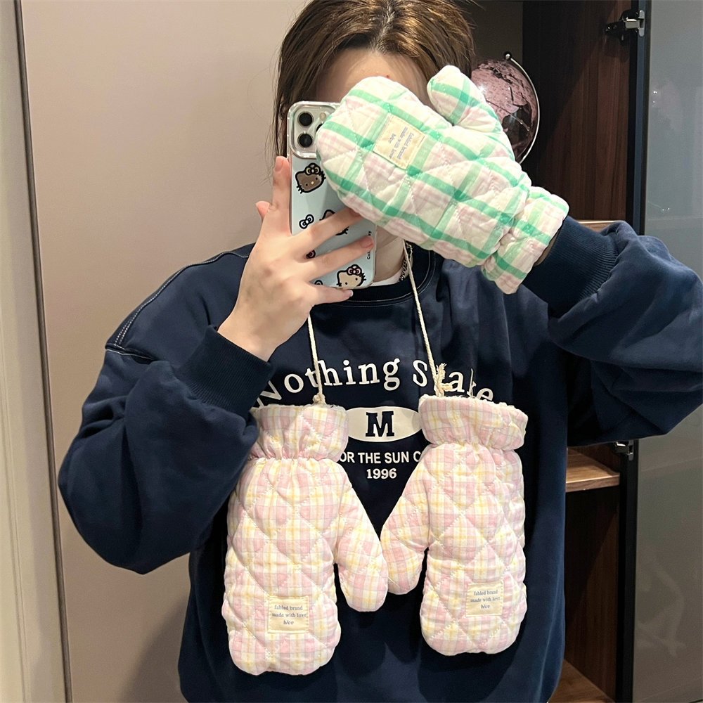 가을과 겨울 봉제 두꺼운 격자 무늬 장갑 여자 방풍 방한 장갑 목 걸이 따뜻한 승마 장갑