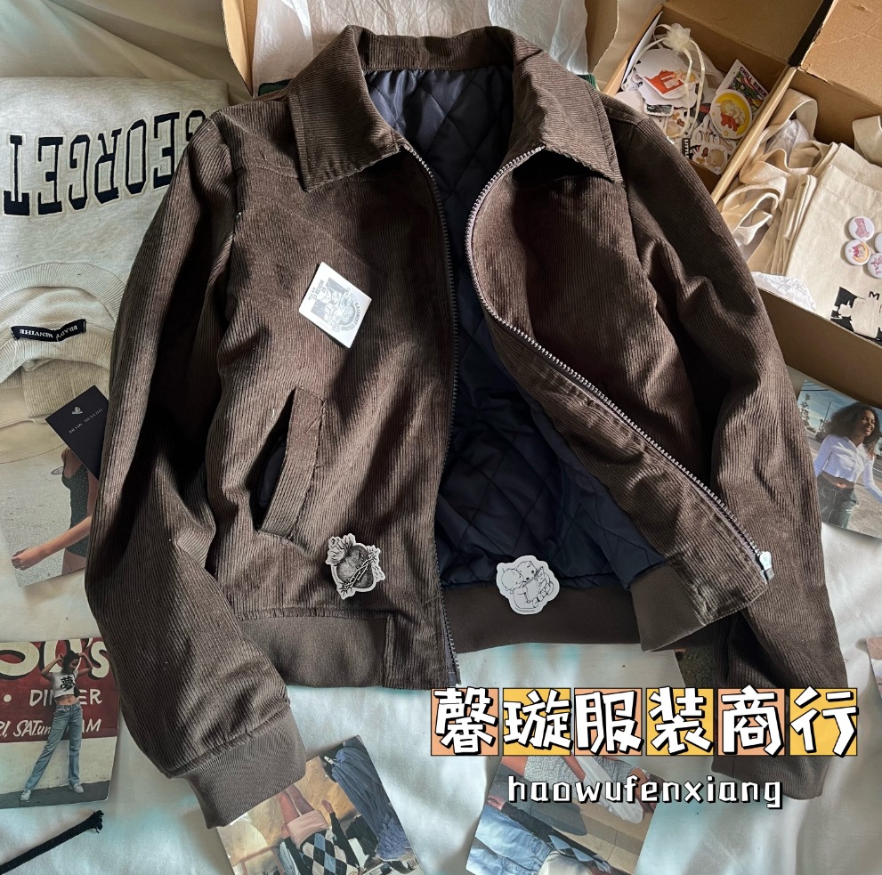 BM 스타일 가을 새로운 미국 스타일 레트로 다크 브라운 코듀로이 퀼트 짧은 코트 여성을위한 모든 일치 라펠 재킷 탑스토어 가기