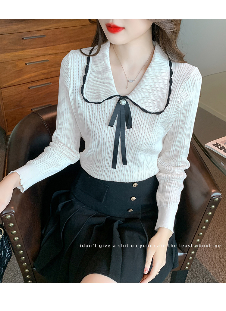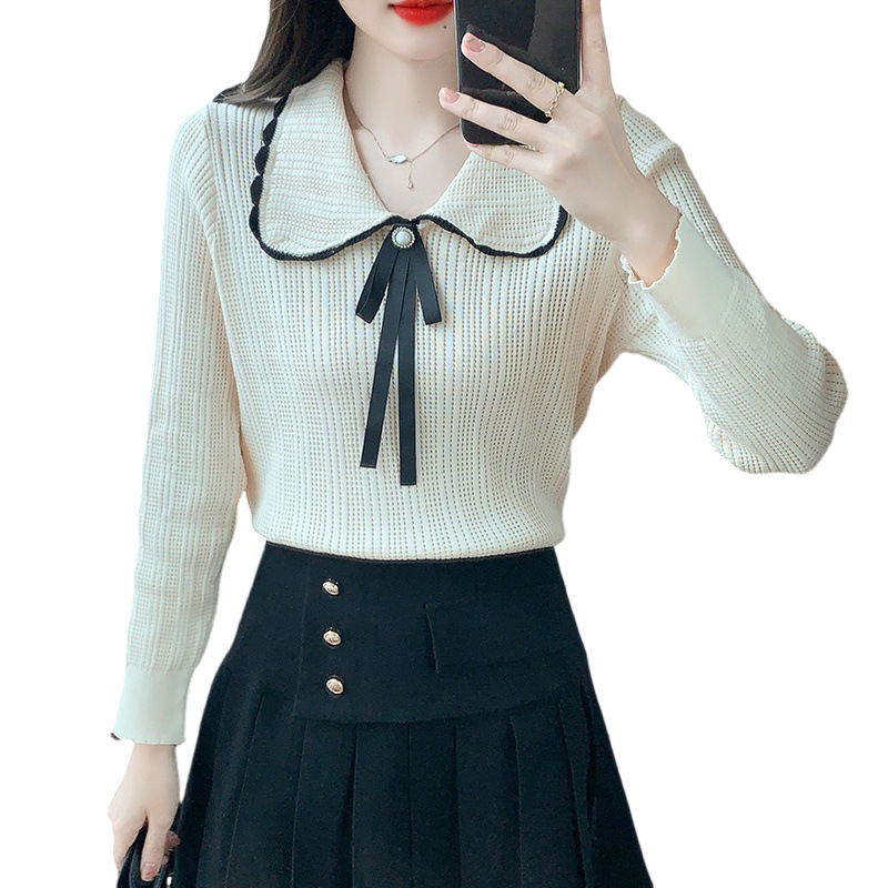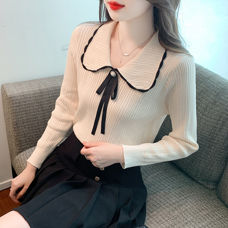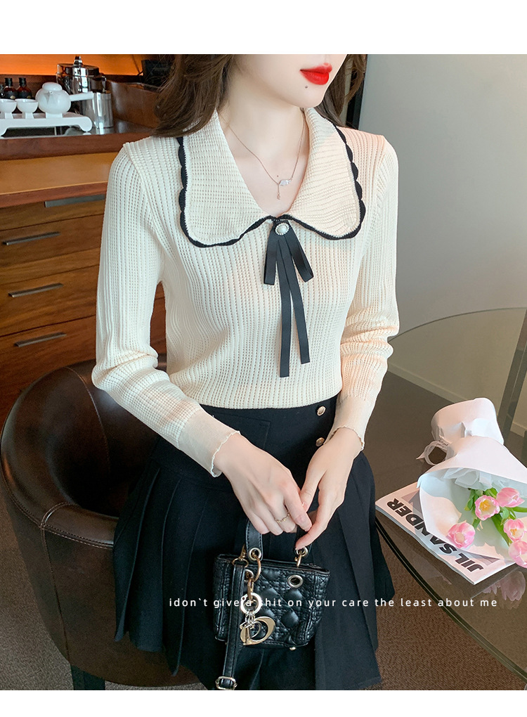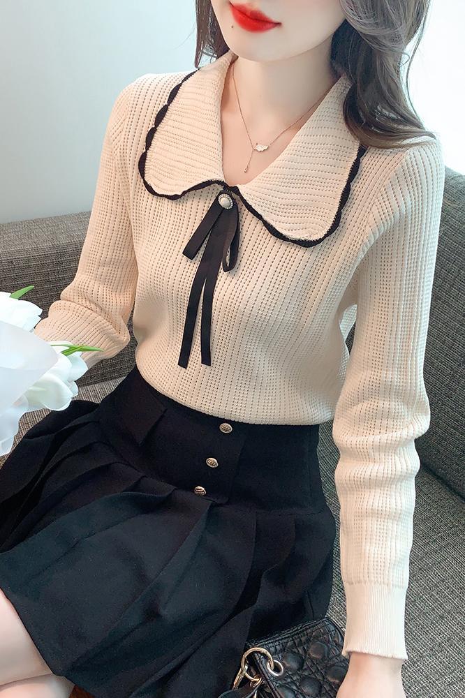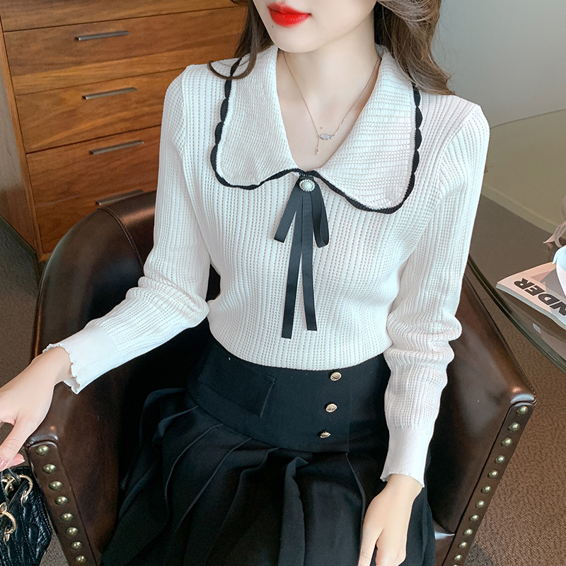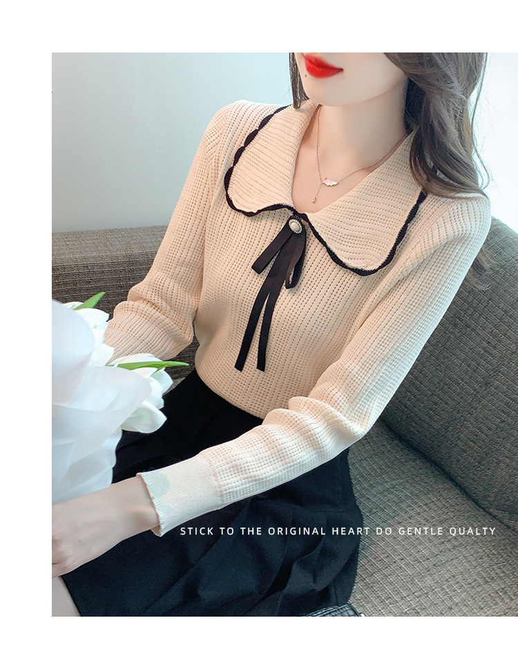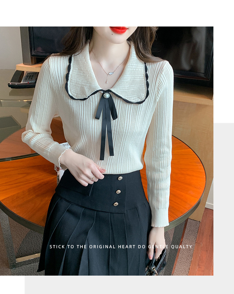 2023 가을과 겨울 새로운 한국 인형 칼라 보우 대비 컬러 니트 스웨터 나이 감소 모든 매치 베이스 셔츠 탑