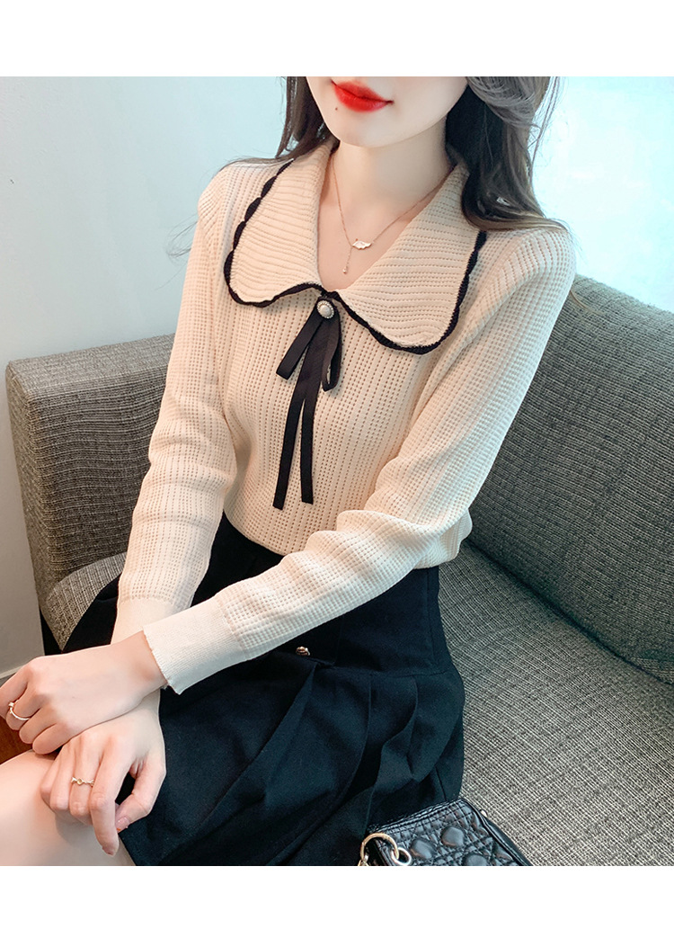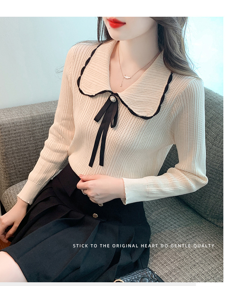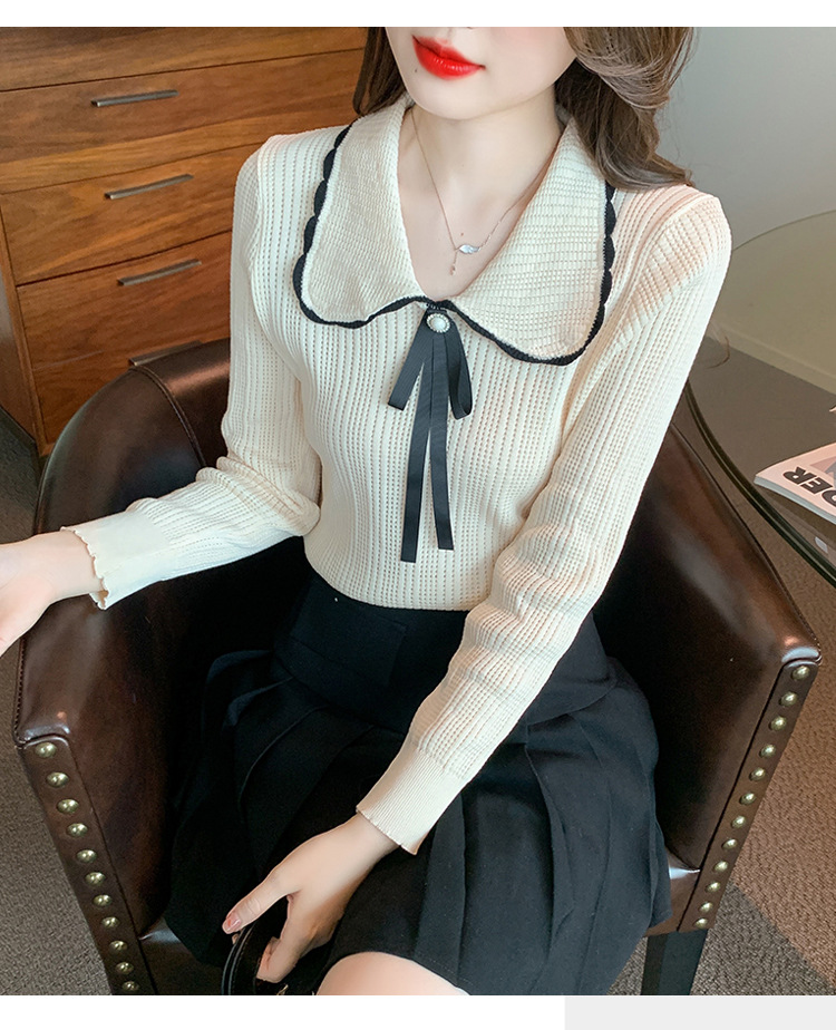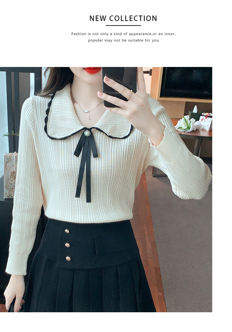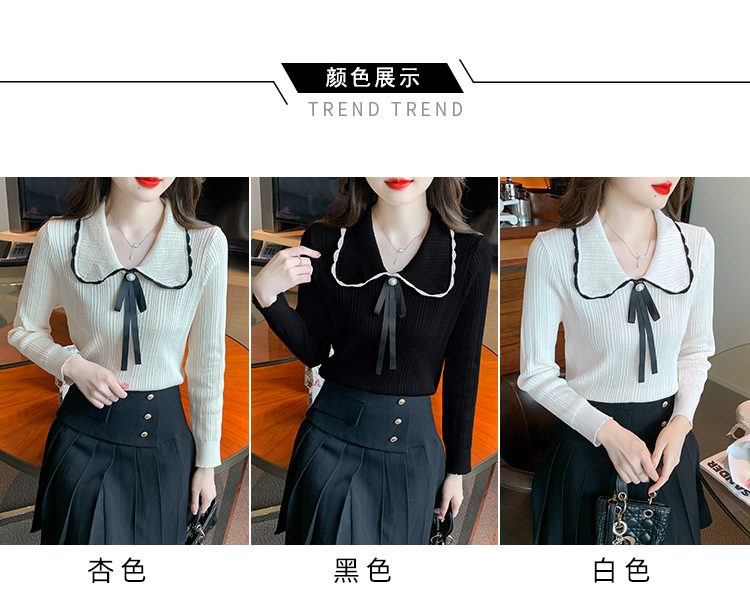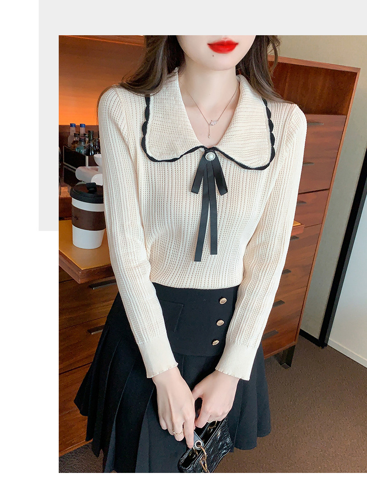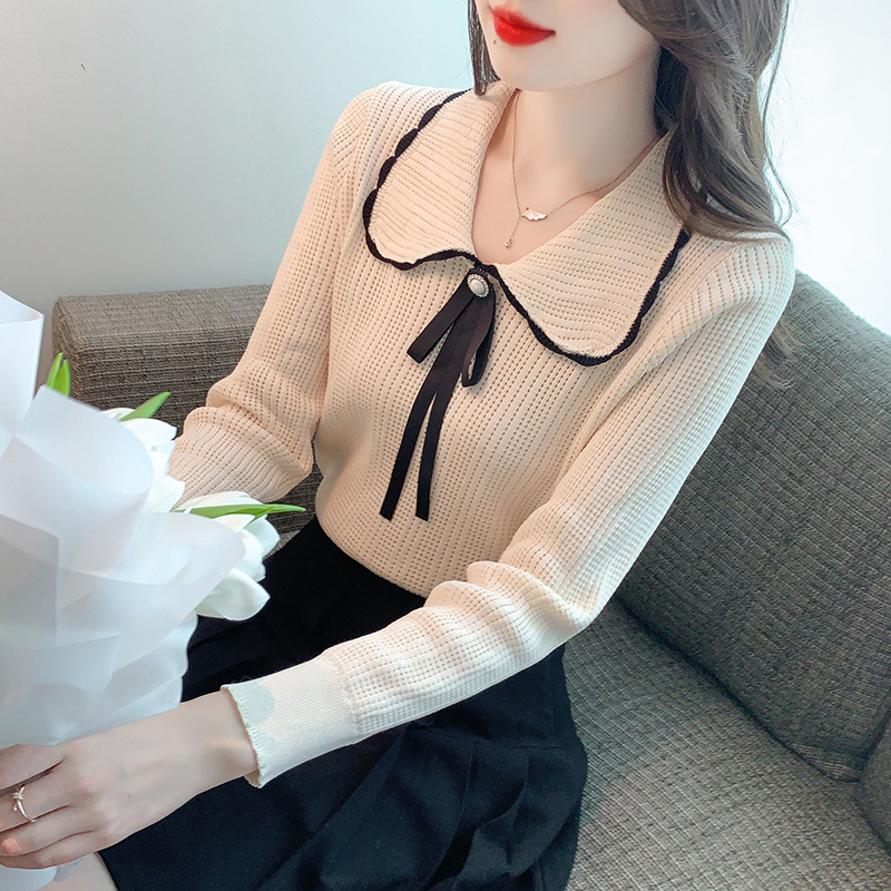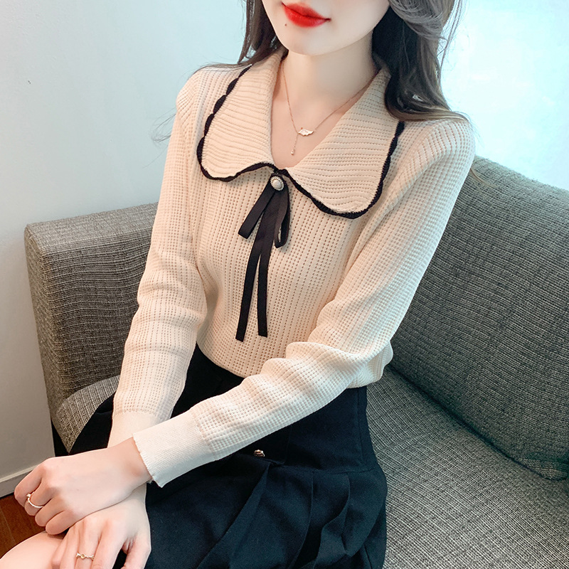 2023 가을과 겨울 새로운 한국 인형 칼라 보우 대비 컬러 니트 스웨터 나이 감소 모든 매치 베이스 셔츠 탑
