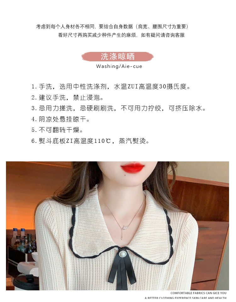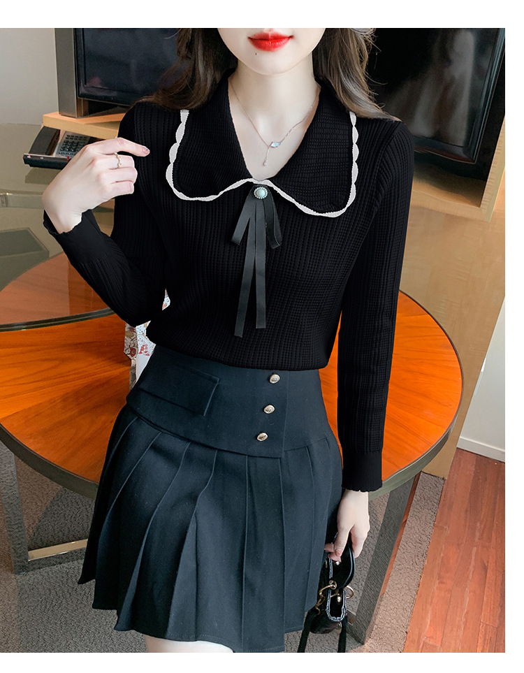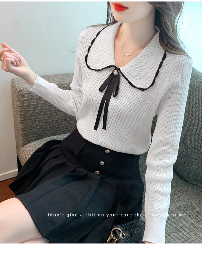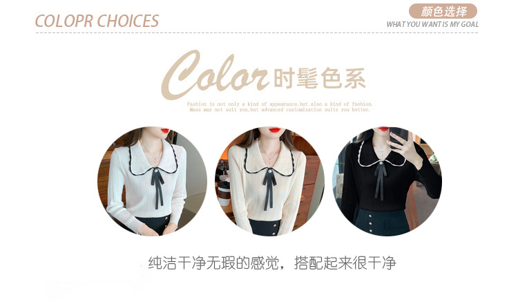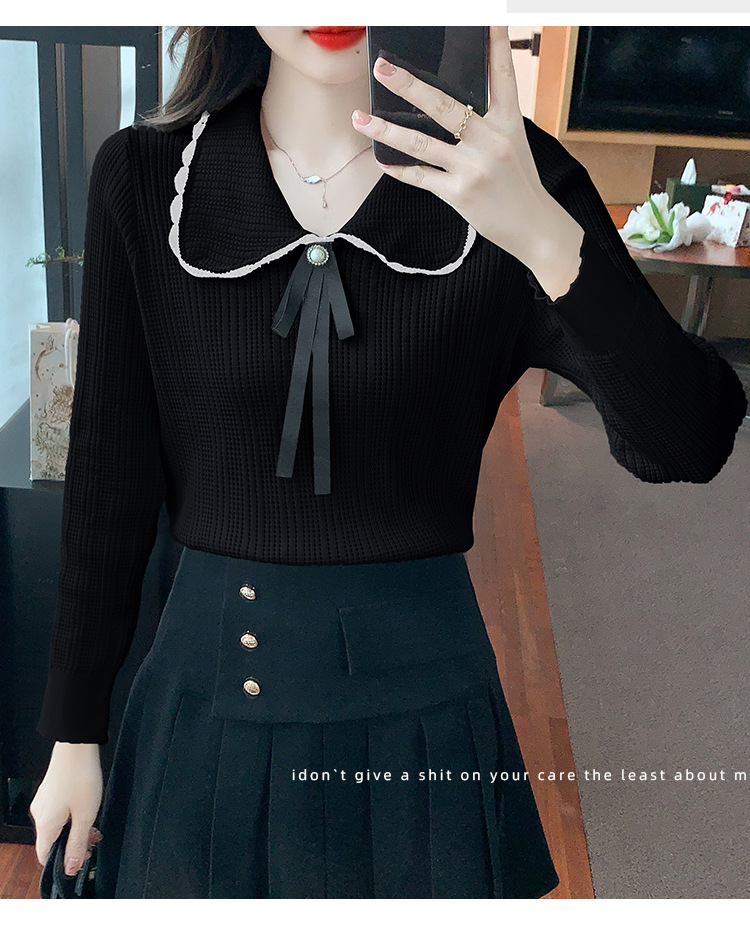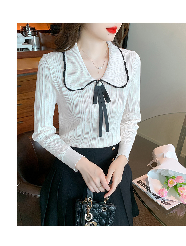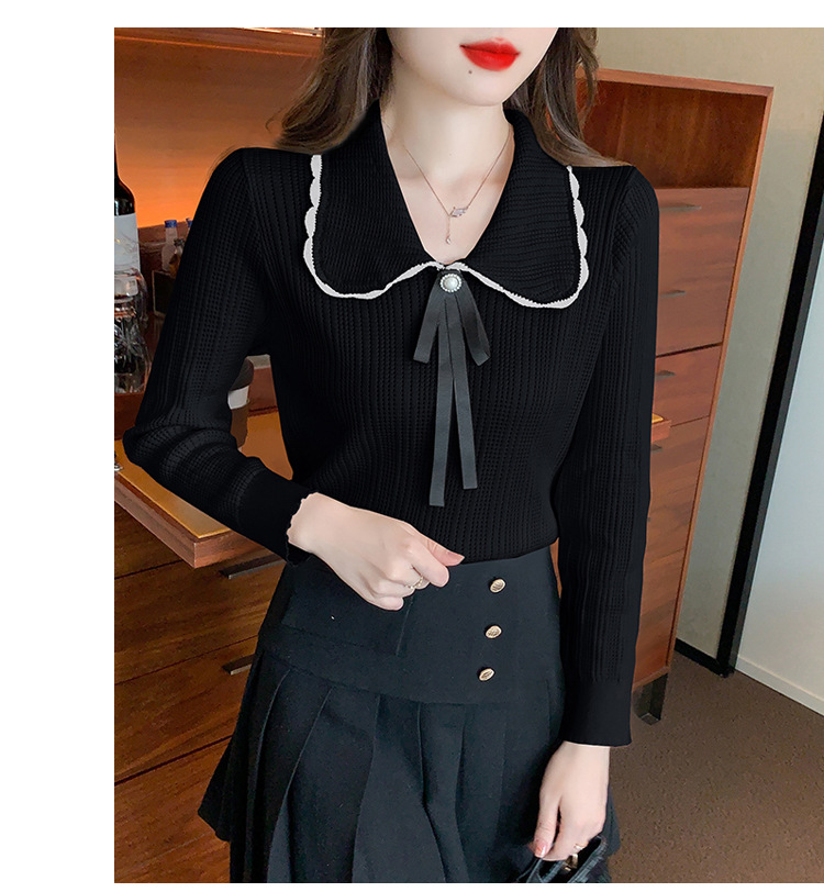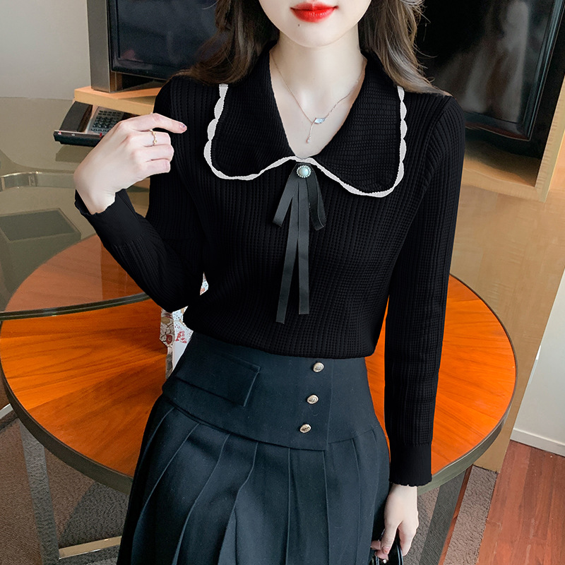 2023 가을과 겨울 새로운 한국 인형 칼라 보우 대비 컬러 니트 스웨터 나이 감소 모든 매치 베이스 셔츠 탑