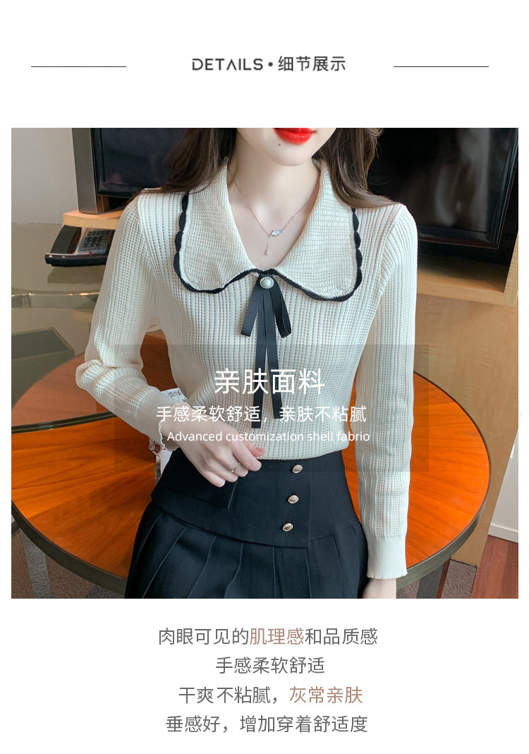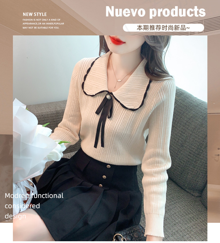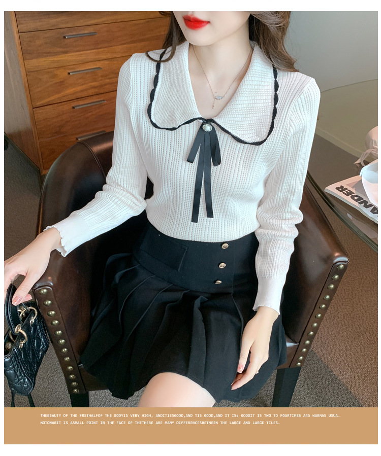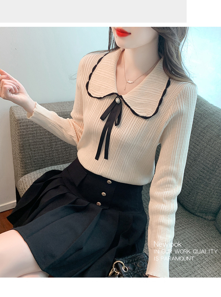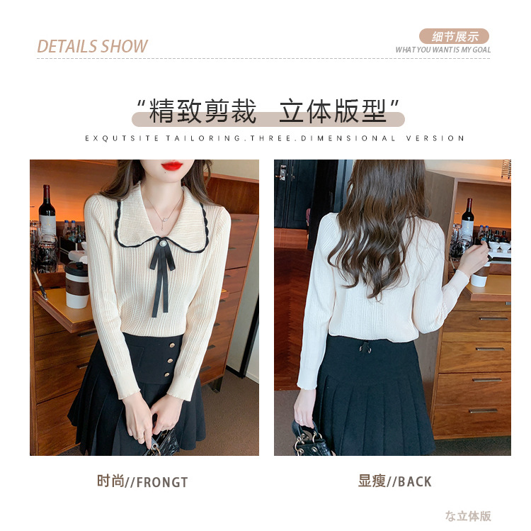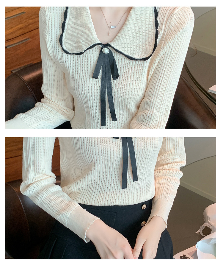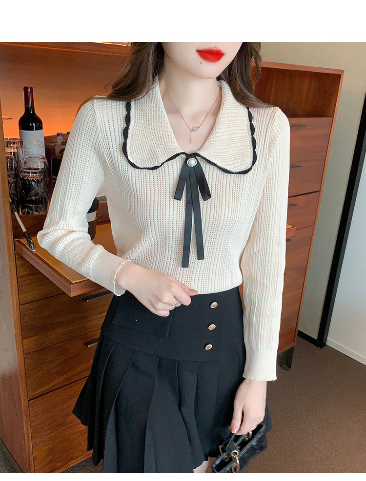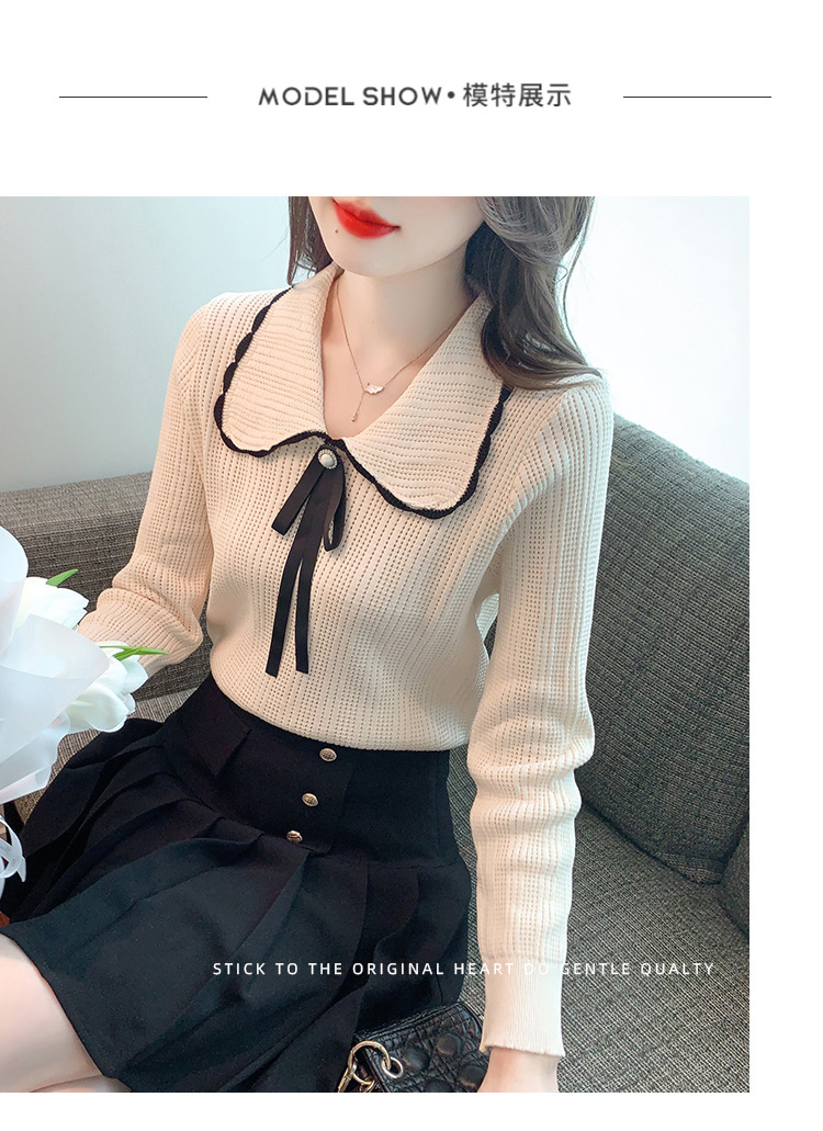 2023 가을과 겨울 새로운 한국 인형 칼라 보우 대비 컬러 니트 스웨터 나이 감소 모든 매치 베이스 셔츠 탑스토어 가기
