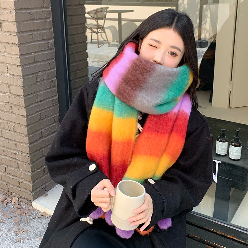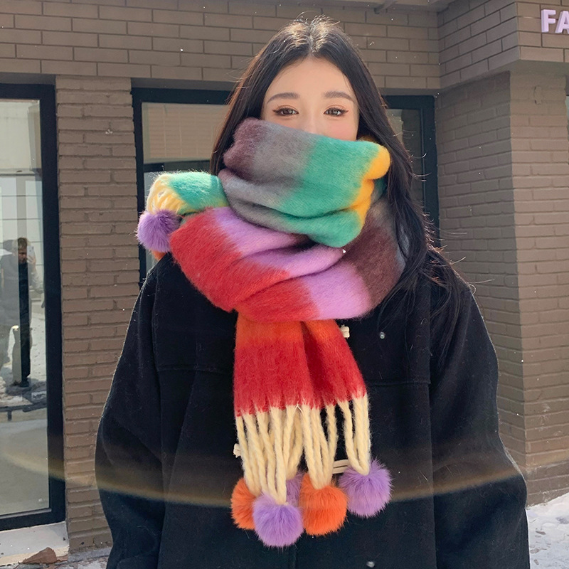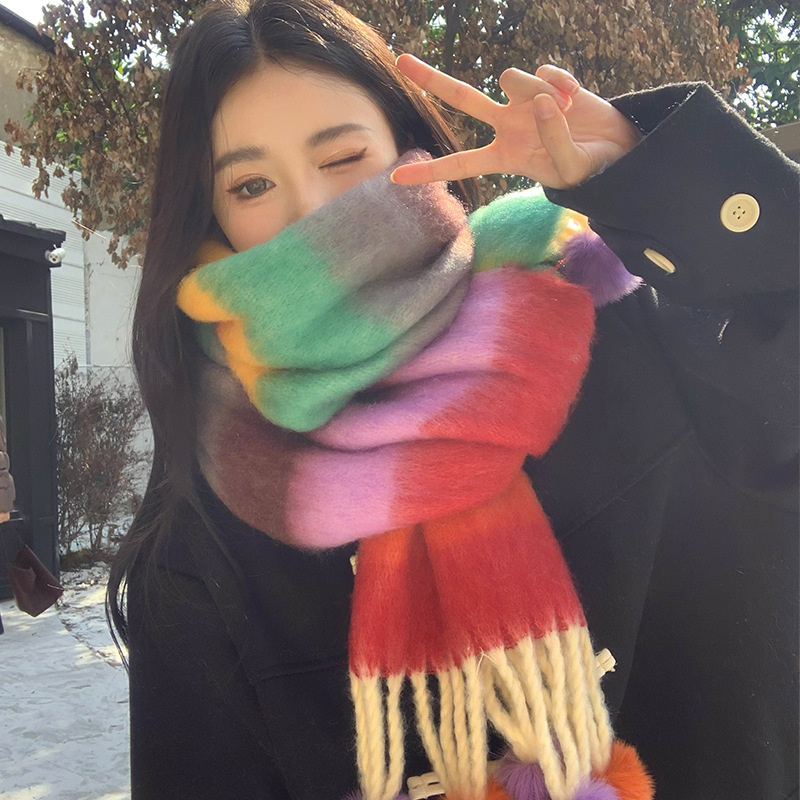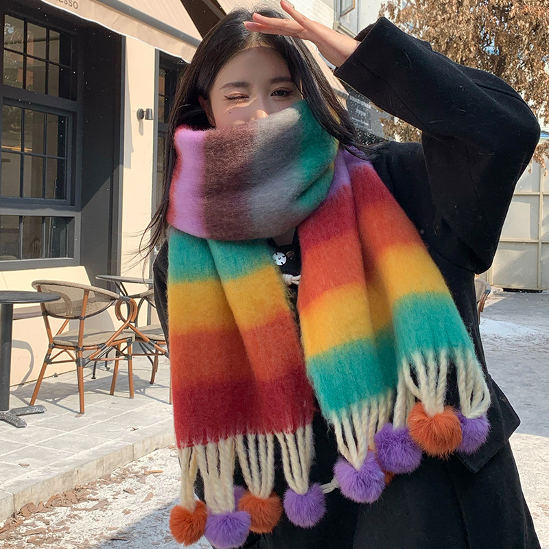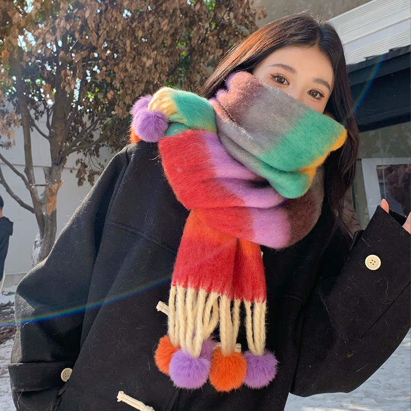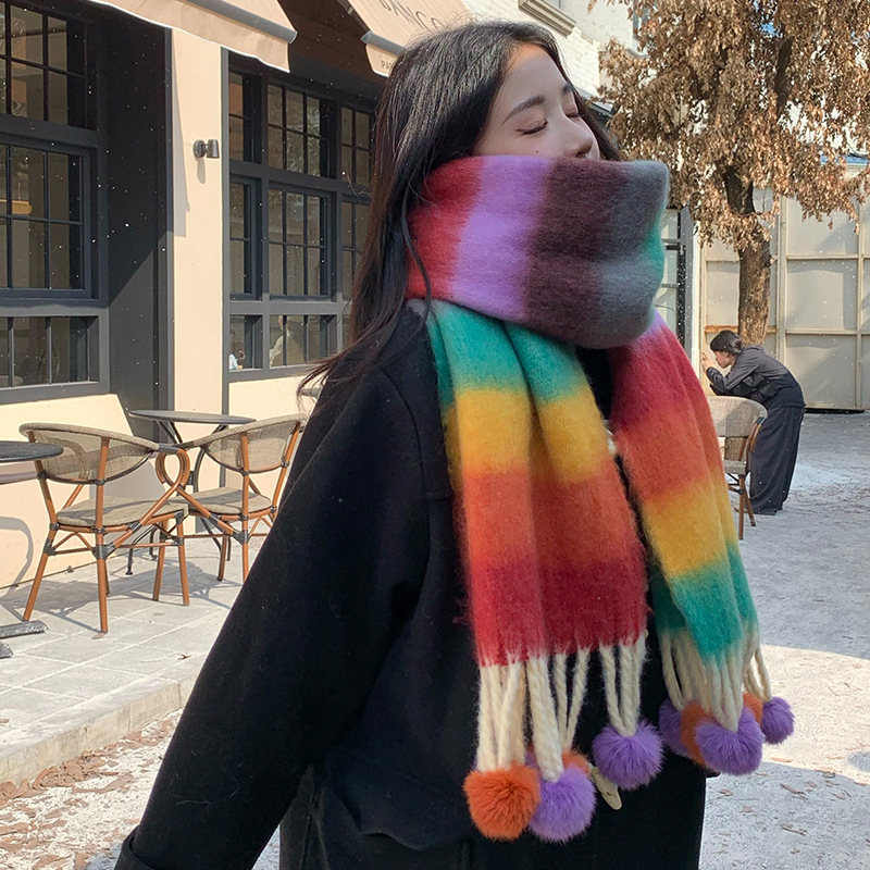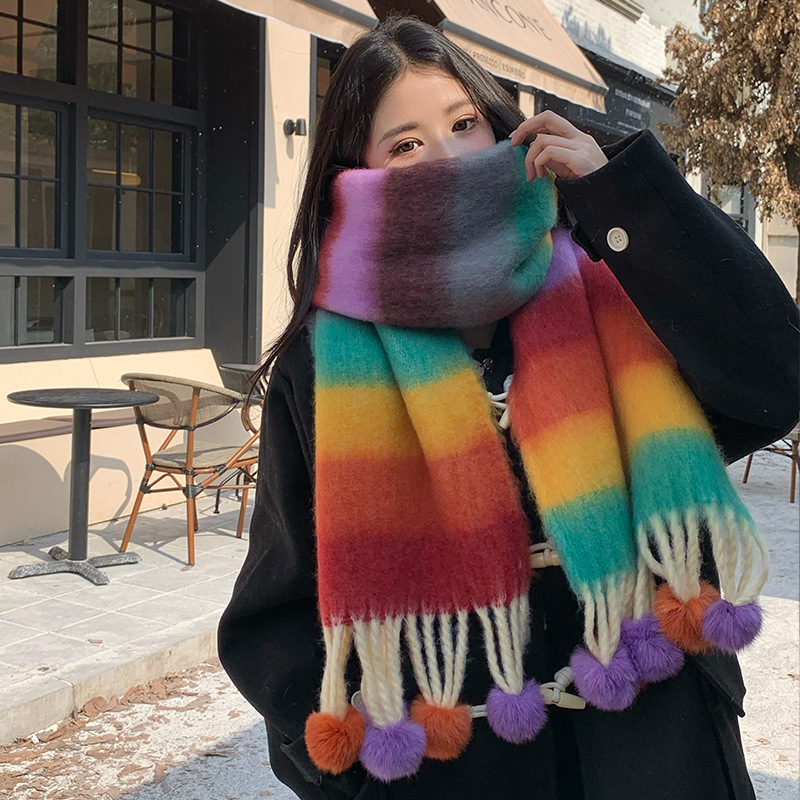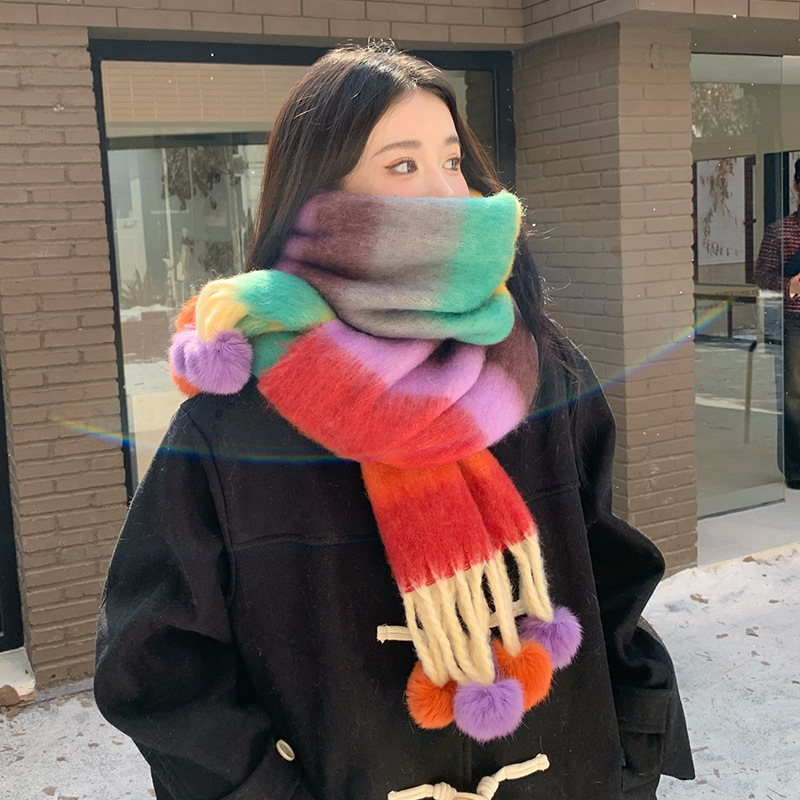 겨울 패션 아웃도어 모든 매치 따뜻한 스카프 캐주얼 쿨 레인보우 헤어 볼 술 컬러 매칭 목 보호 방한 스카프스토어 가기