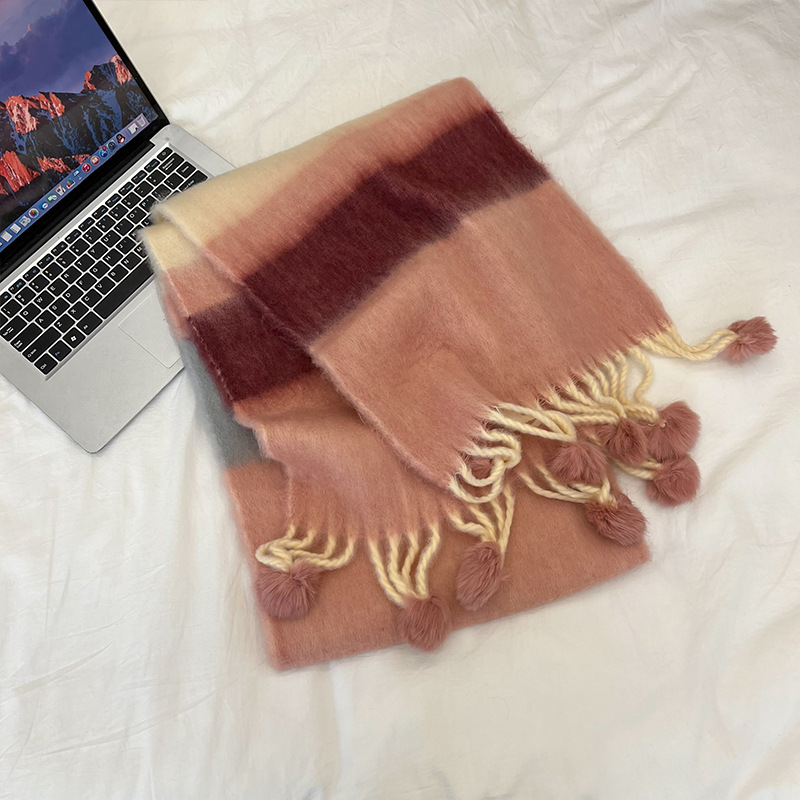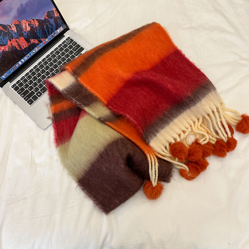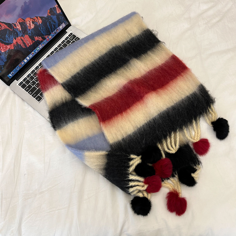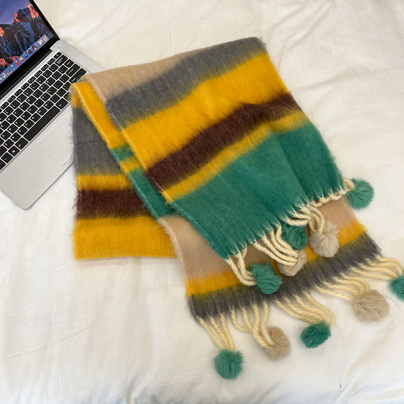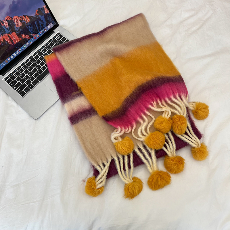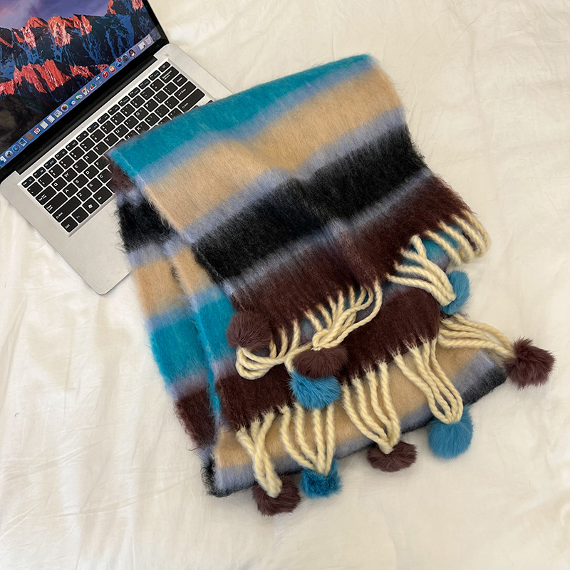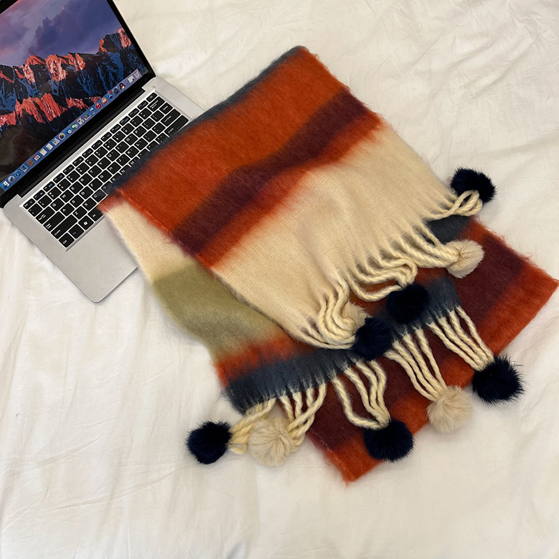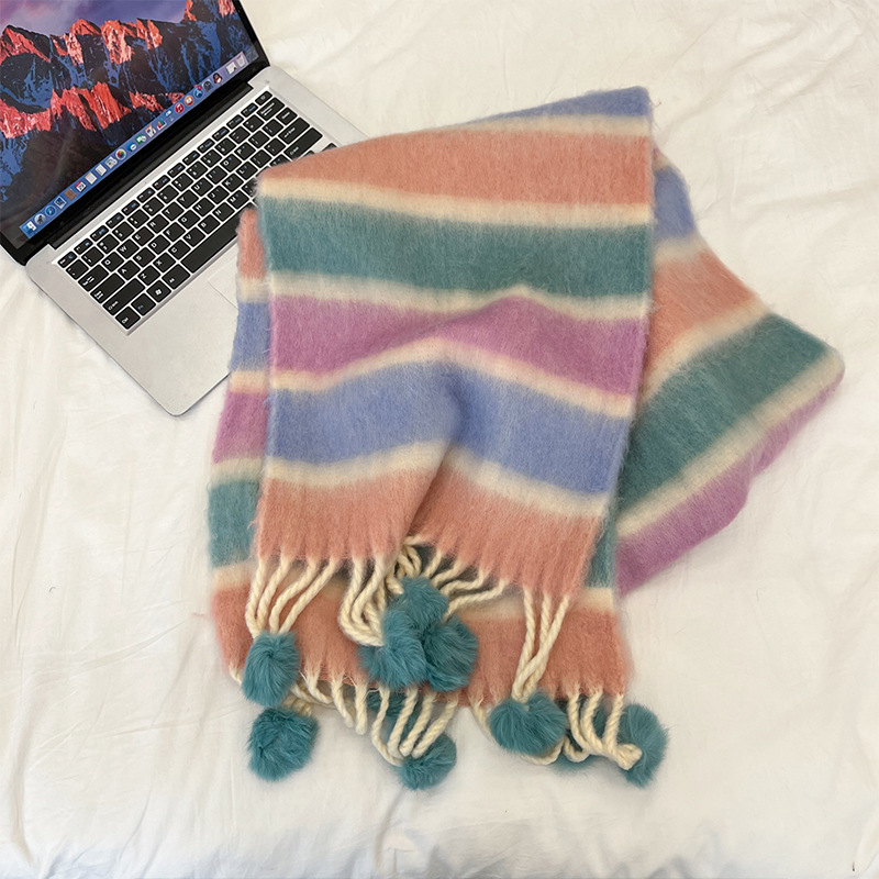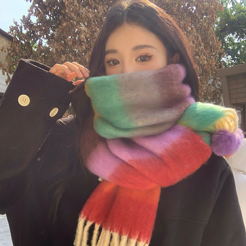 겨울 패션 아웃도어 모든 매치 따뜻한 스카프 캐주얼 쿨 레인보우 헤어 볼 술 컬러 매칭 목 보호 방한 스카프스토어 가기