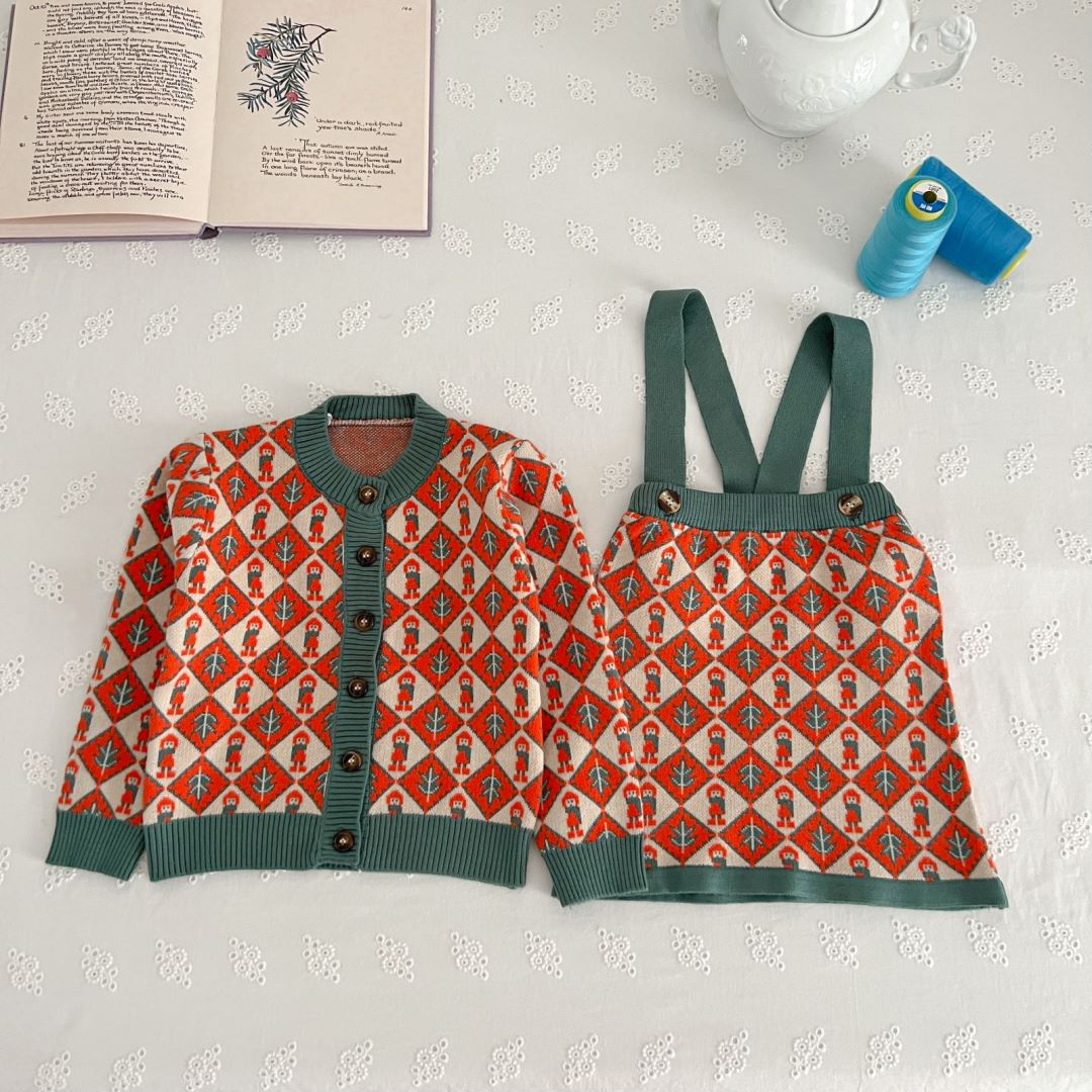 여아 2023 가을과 겨울 새로운 웨스턴 스타일 트렌디 아기의 니트 가디건 탑 스웨터 스트랩 스커트 소녀를위한 투피스 세트스토어 가기