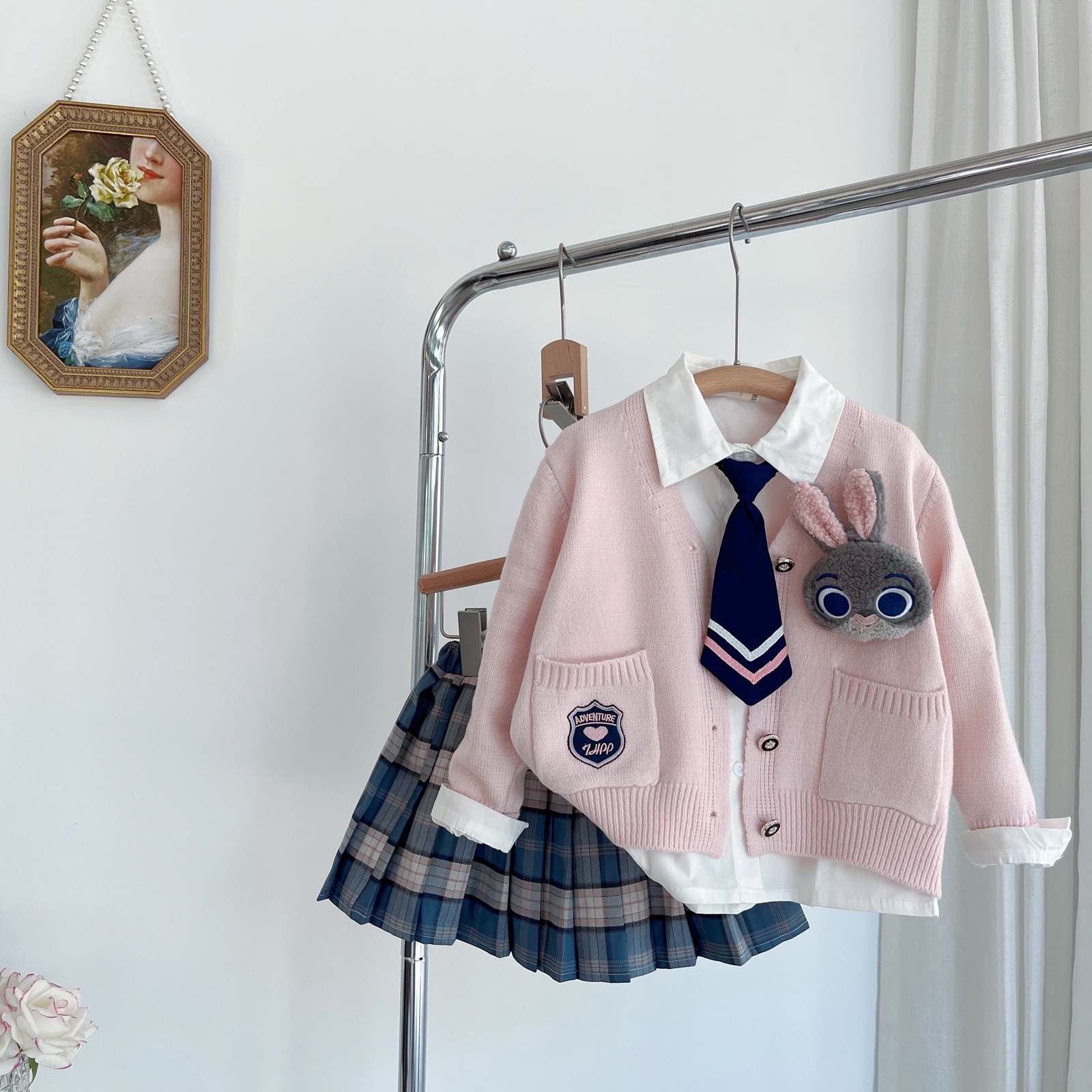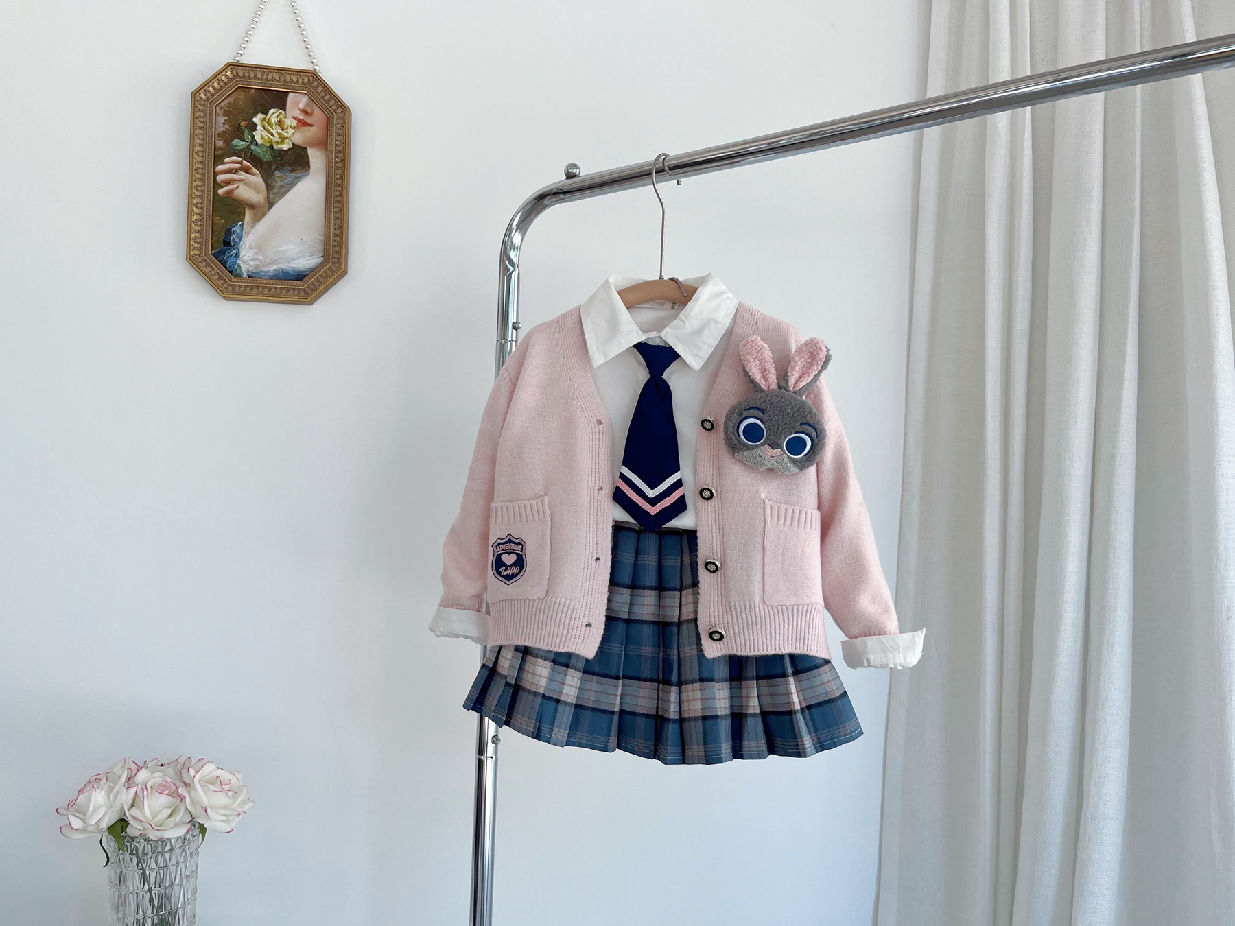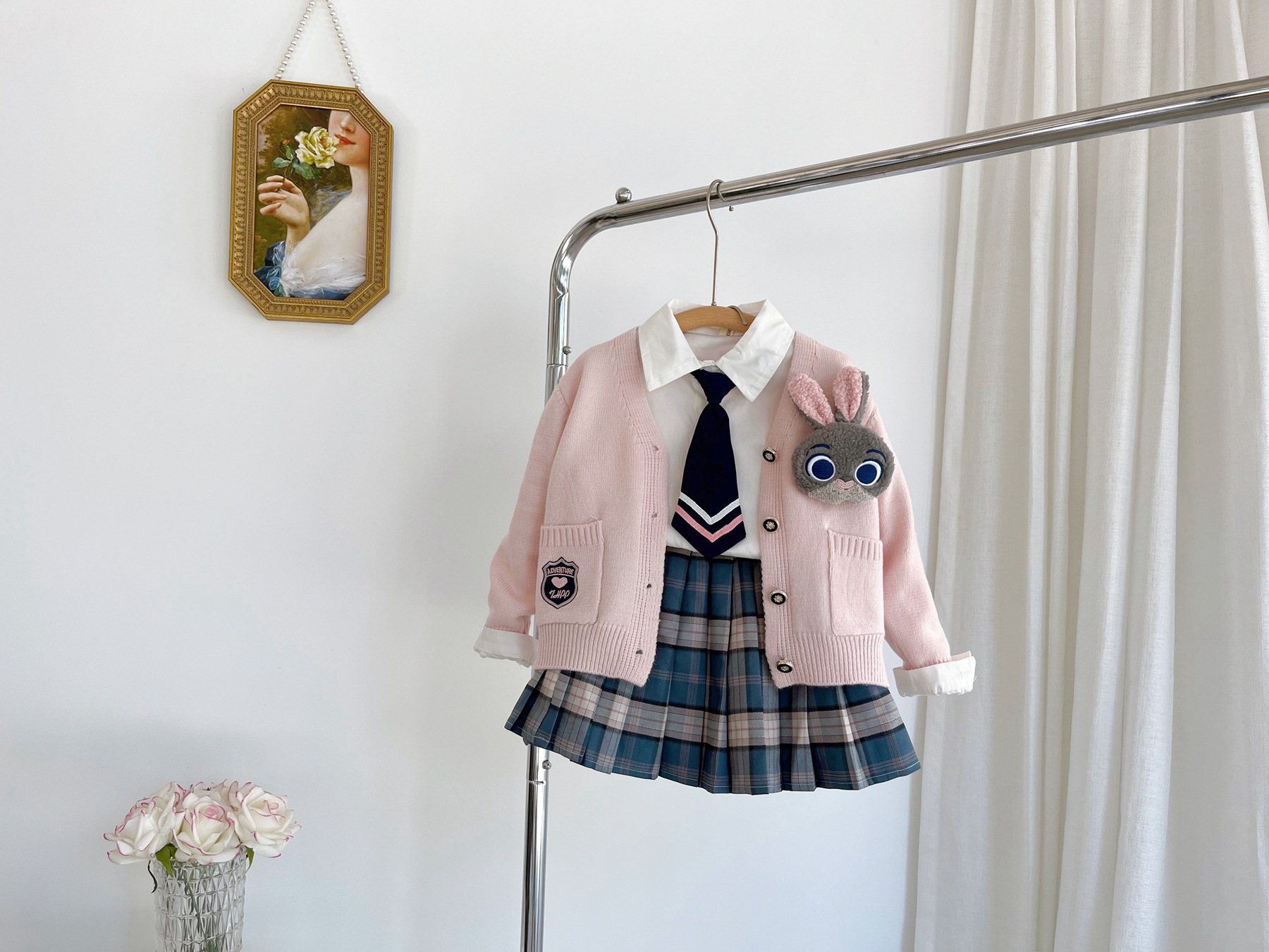 대학 스타일 JK 세트 소녀 가을과 겨울 토끼 유니폼 니트 카디건 화이트 셔츠 격자 무늬 주름